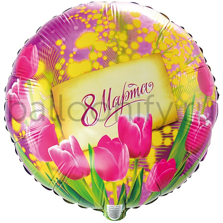 Фольгированная фигура, круг, РУС 8 МАРТА Тюльпаны и мимозы,18"/46СМ