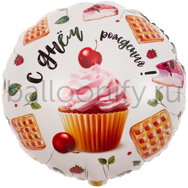 Фольгированная фигура, круг, РУС ДР Капкейк с вишенкой,18"/46СМ
