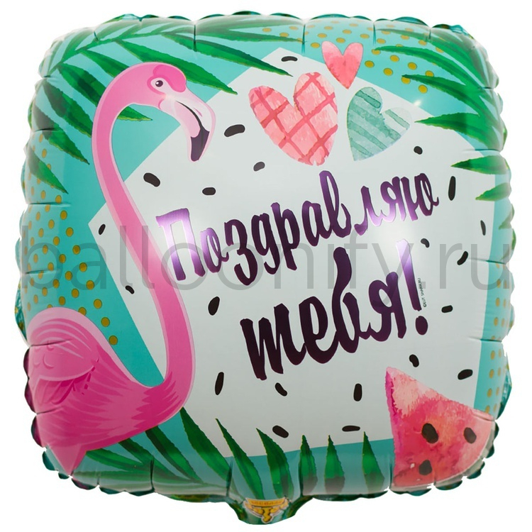 Фольгированная фигура, квадрат, РУС ПОЗДРАВЛЯЮ ТЕБЯ Фламинго 18"/46СМ