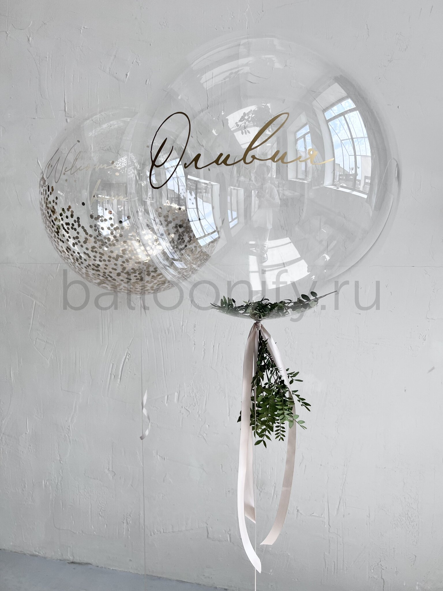 Набор из двух прозрачных шаров «Bubble» — это изысканное украшение, выполненное в минималистичном стиле. Каждый шар украшен индивидуальной надписью, что придаёт им особую значимость. Один из шаров наполнен блестящей россыпью золотых конфетти, создающей эффект сияния и праздничного настроения. Второй шар дополнен лентой с веточкой зелени, которая добавляет природной свежести и утончённости. Этот набор станет идеальным украшением для встречи нового члена семьи из роддома, подчёркивая радость и тепло этого события.