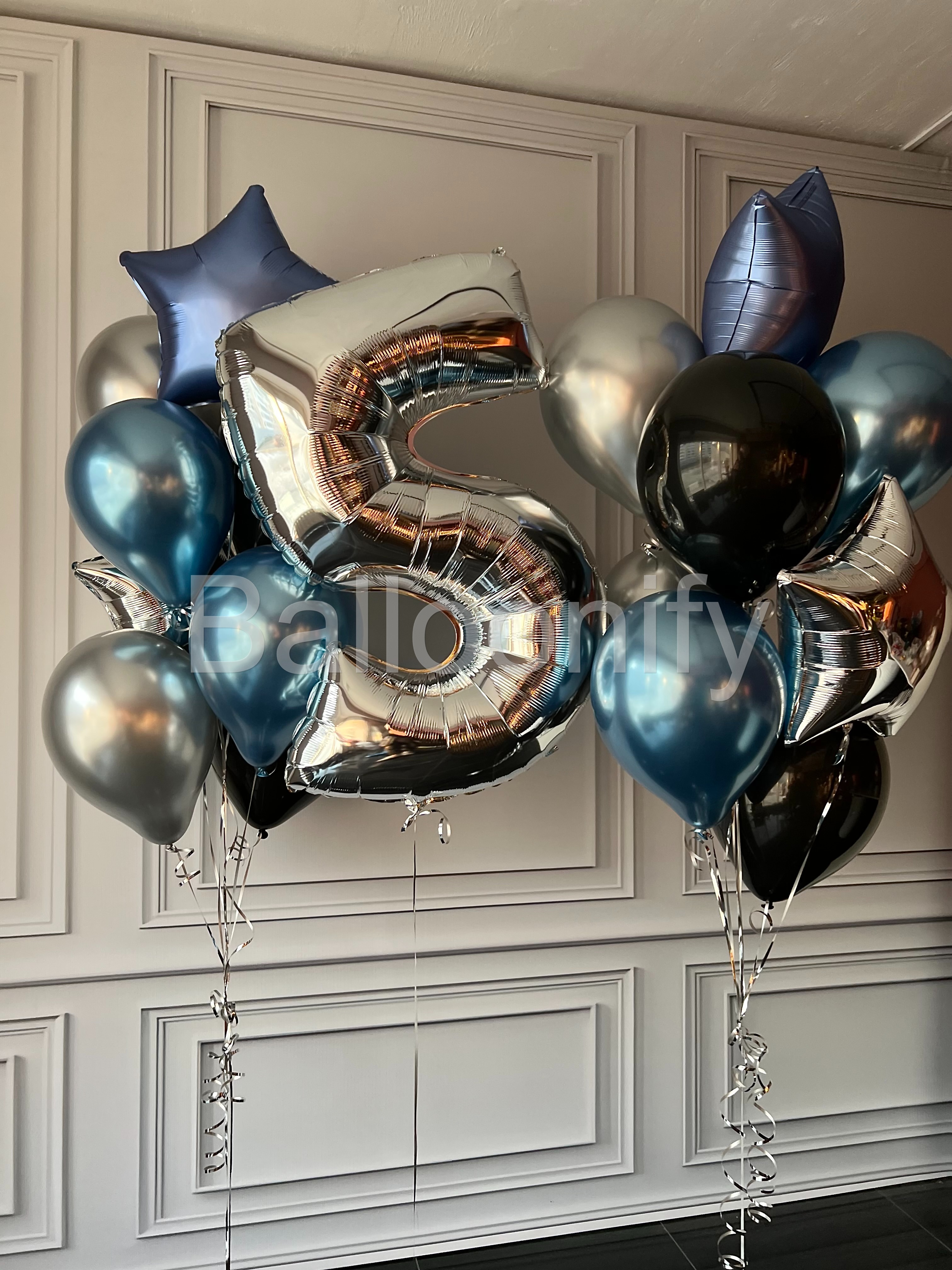 Перед вами роскошная композиция из воздушных шаров, созданная для яркого празднования! Центром композиции является большой блестящий шар в форме цифры «5» — идеальный акцент для празднования пятого дня рождения. Вокруг цифры собраны шары разных форм и оттенков: хромированные синие, серебристые и чёрные шары, а также шары в форме звезды. Металлический блеск шаров придаёт ансамблю элегантность и торжественность, а разнообразие форм делает композицию динамичной и привлекательной. Такая композиция станет настоящим украшением любого праздника — будь то детский день рождения, семейный юбилей или тематическое мероприятие.
