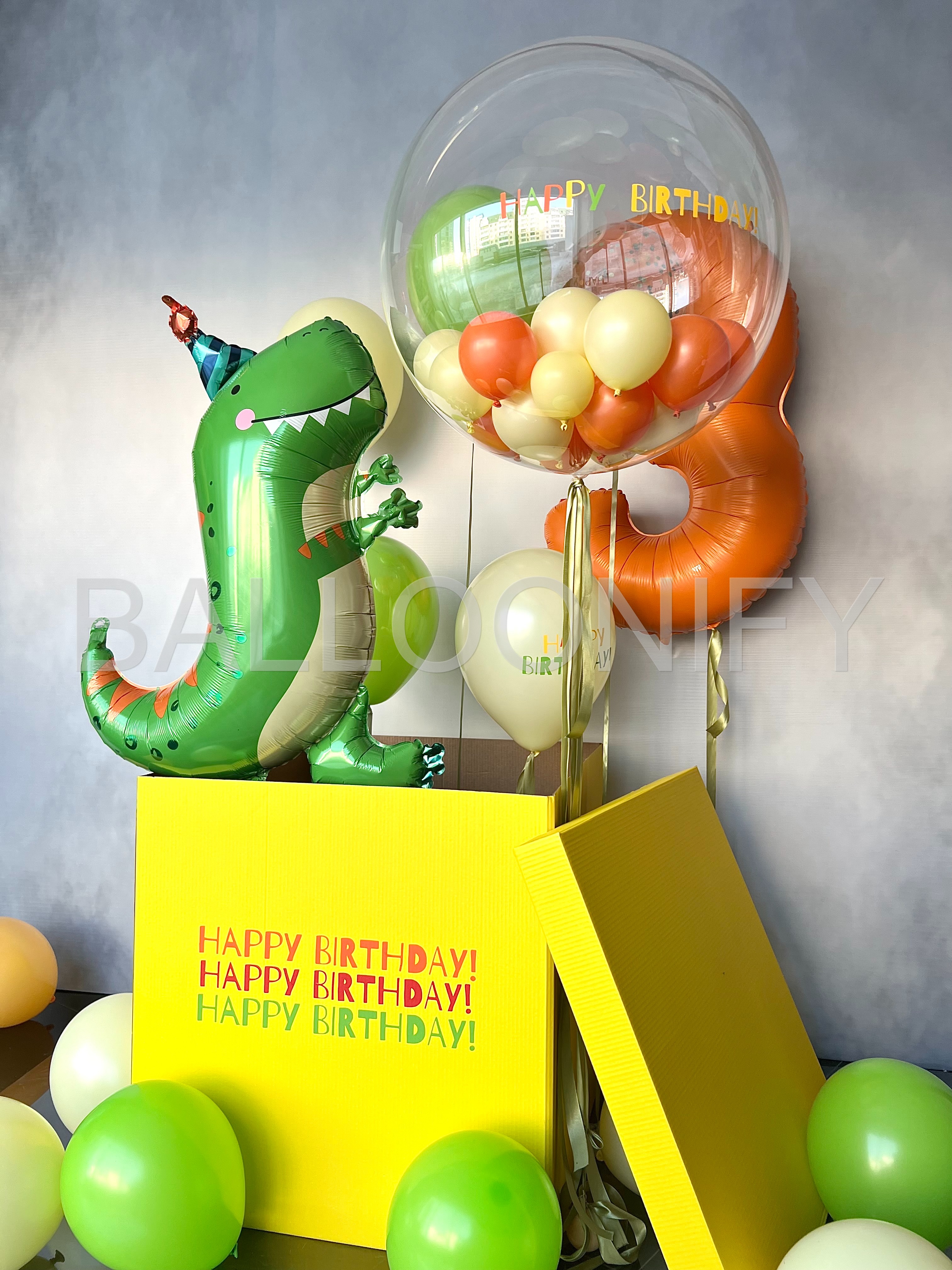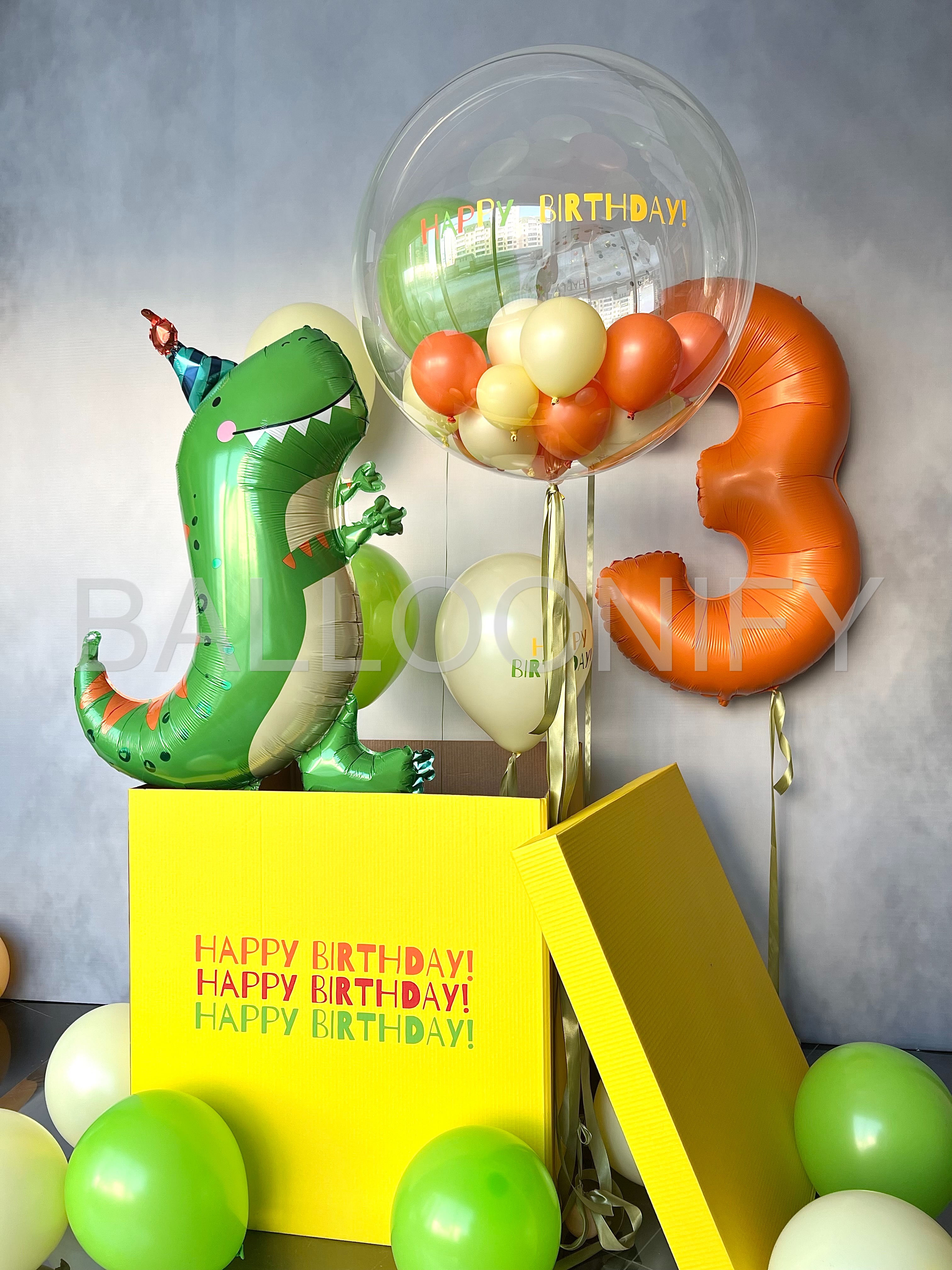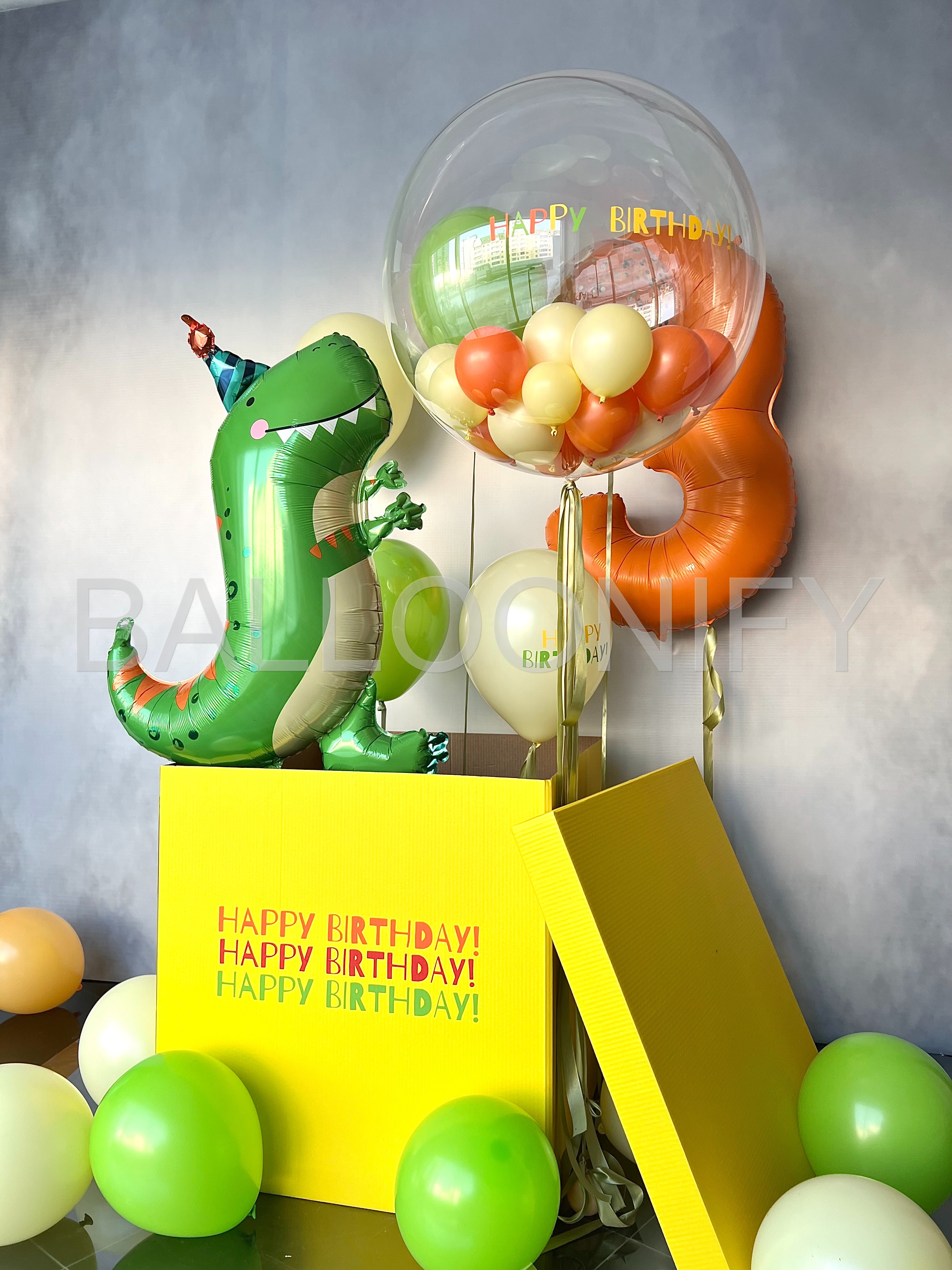 Яркая композиция для детского дня рождения: весёлый фольгированный динозавр в шапочке, огромная прозрачная сфера с мини-шариками и надписью «Happy Birthday», оранжевая цифра «3» и жёлтая коробка с повторяющейся надписью «Happy Birthday!». Дополнена россыпью зелёных и кремовых шаров. Создаёт праздничное настроение и станет идеальной фотозоной! 🌟