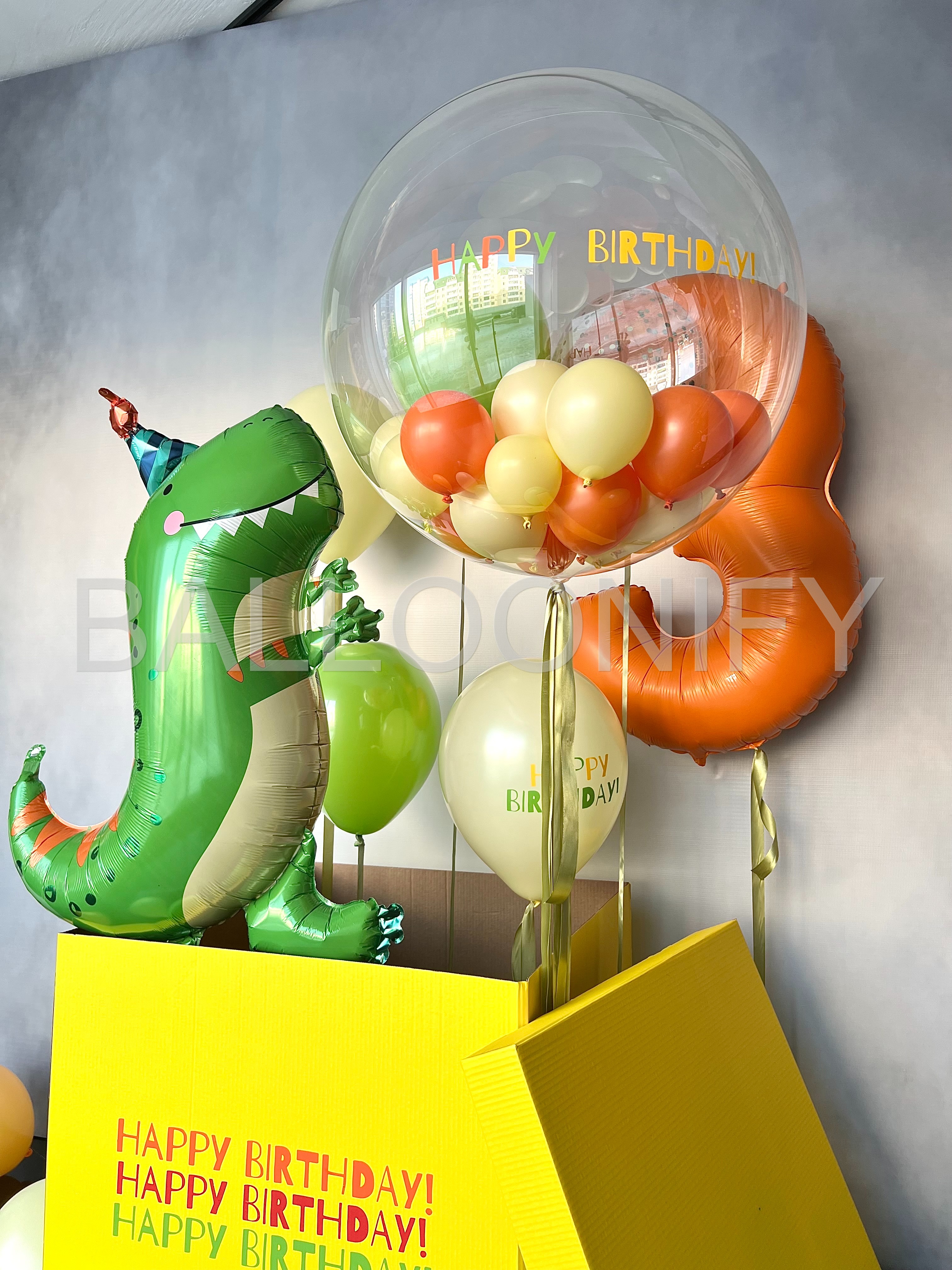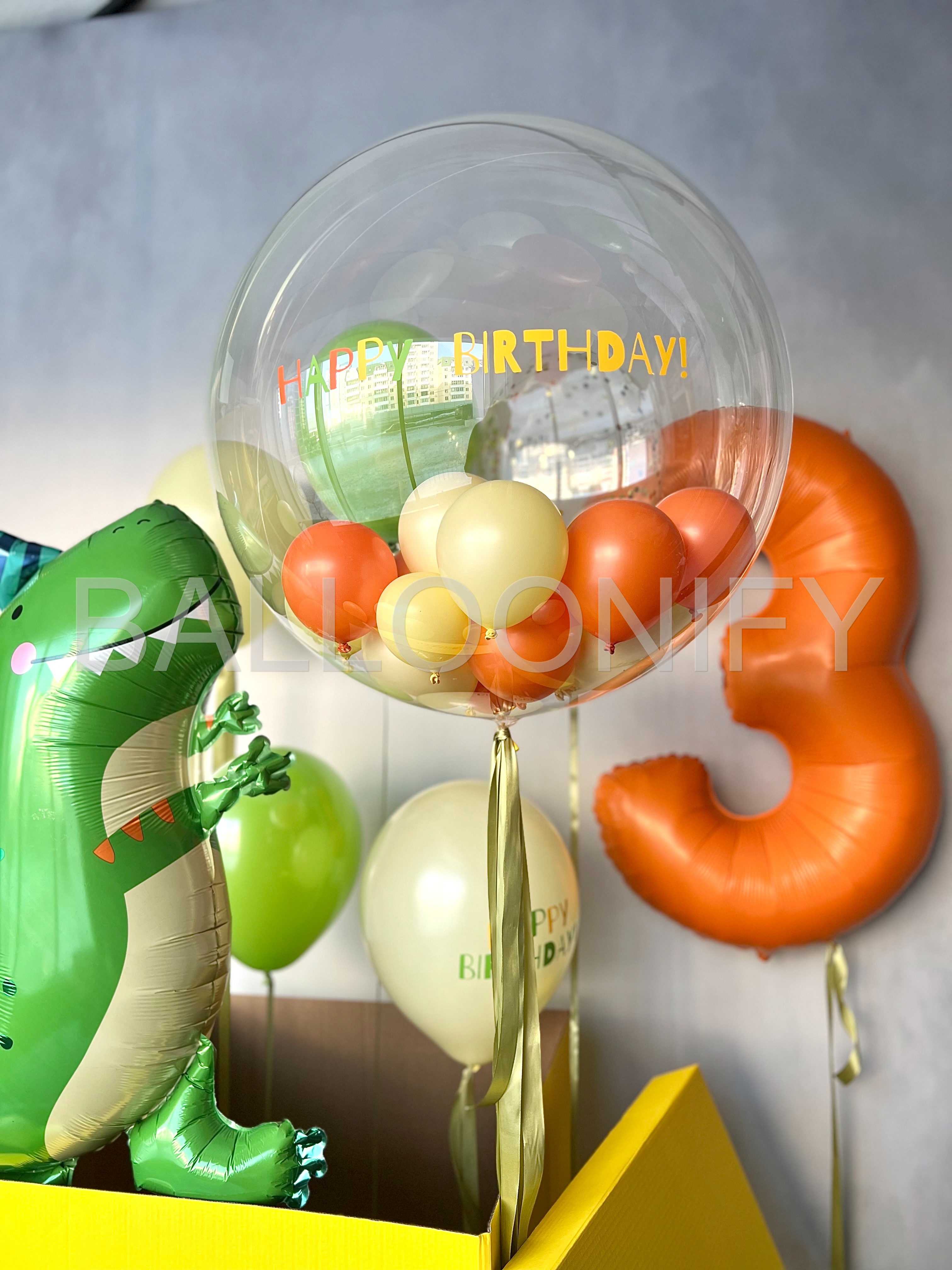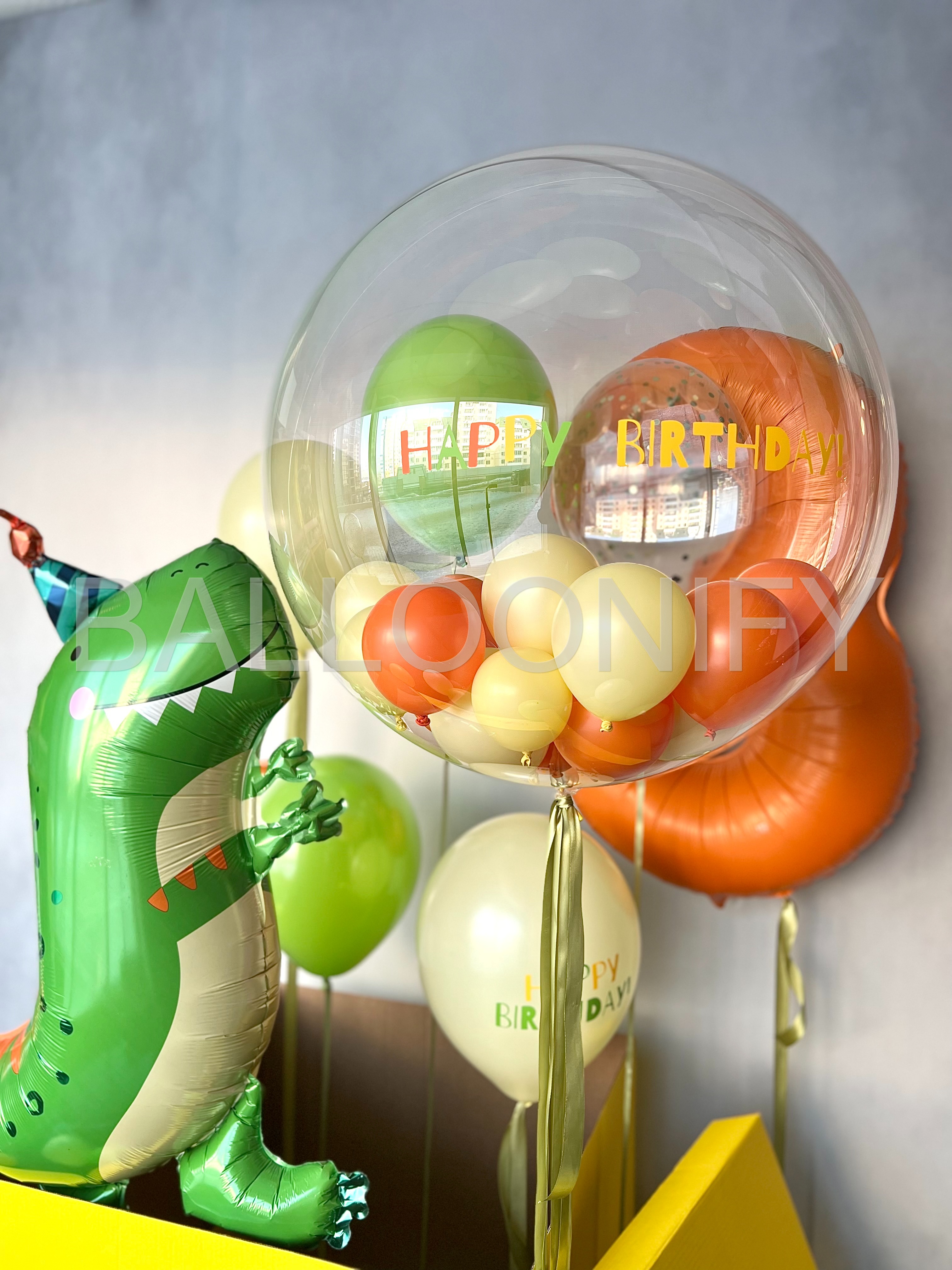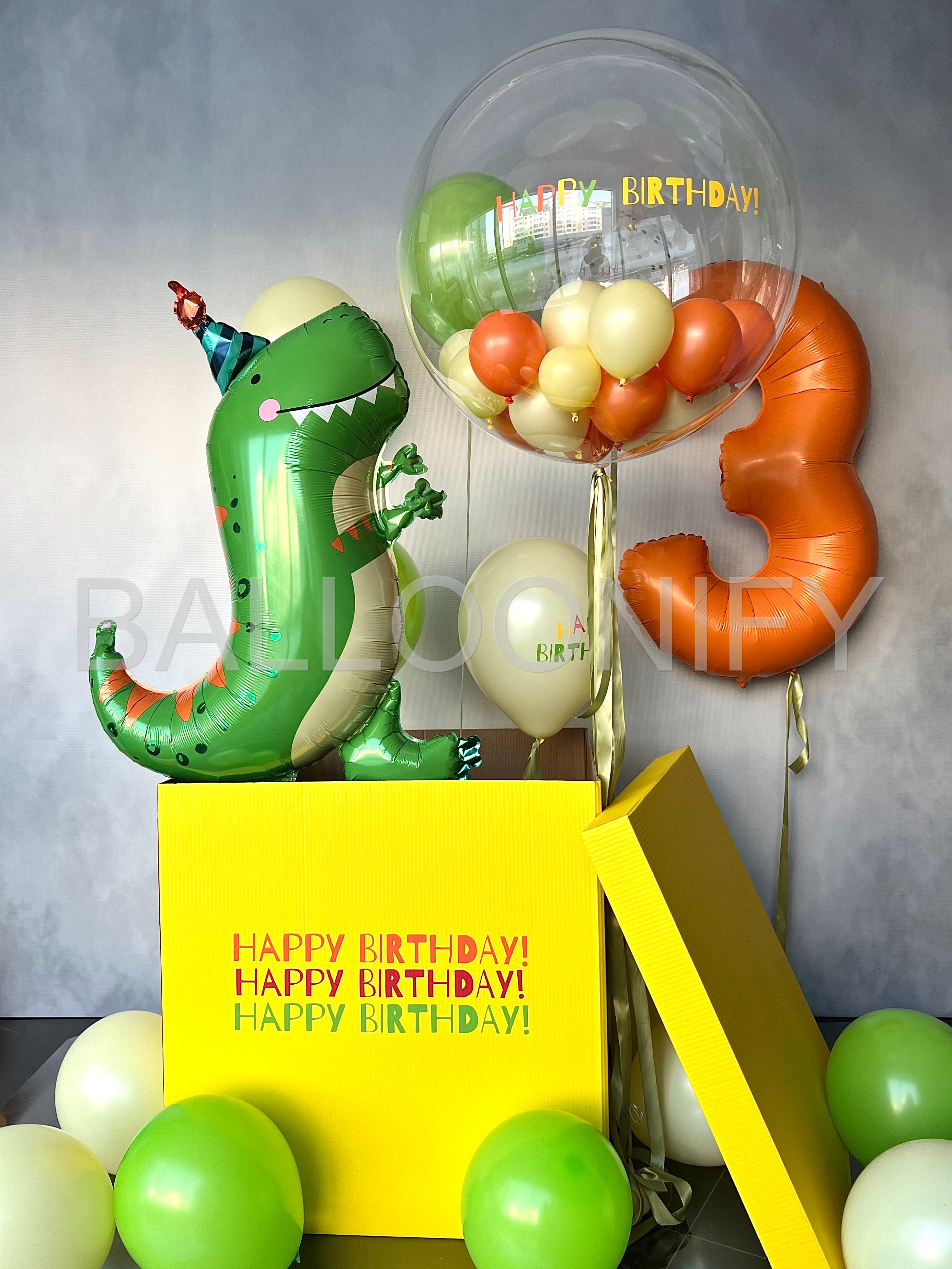Яркая композиция для детского дня рождения: весёлый фольгированный динозавр в шапочке, огромная прозрачная сфера с мини-шариками и надписью «Happy Birthday», оранжевая цифра «3» и жёлтая коробка с повторяющейся надписью «Happy Birthday!». Дополнена россыпью зелёных и кремовых шаров. Создаёт праздничное настроение и станет идеальной фотозоной! 🌟