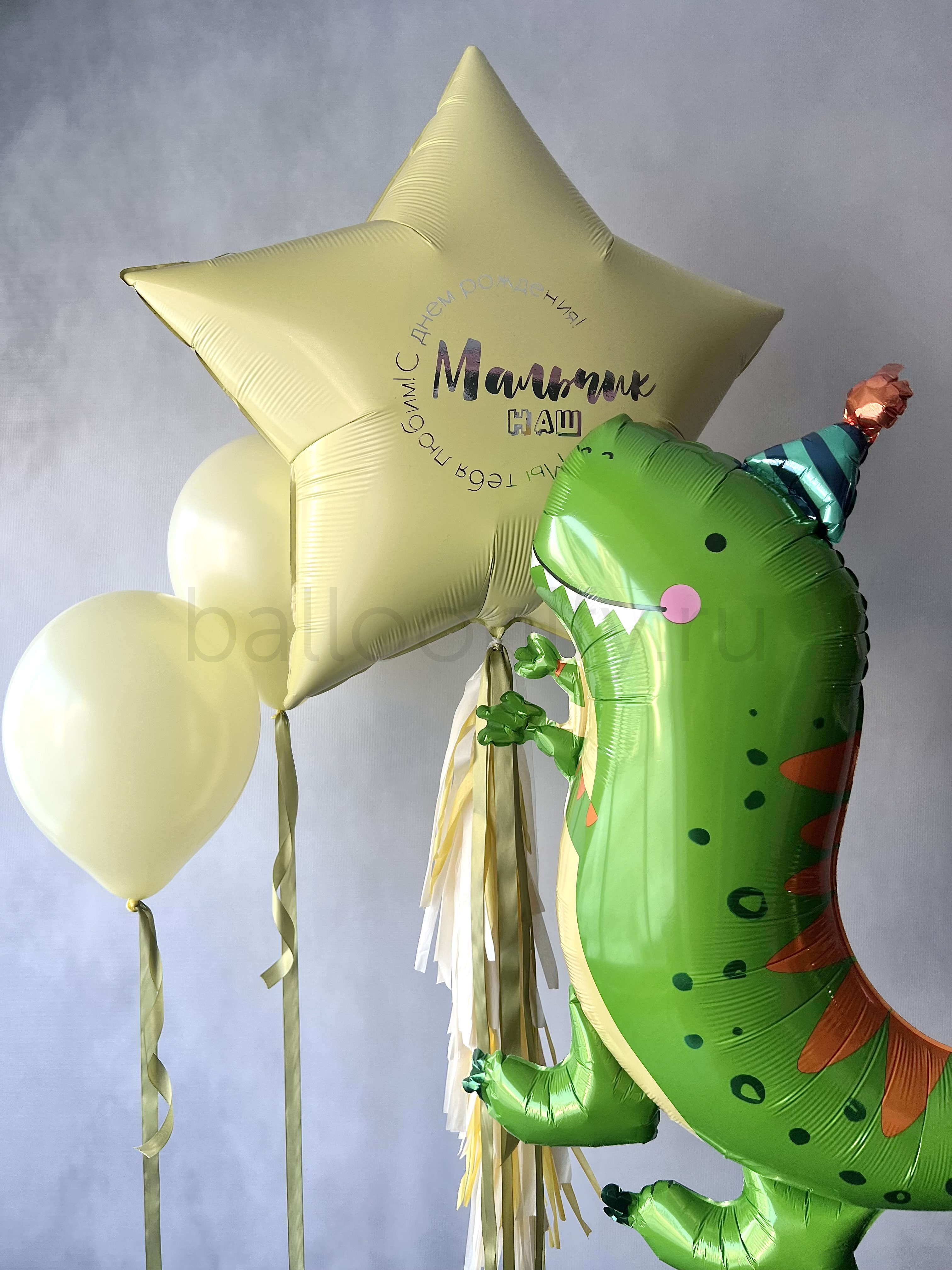 Элегантная композиция из воздушных шаров для поздравления маленького именинника: в центре — большая фольгированная звезда нежно-желтого цвета с трогательной надписью «С днём рождения! Мальчик наш», дополненная нежными лентами и фольгированная фигура динозавр в праздничной шапочке. Вокруг — три пастельных шара в тон, создающие гармоничный и праздничный образ. Идеально для оформления зала на день рождения малыша или выписку из роддома! 🌟