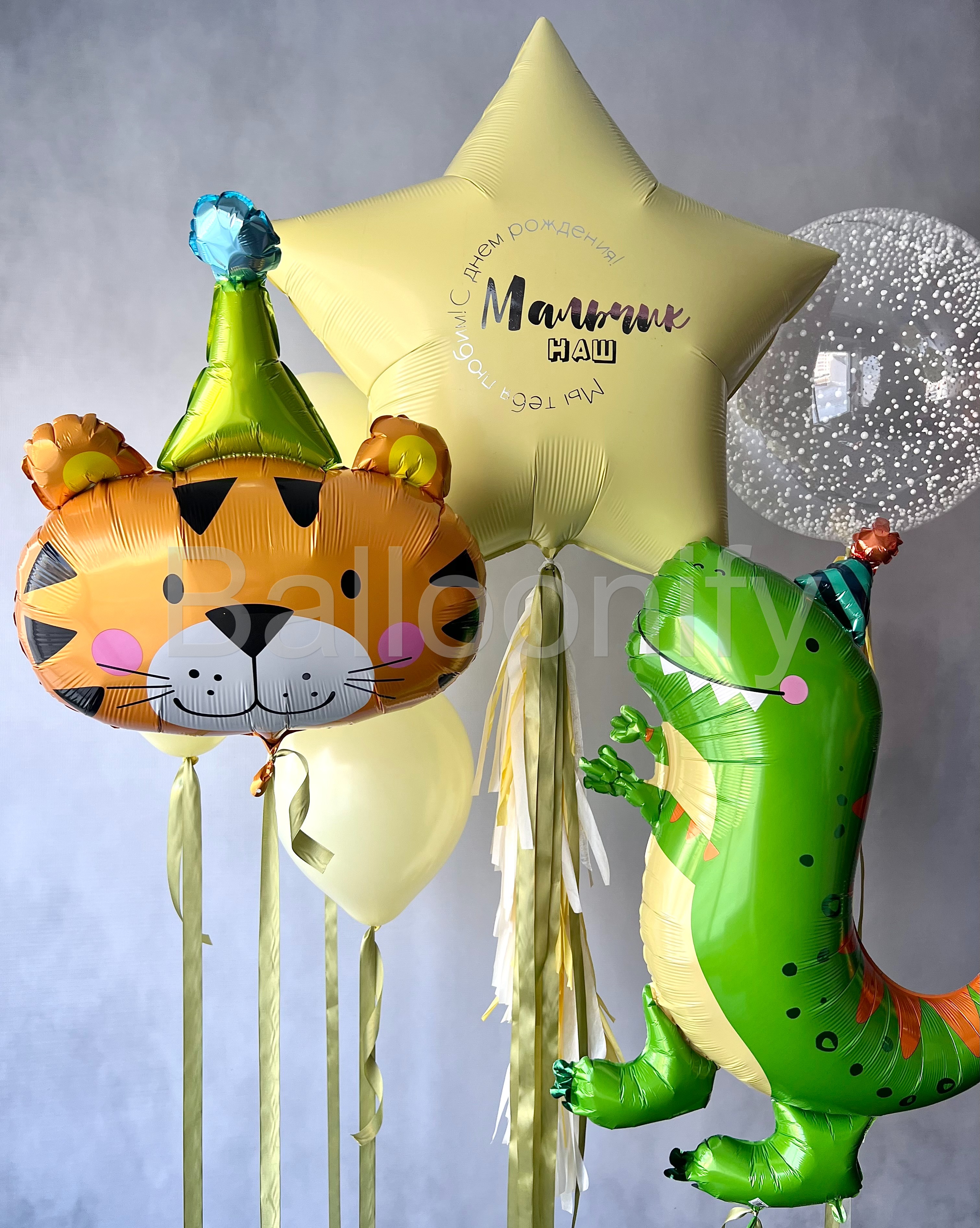 Яркая композиция из воздушных шаров для детского дня рождения: фольгированная звезда с трогательной надписью «Мальчик наш. Мы тебя любим. С днём рождения!», озорной тигрёнок в праздничной шапочке, весёлый динозавр в колпаке, прозрачный шар с белым пенопластом и нежные пастельные шары. Создаст атмосферу сказки и станет идеальной фотозоной для маленького именинника! 🌟