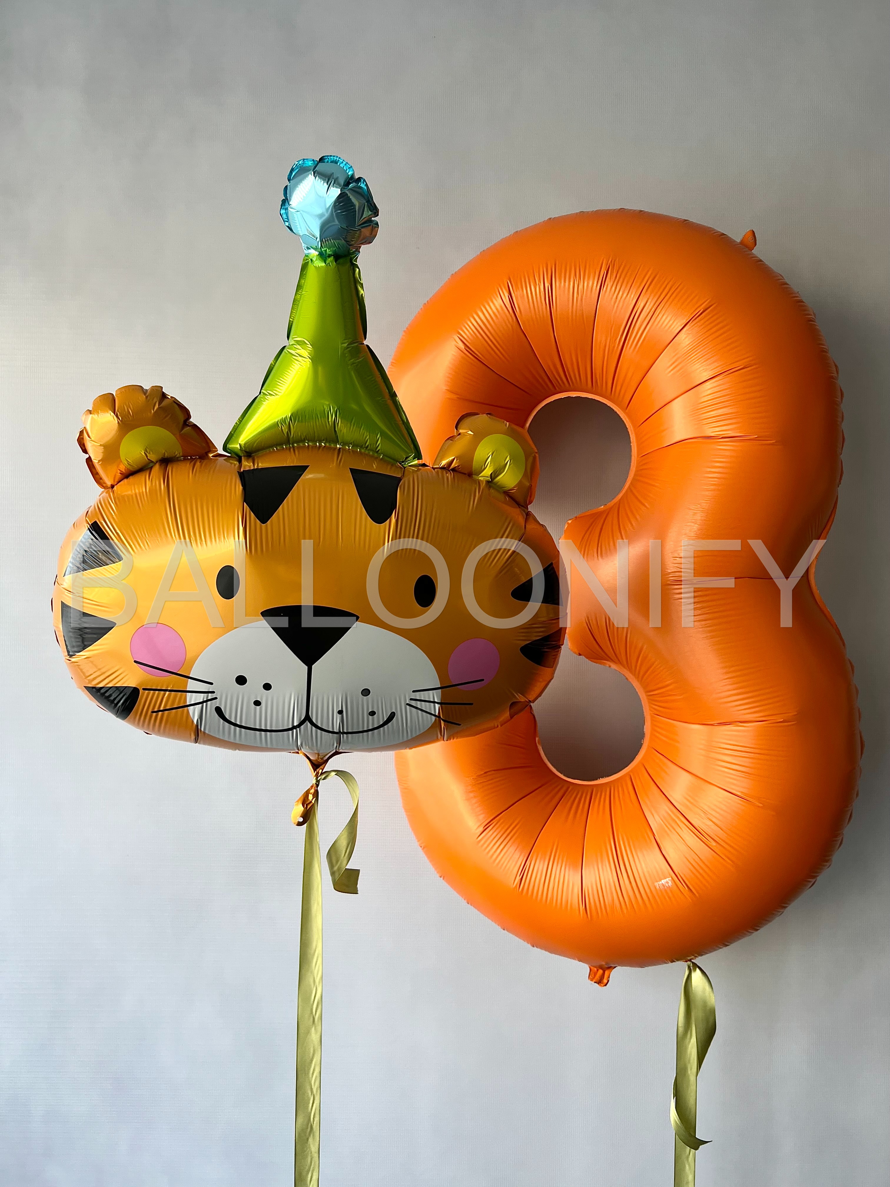 Очаровательная композиция из фольгированных шаров для детского праздника: весёлый тигрёнок в яркой праздничной шапочке и большая оранжевая цифра «3». Яркие цвета и забавный персонаж создадут радостную атмосферу и станут отличным украшением для дня рождения! 🌟