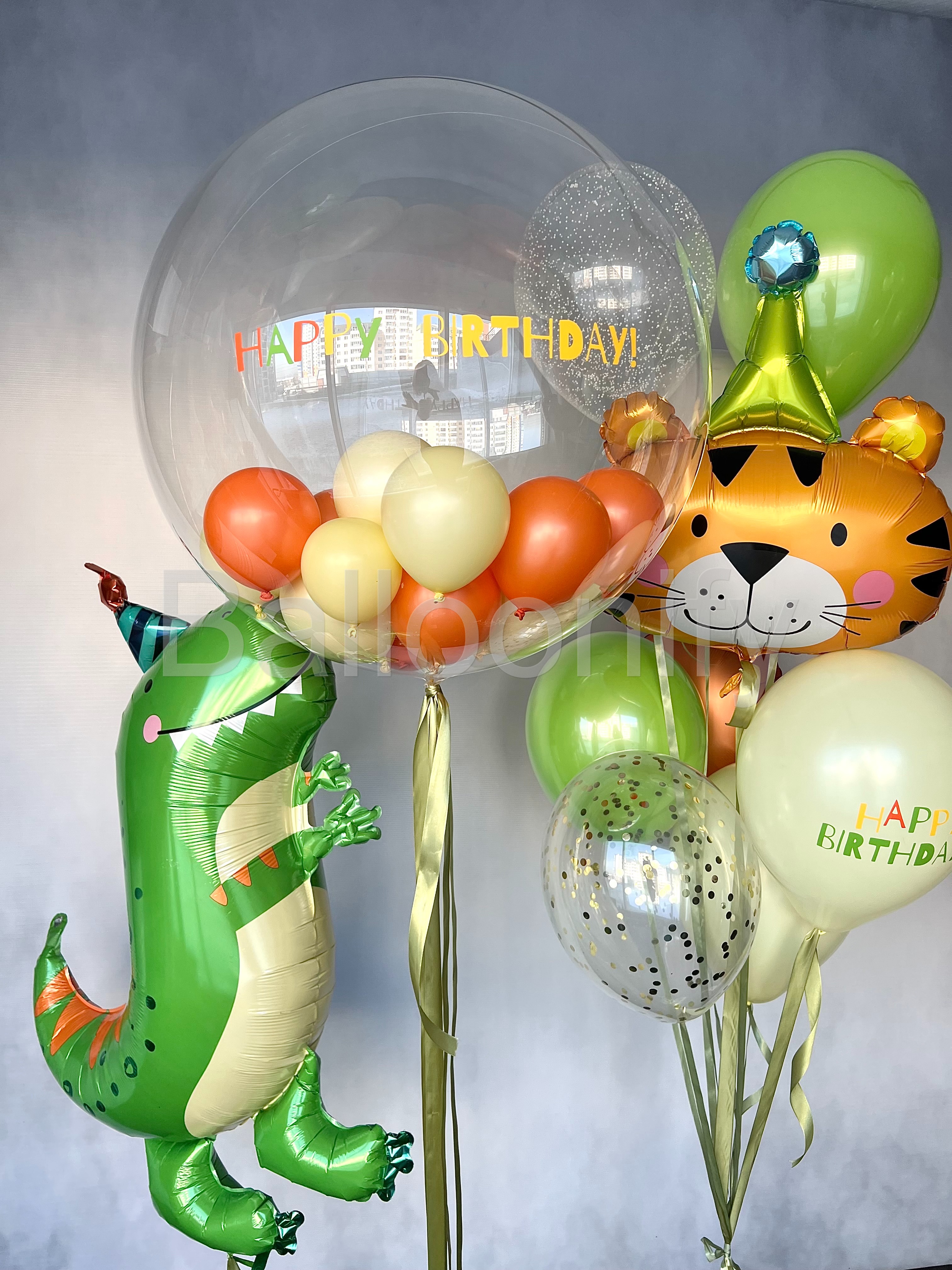 Яркая и весёлая композиция из воздушных шаров в тематике «Дино и компания»: фольгированный динозавр и тигрёнок в праздничных шапочках, большой прозрачный шар с надписью «Happy Birthday!» и мини-шариками внутри. Создаёт атмосферу приключения и радости — идеально для детского дня рождения! 🌟