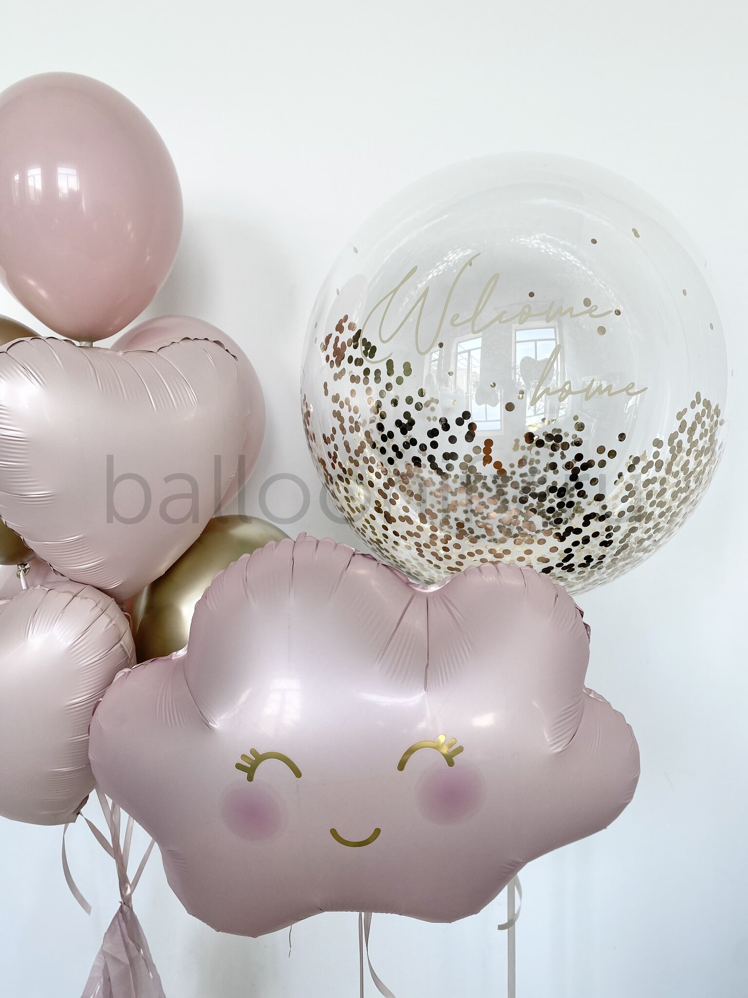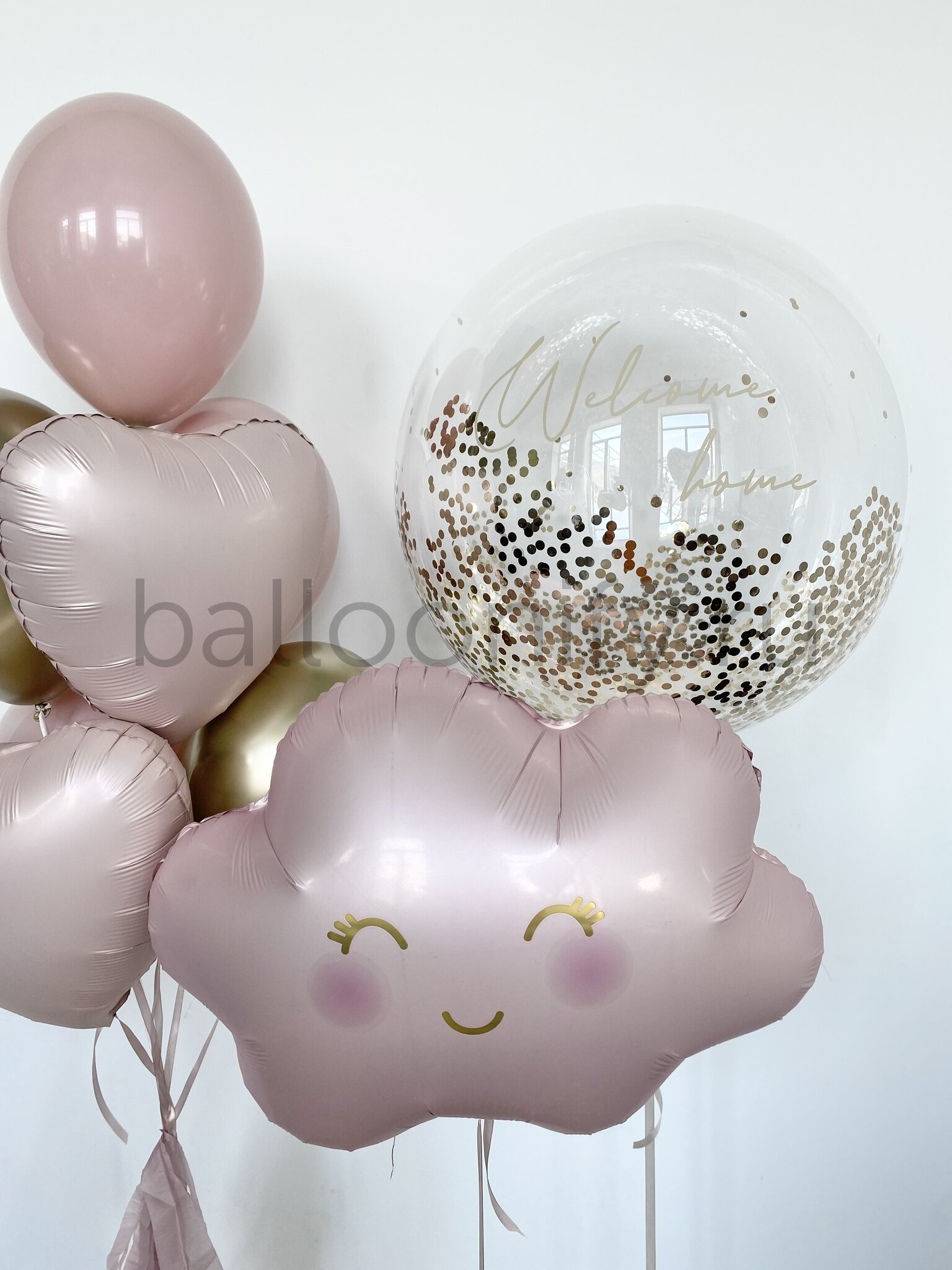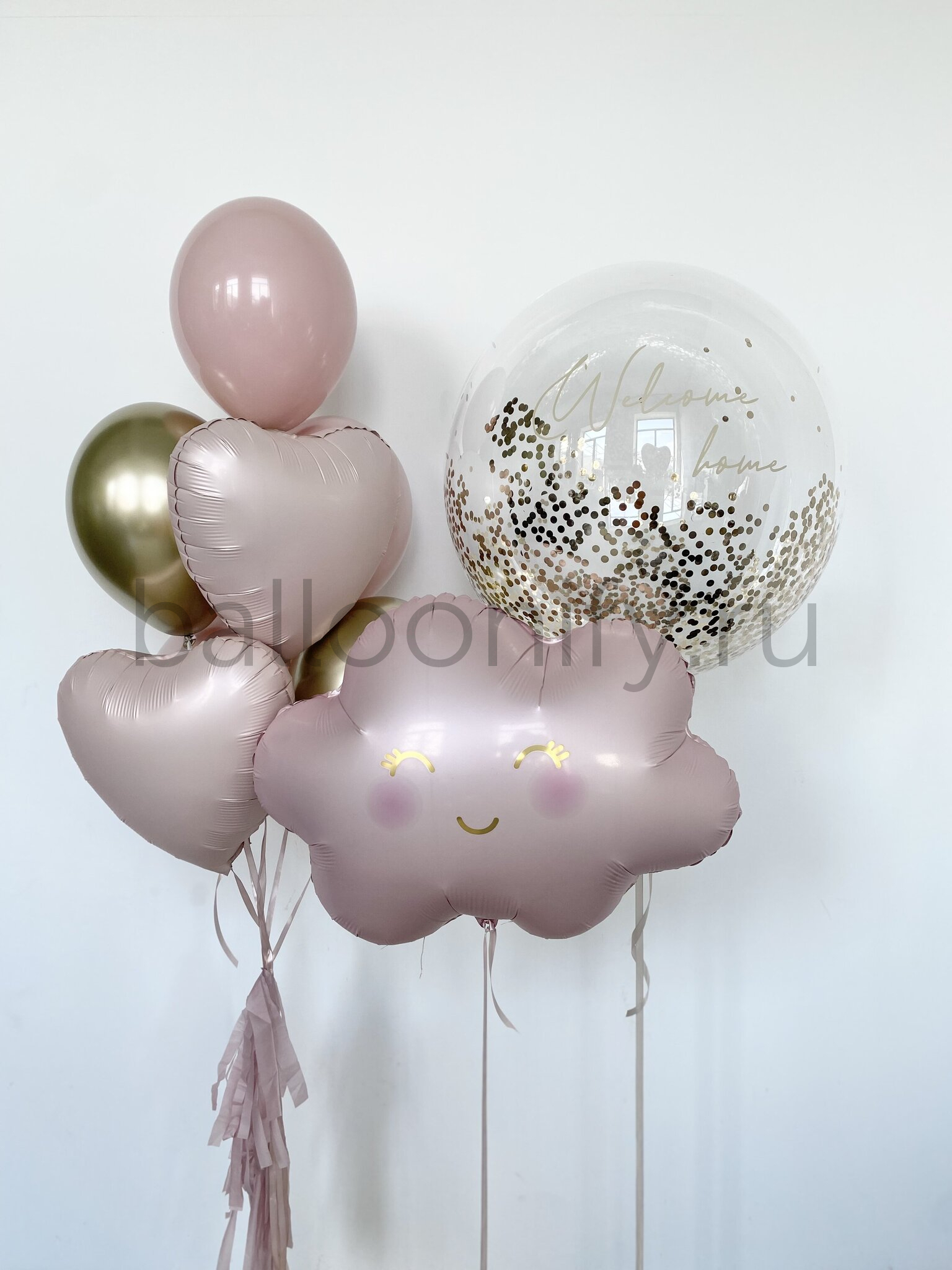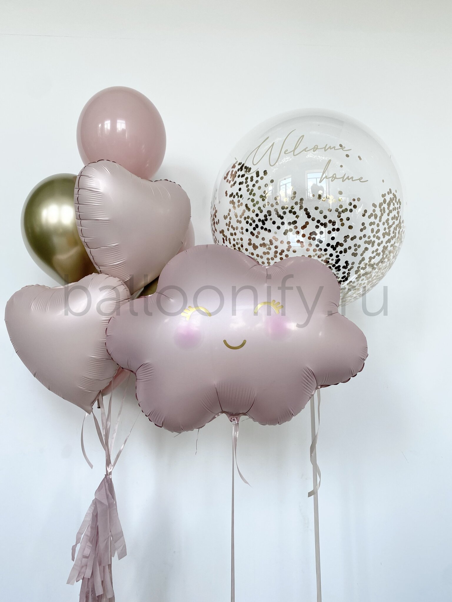 Этот волшебный набор воздушных шаров создан для того, чтобы сделать день появления малышки поистине волшебным и незабываемым. Роскошный прозрачный шар с конфетти и надписью, наполненный теплотой и заботой, станет центральным элементом праздничного оформления, подчеркивая значимость этого особенного события. Дополняет композицию элегантная подборка шаров в пастельно-розовых и золотистых оттенках и милое розовое облачко - создавая атмосферу настоящей сказки.
