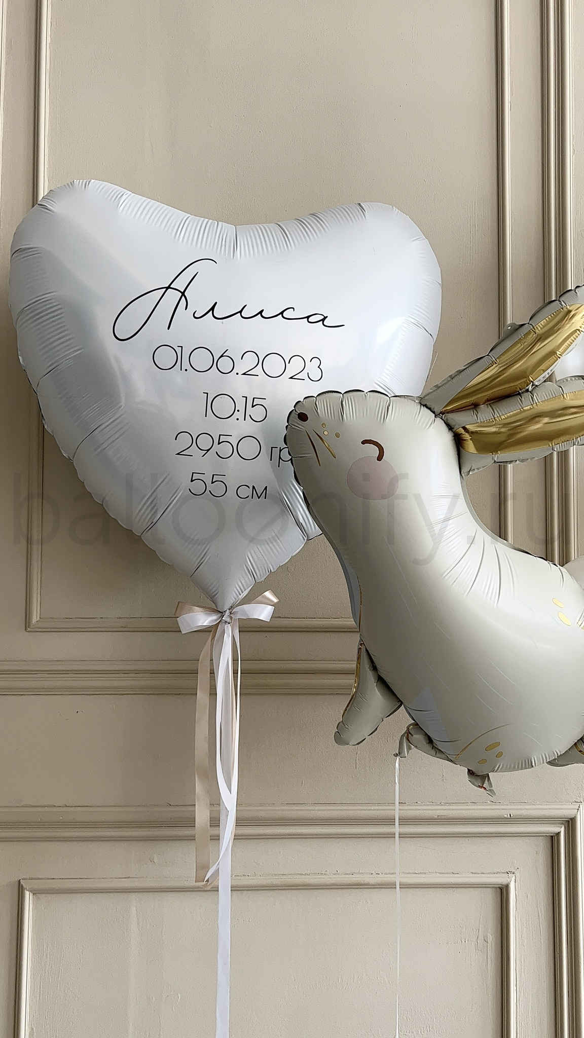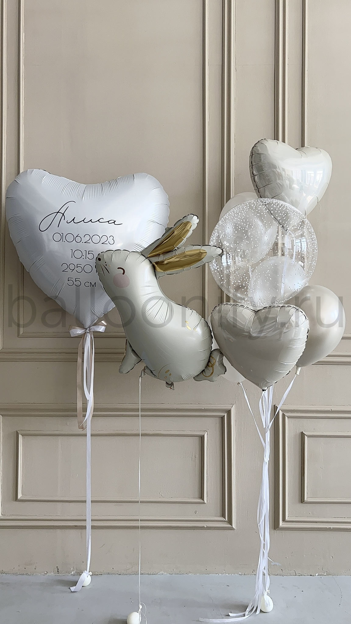Нежная композиция из воздушных шаров, созданная специально для поздравления с рождением малыша или малышки. Изысканное сочетание кремовых и белых оттенков создает атмосферу тепла и умиротворения, а метрика новорожденного на большом фольгированном сердце делает композицию по-настоящему особенной.