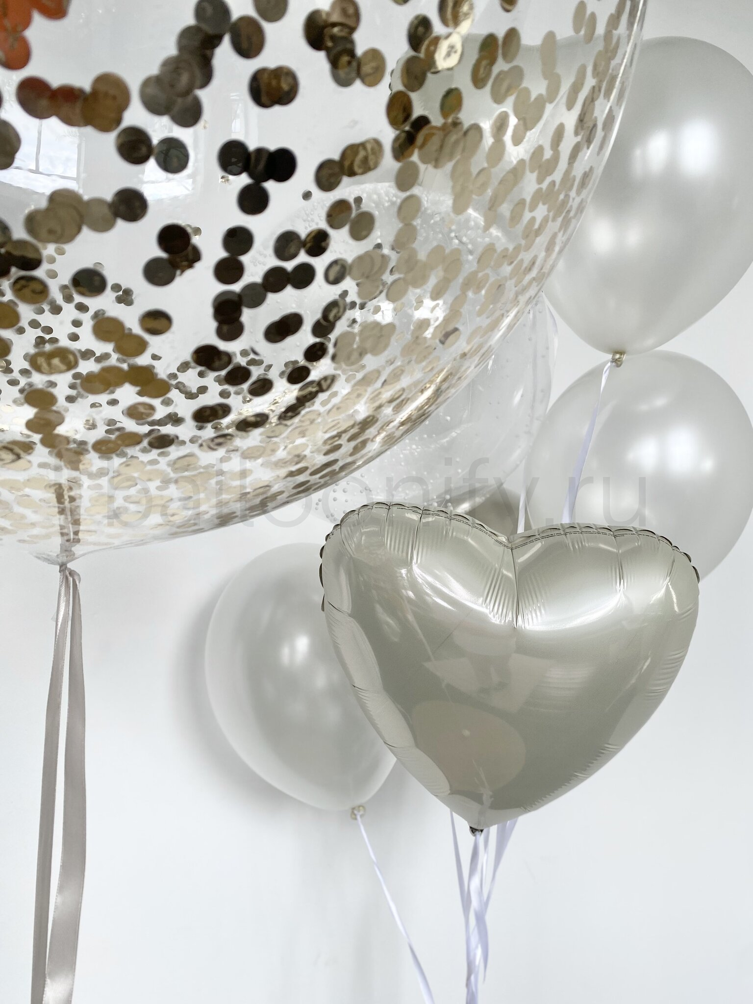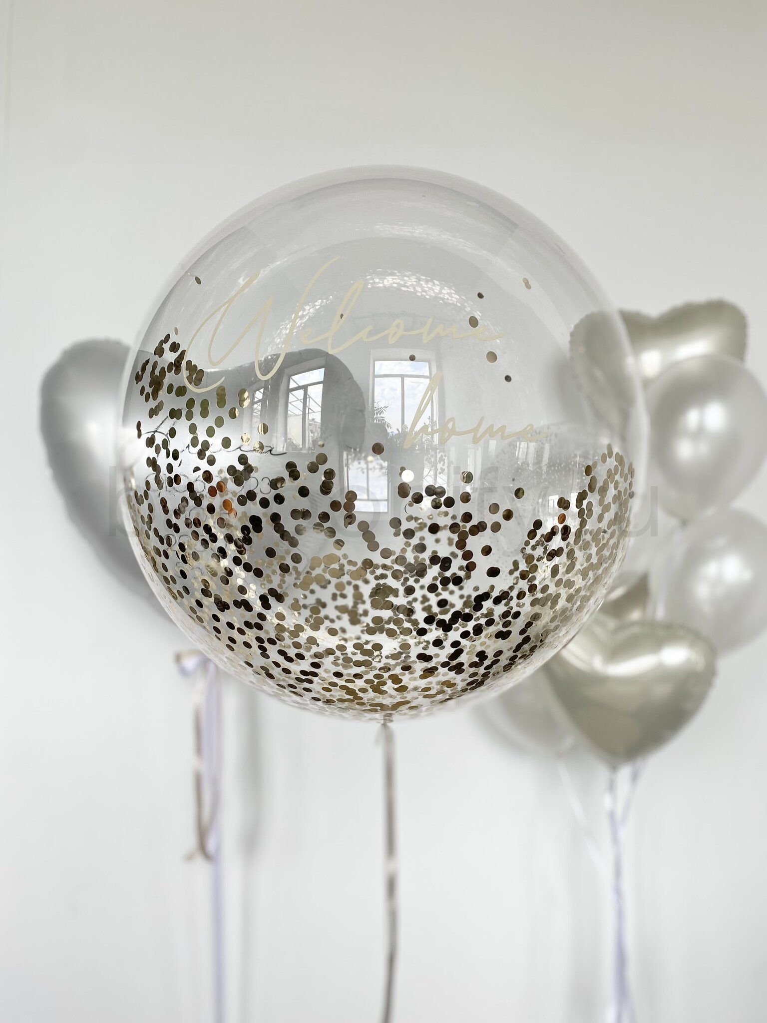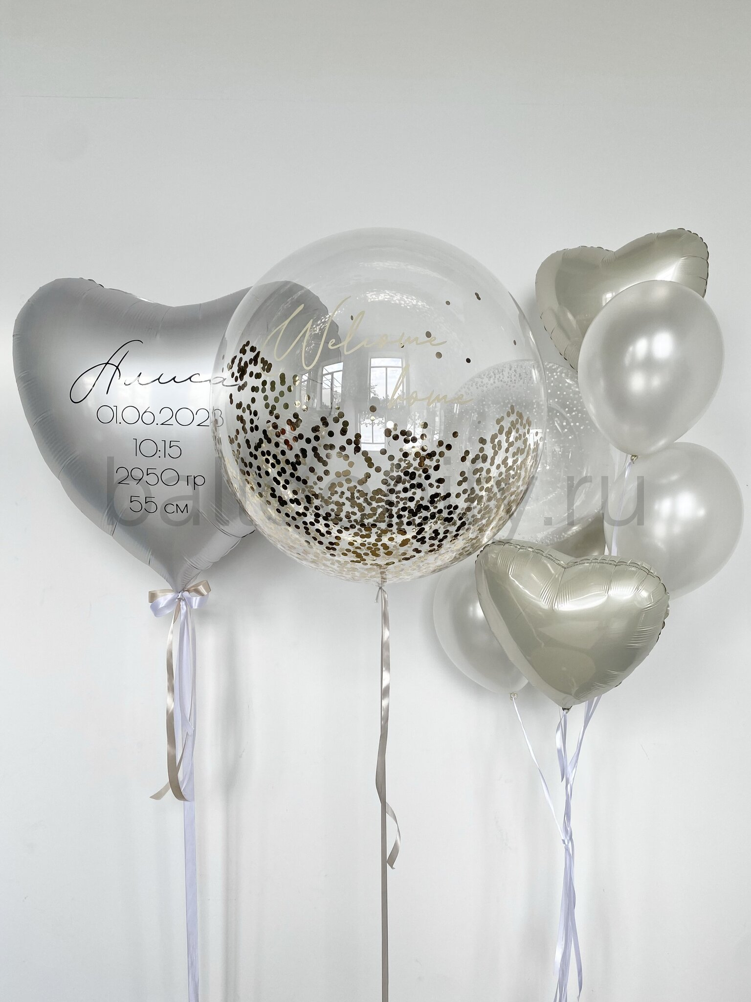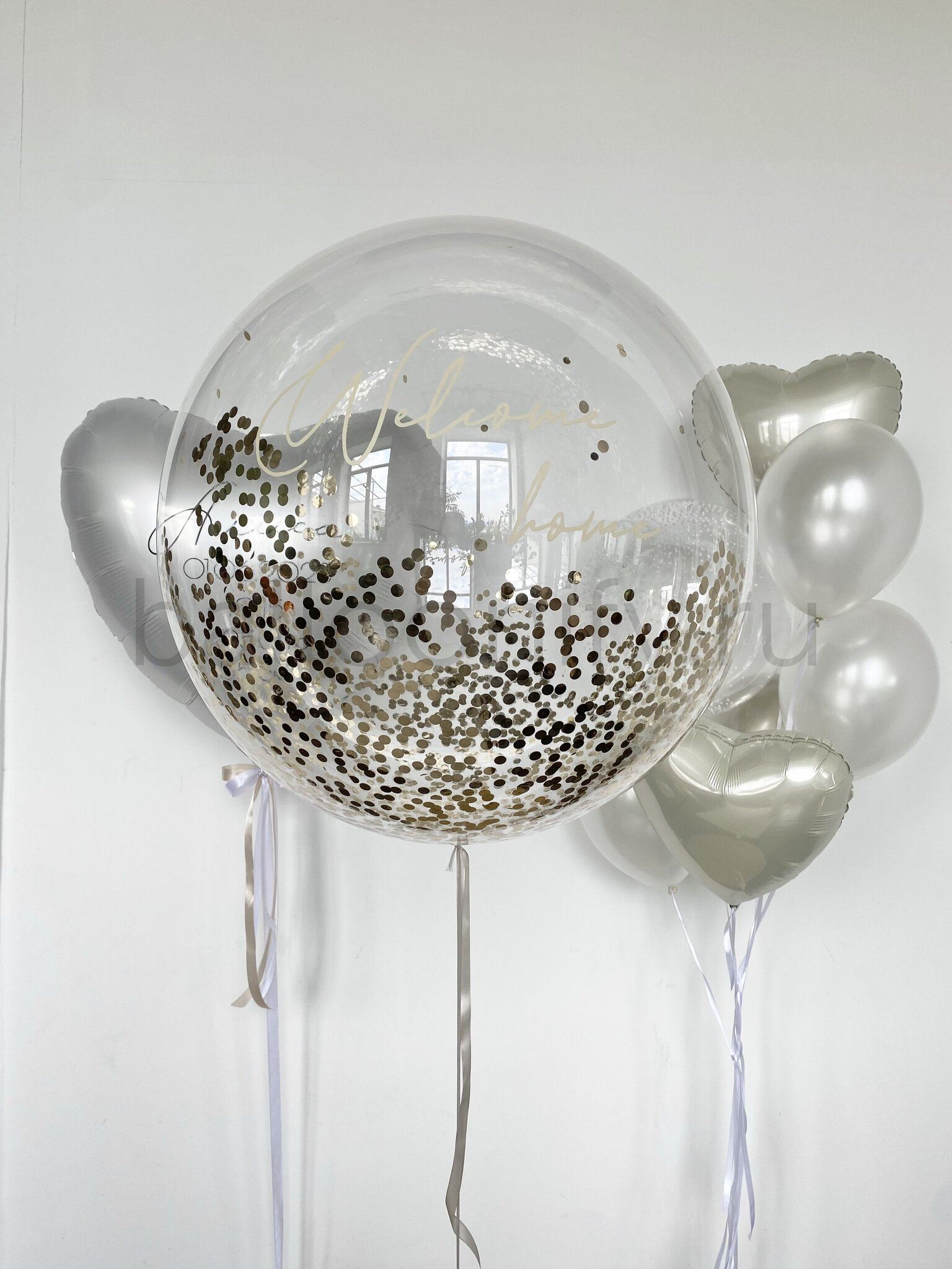 Изысканное оформление для выписки малыша или малышки: прозрачный шар с надписью “Welcome home”, наполненный конфетти и комплект воздушных шаров в благородной жемчужно-белой цветовой гамме.