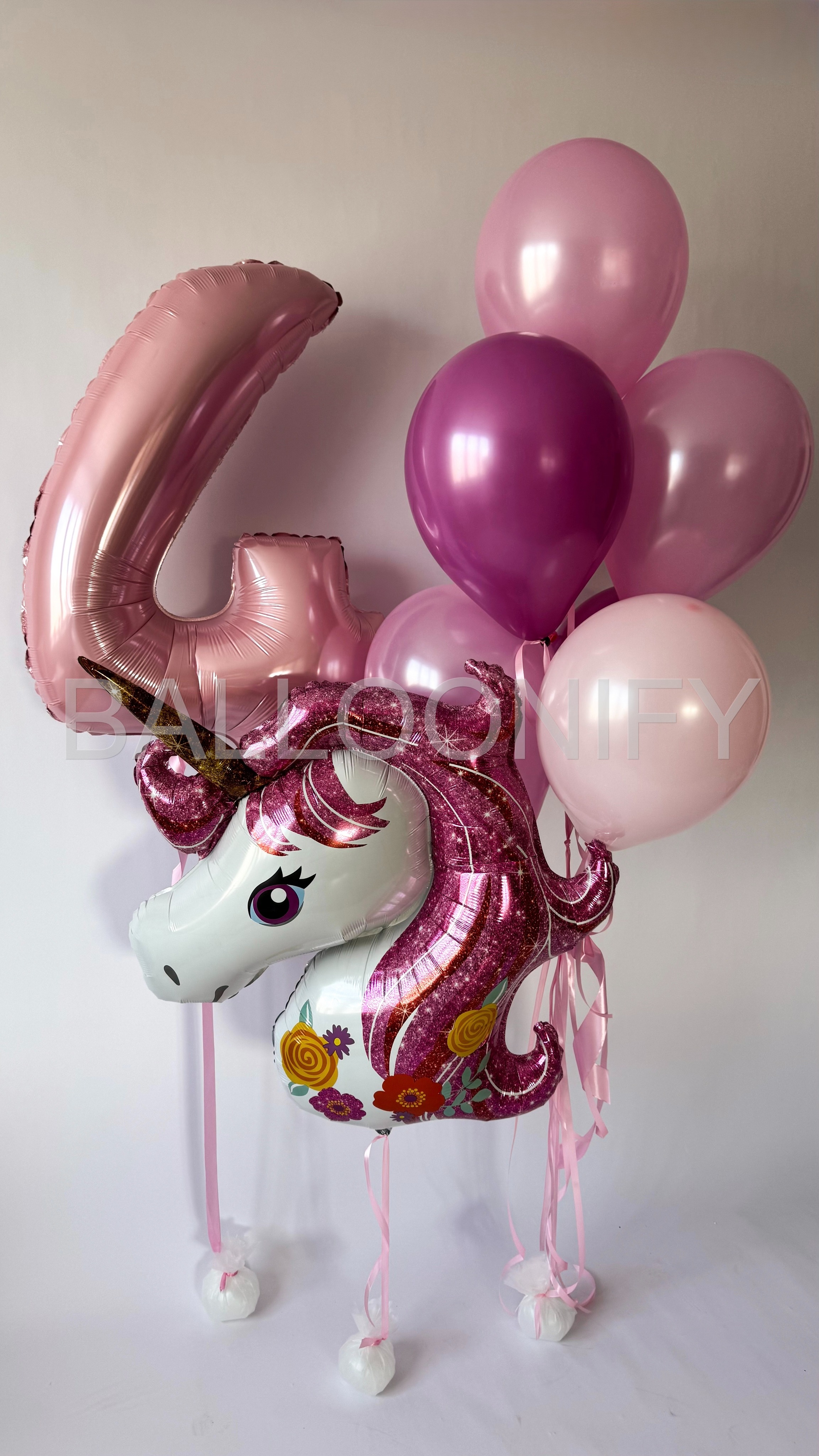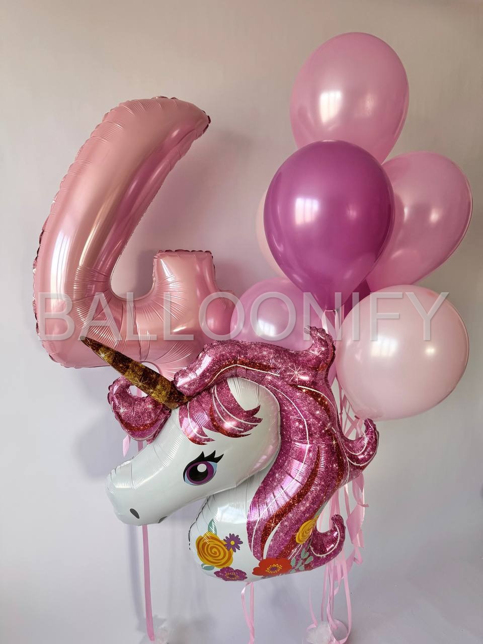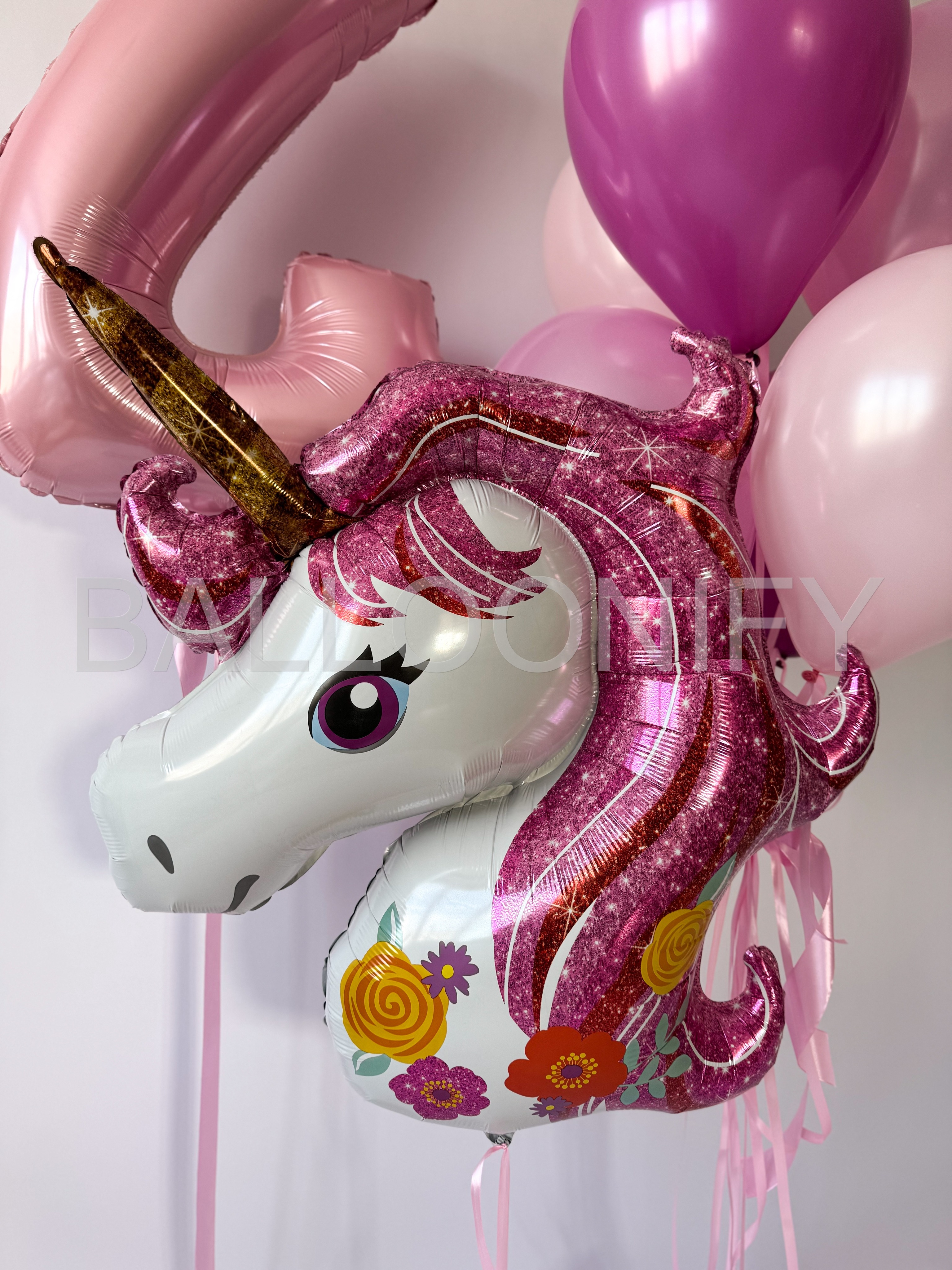 Нежная и волшебная композиция из воздушных шаров для детского праздника: блестящий шар-единорог с розовой гривой и цветочным орнаментом, большой розовый шар в виде цифры «4», а также гроздь шаров пастельных и ярких розовых оттенков. Создаст сказочную атмосферу, украсит зал и станет идеальной фотозоной для маленькой именинницы.