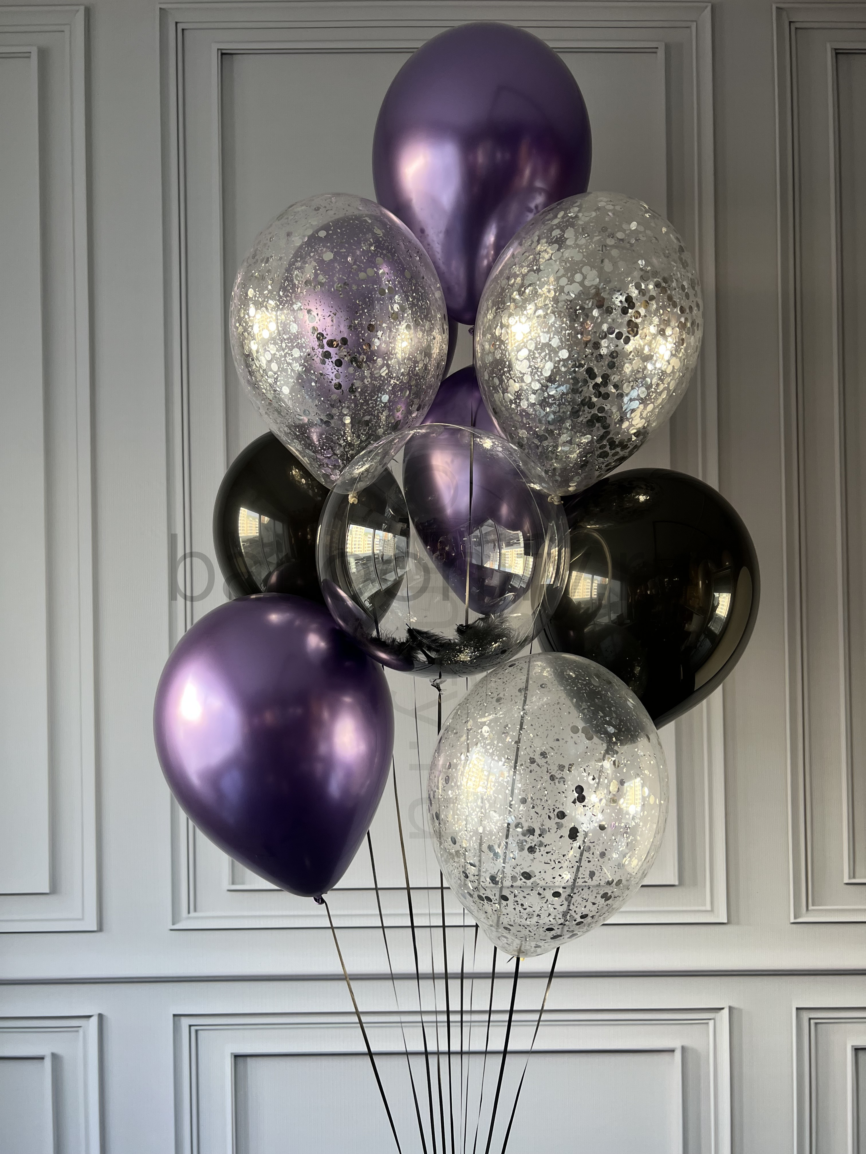 Элегантная композиция из гелиевых шаров в изысканной цветовой гамме: блестящие фиолетовые, чёрные и прозрачные шары с серебристым конфетти создают эффектный и стильный акцент. Сочетание глубоких оттенков и мерцающих деталей придаёт композиции торжественность — она идеально подойдёт для дня рождения, корпоратива или другого значимого события. 🌟