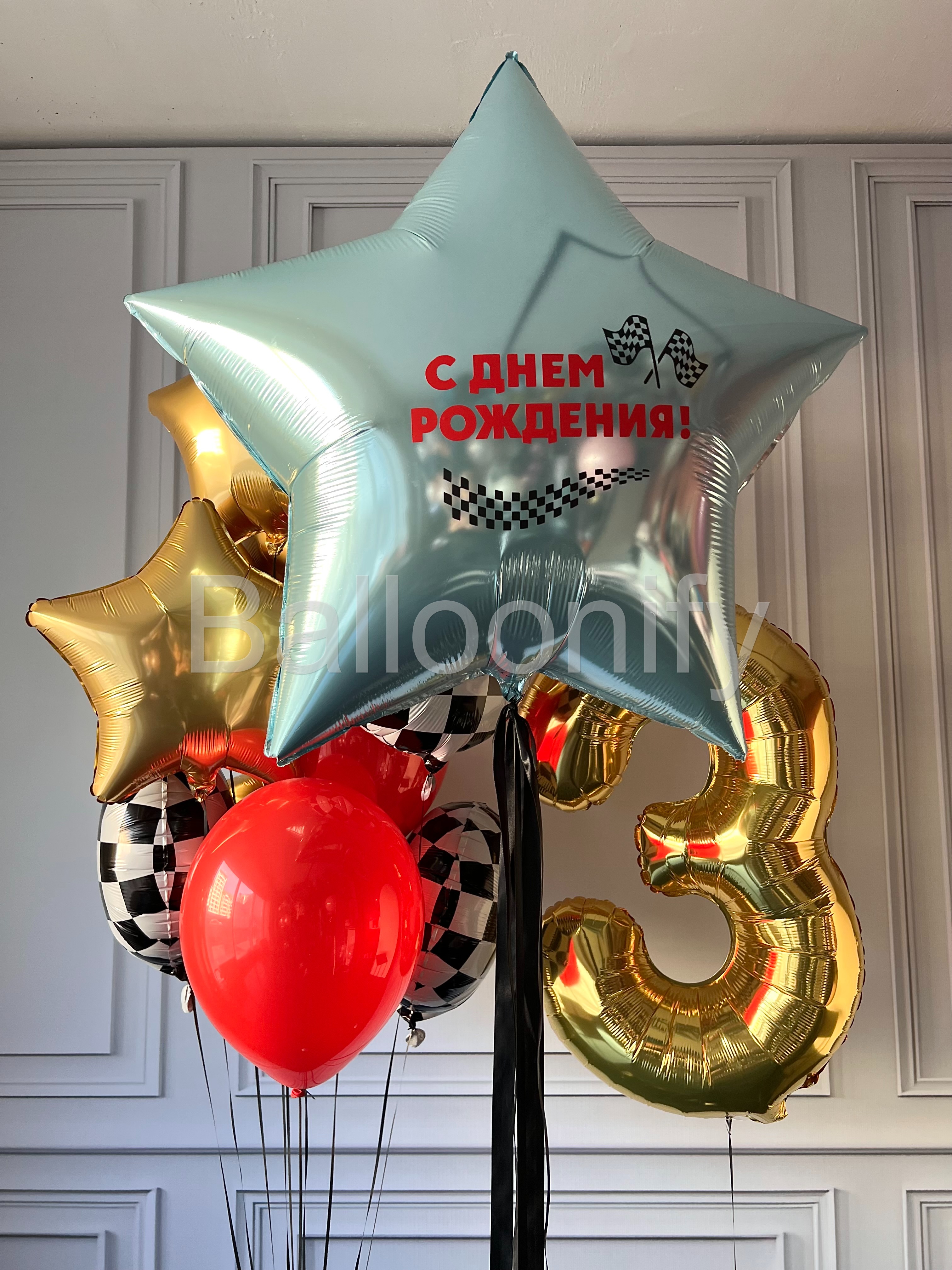 Представляем Вашему вниманию эффектную композицию из воздушных шаров, которая сочетает в себе контрастные и стильные элементы. Композиция представляет собой яркий и динамичный ансамбль из воздушных шаров, выполненный в стиле «гонки». Центральным элементом является большая фольгированная звезда голубого цвета размером около 91 см. и величественная фольгированная цифра. На звезде размещена праздничная надпись «С Днём рождения!» ярко-красным шрифтом, а также изображены гоночные флажки и шахматная полоса — эти детали чётко задают тематику композиции. 🌟