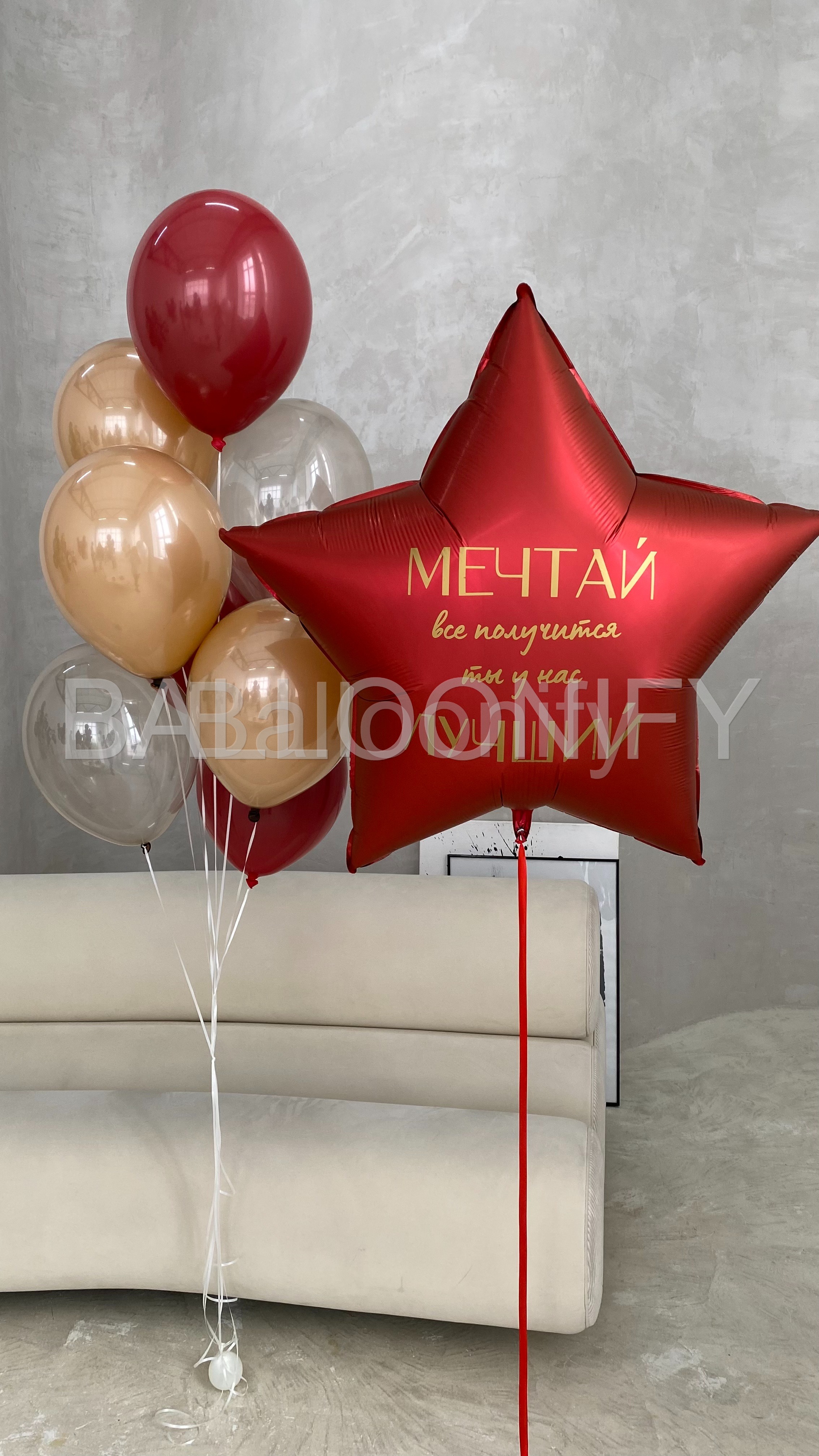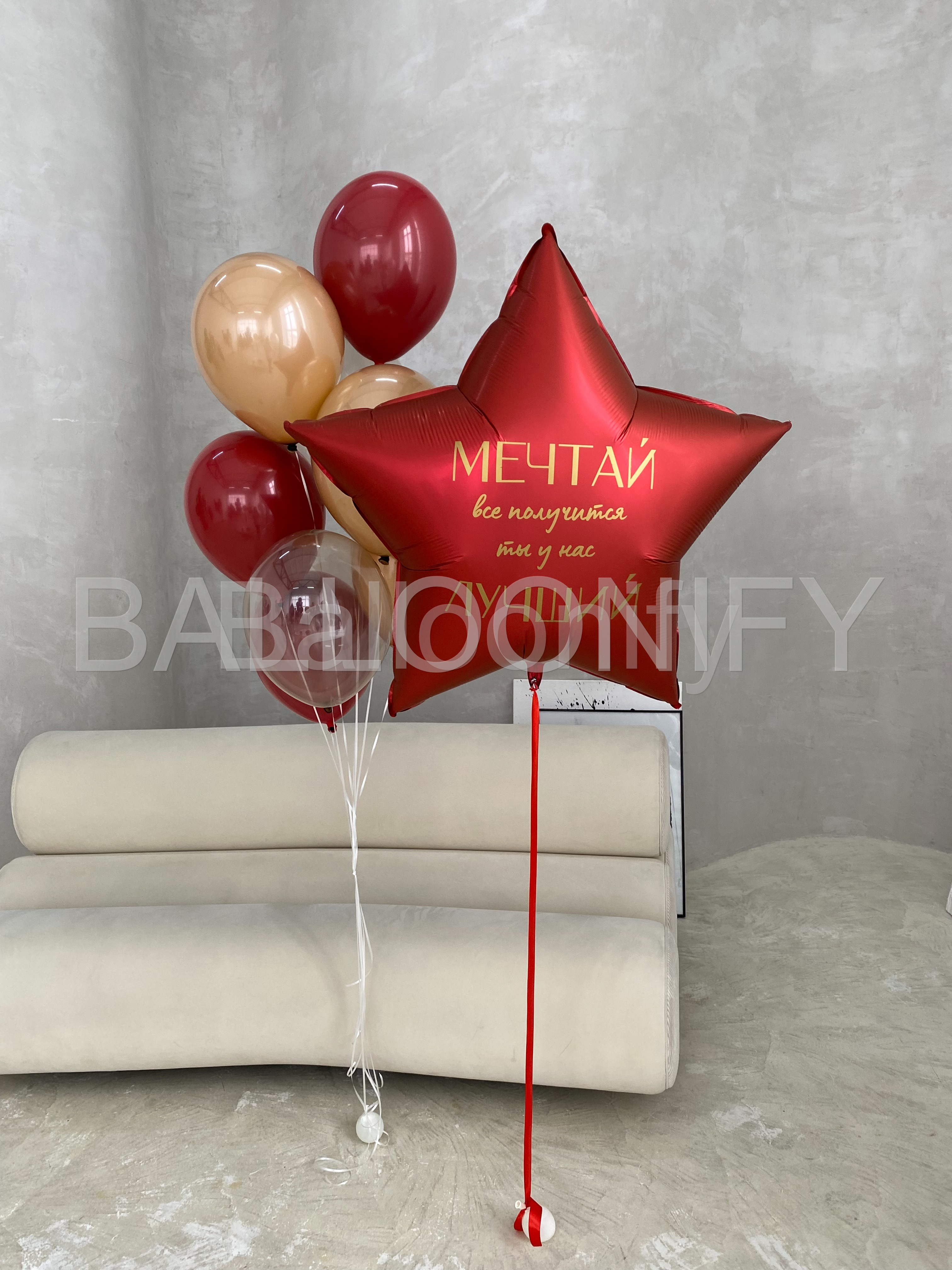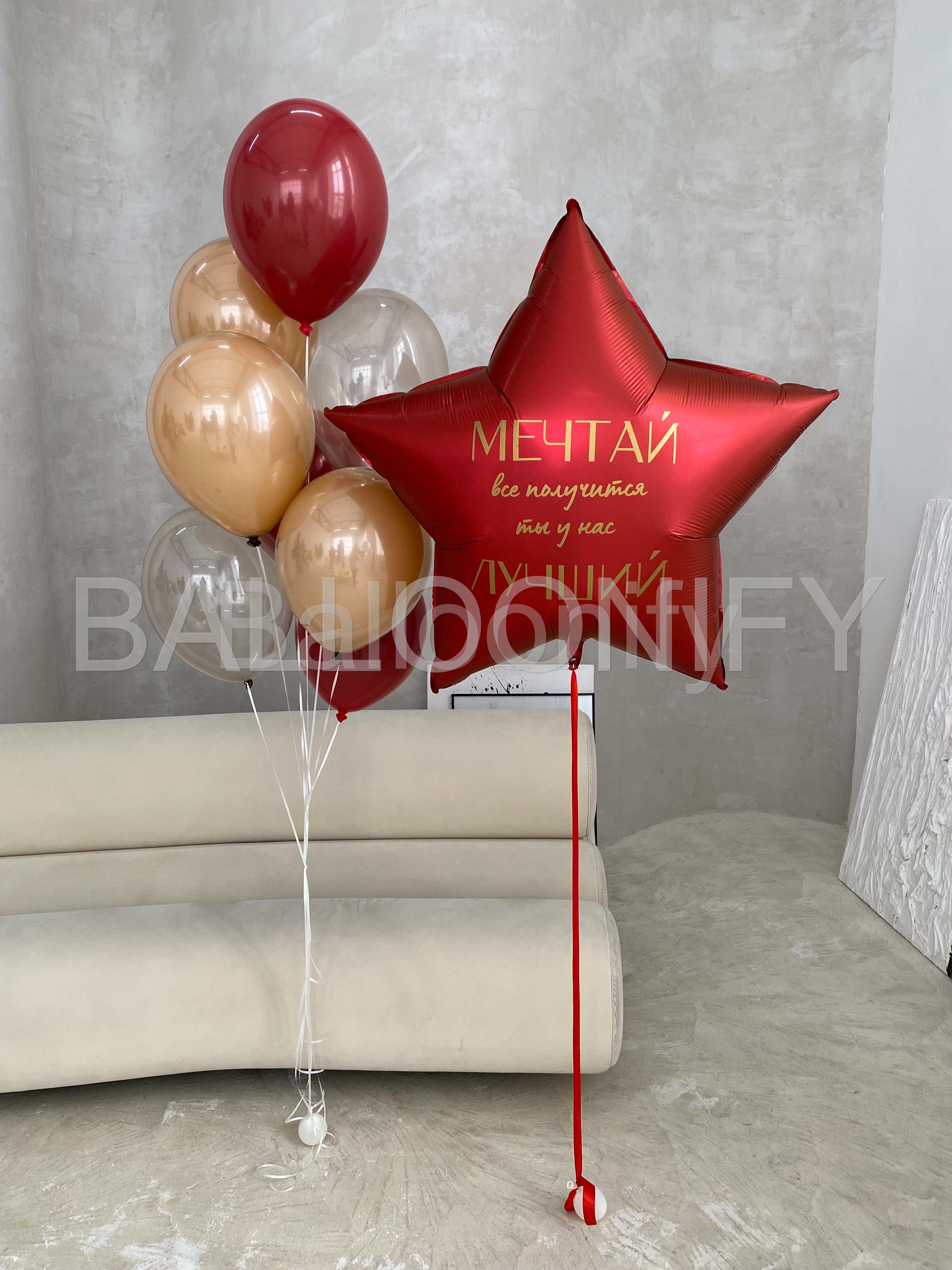 Элегантный набор воздушных шаров для особенного человека: красная звезда с вдохновляющей надписью «Мечтай, всё получится, ты у нас лучший» станет главным акцентом композиции, а гармоничное сочетание глянцевых шаров красного, латте и прозрачного оттенков создаст праздничную атмосферу. Идеальный выбор для поздравления с днём рождения, профессиональным праздником или просто чтобы выразить признательность и поддержку. 🌟