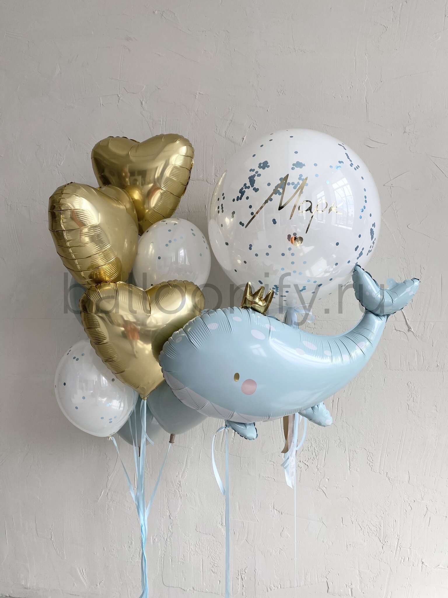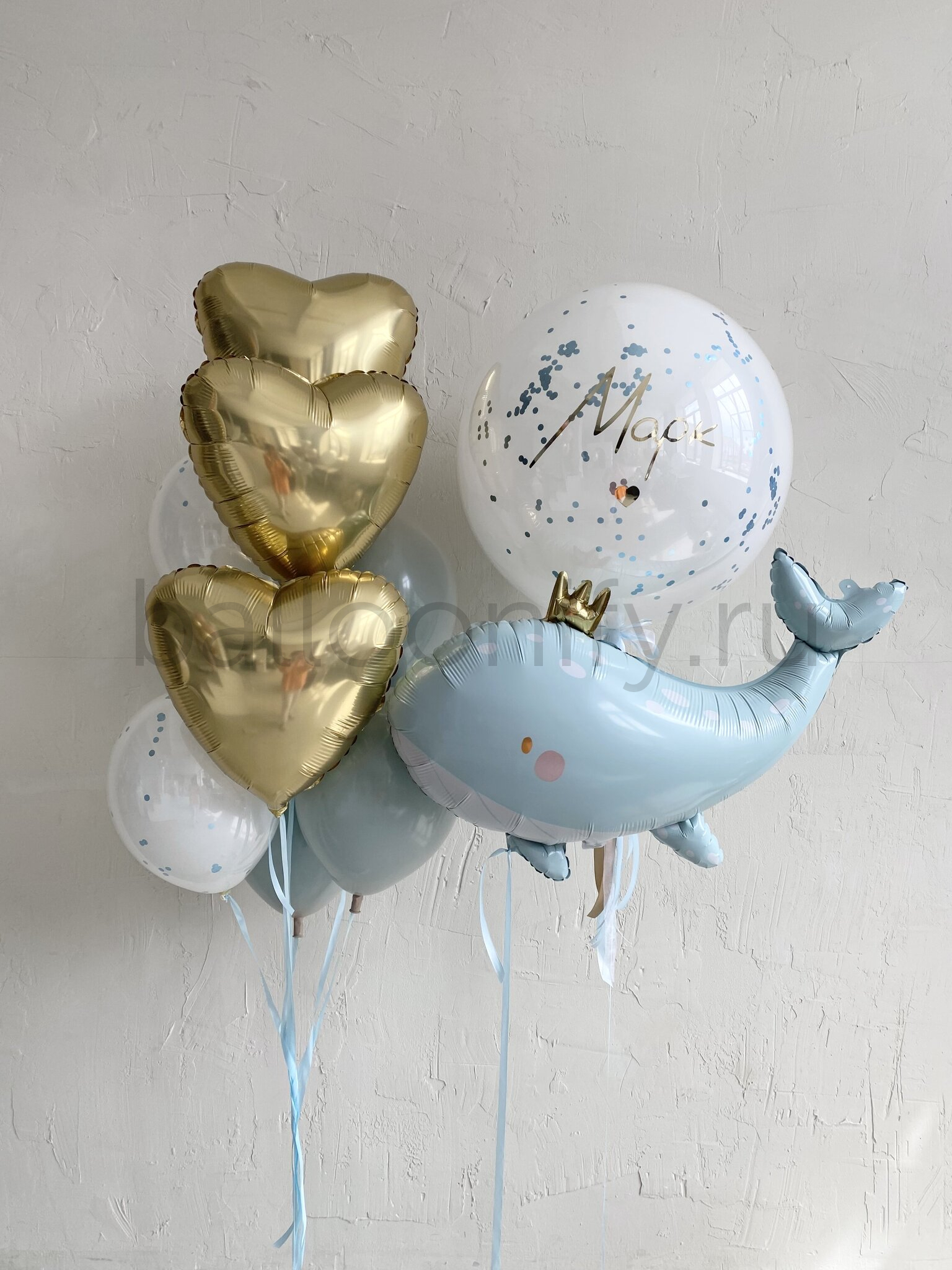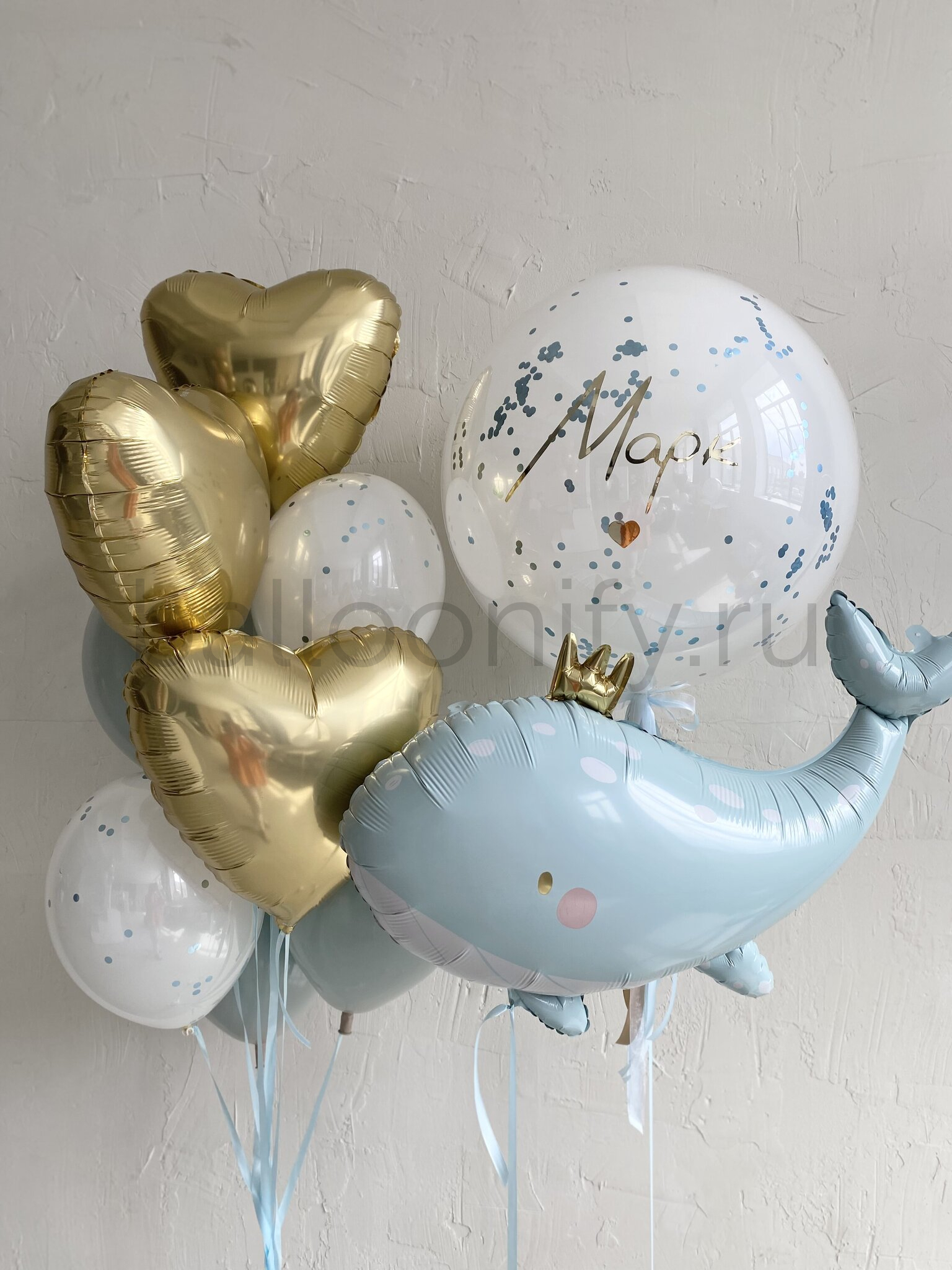 В центре композиции величественно парит огромный голубой кит с короной (91 см), окруженный сияющим стеклянным шаром (61 см). Индивидуальная надпись добавляет персональности и особого смысла вашему торжеству.
