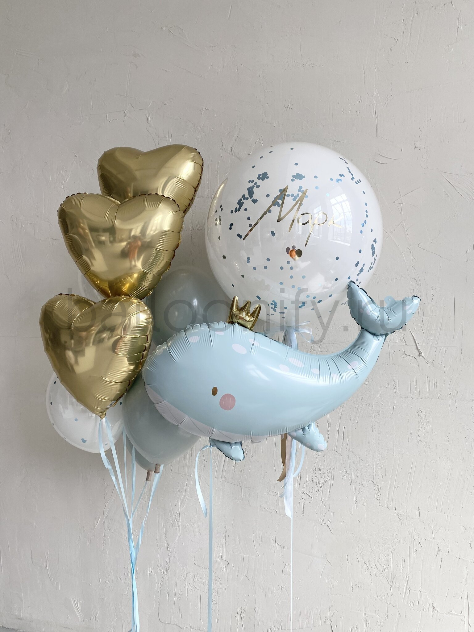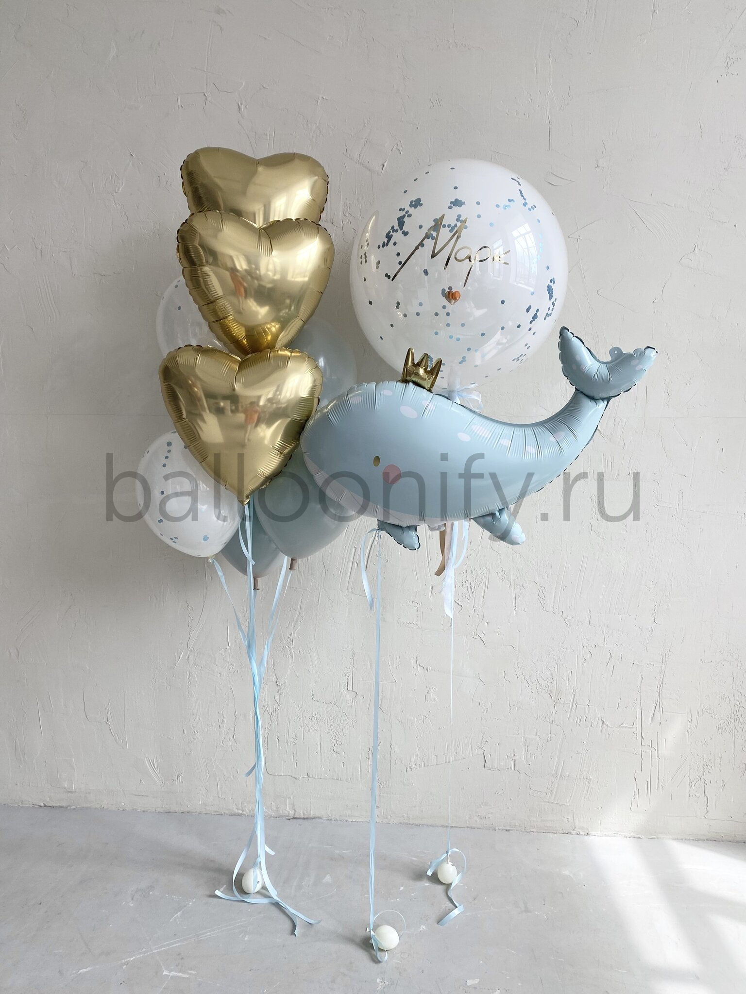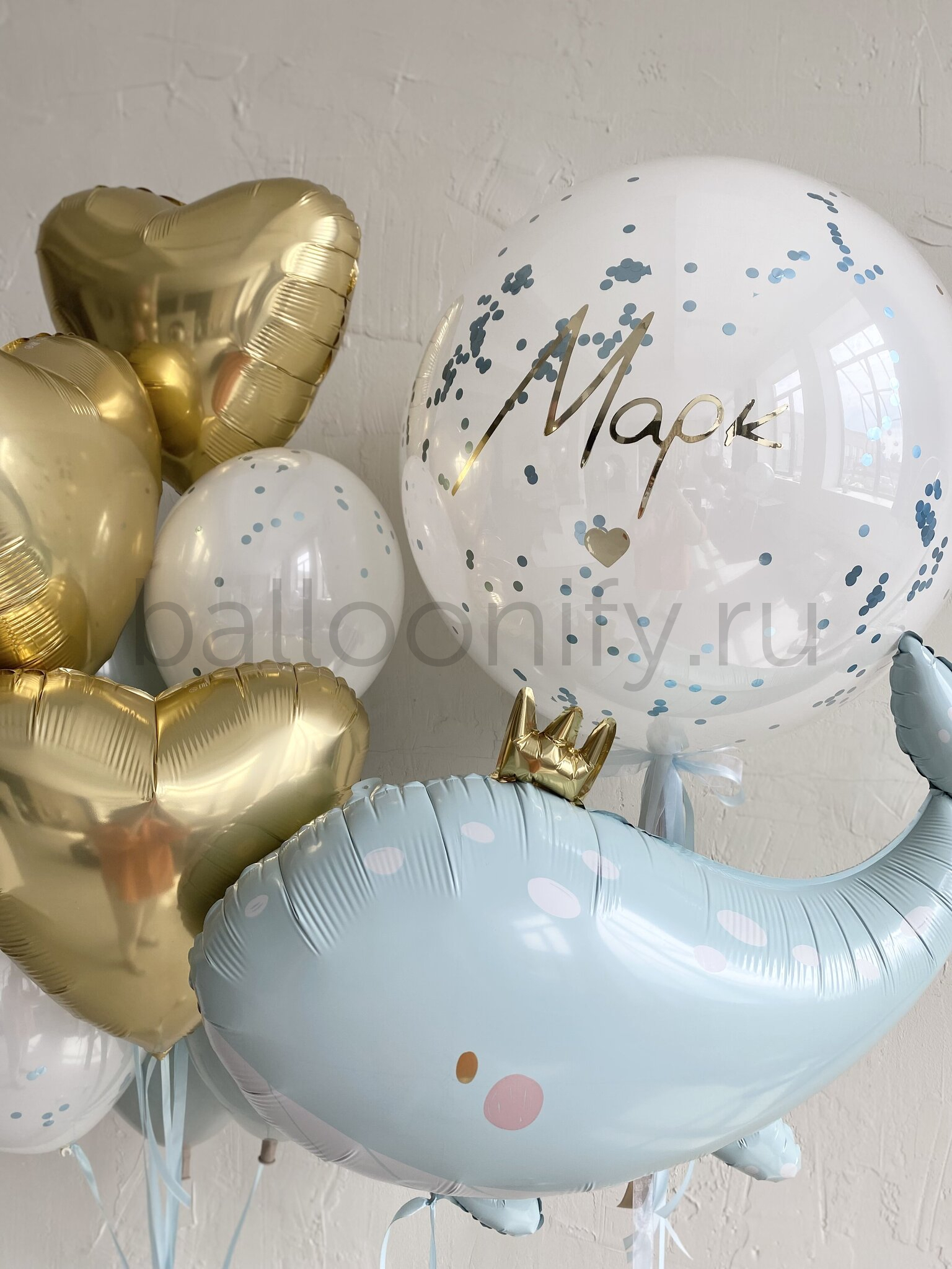 В центре композиции величественно парит огромный голубой кит с короной (91 см), окруженный сияющим стеклянным шаром (61 см). Индивидуальная надпись добавляет персональности и особого смысла вашему торжеству.
