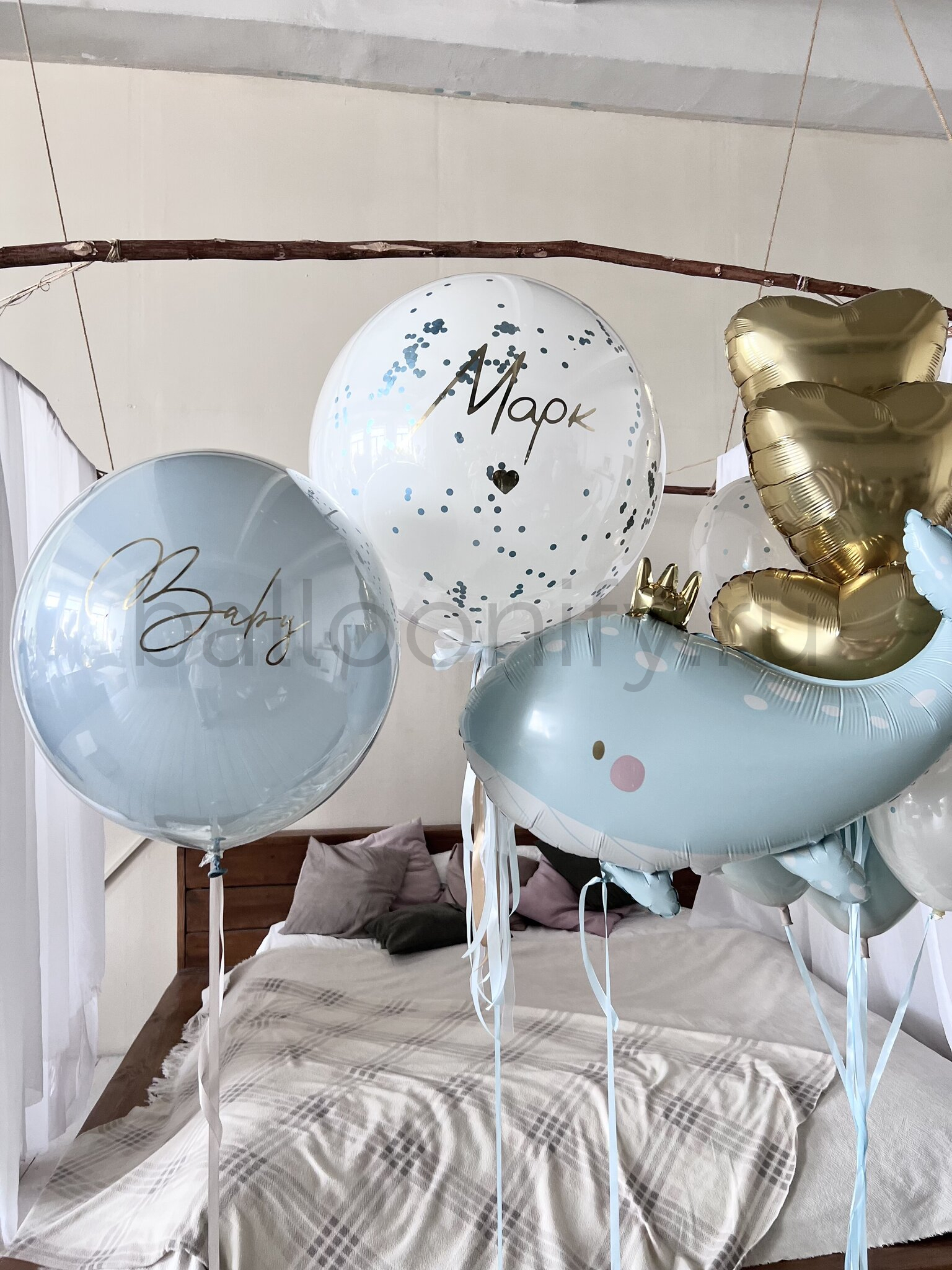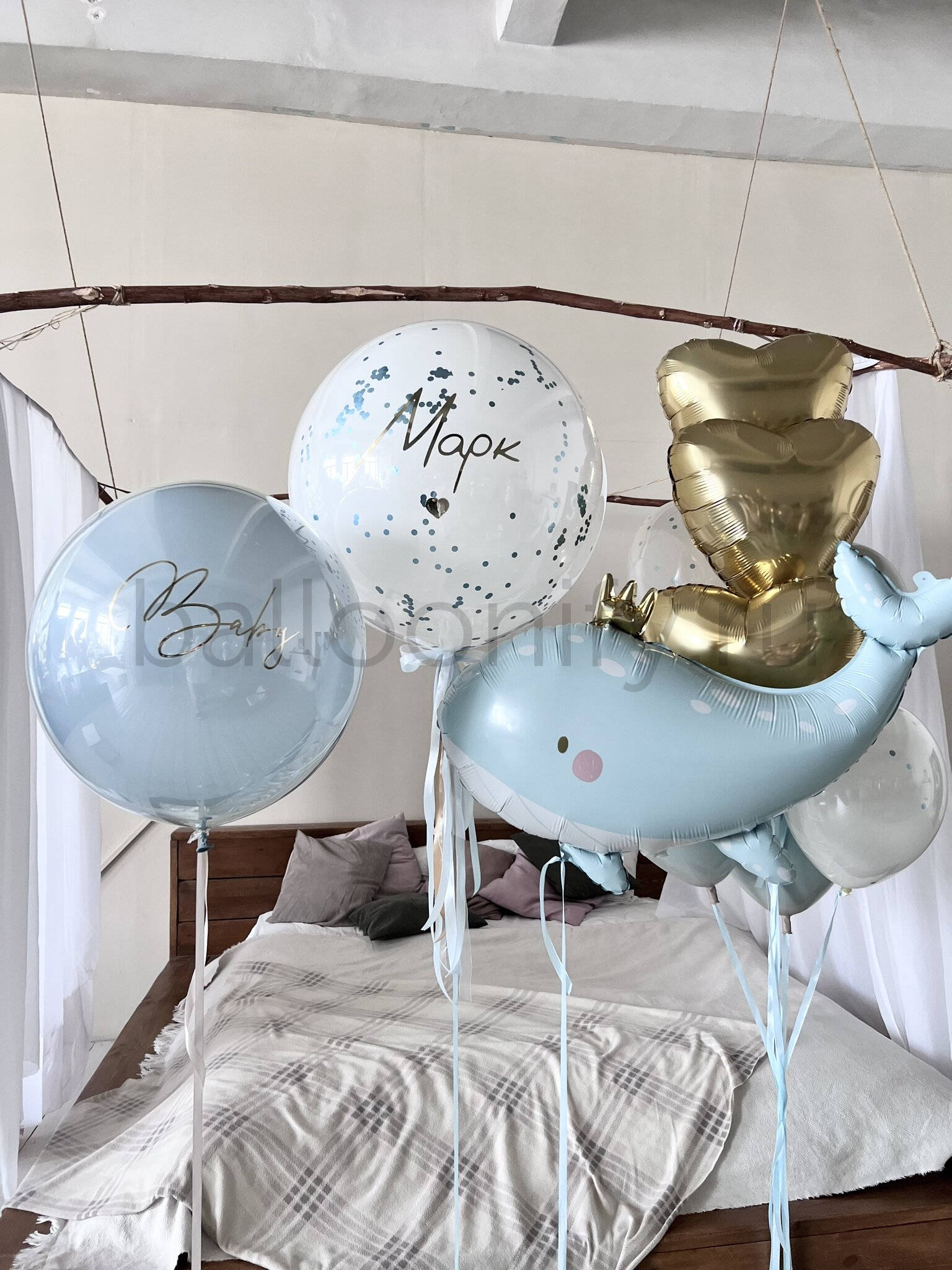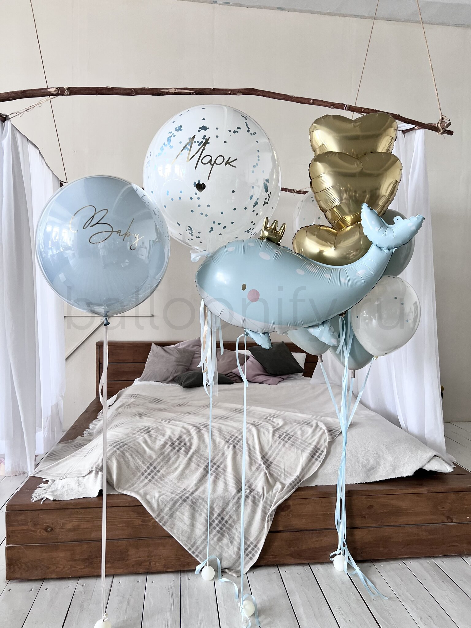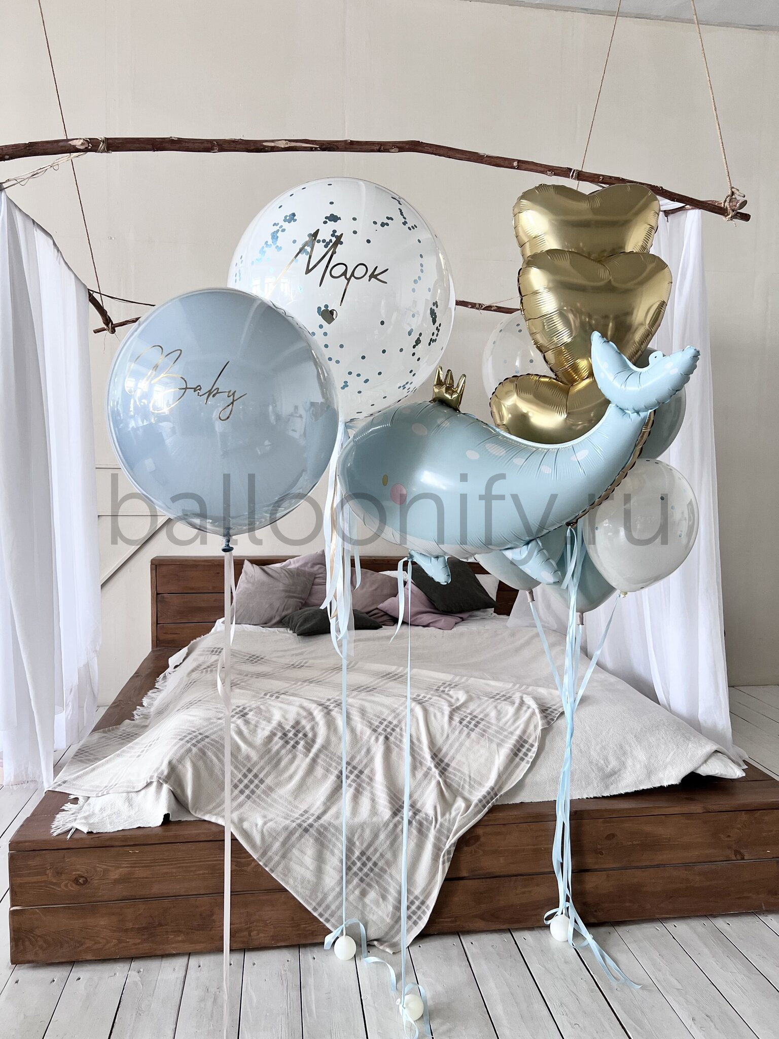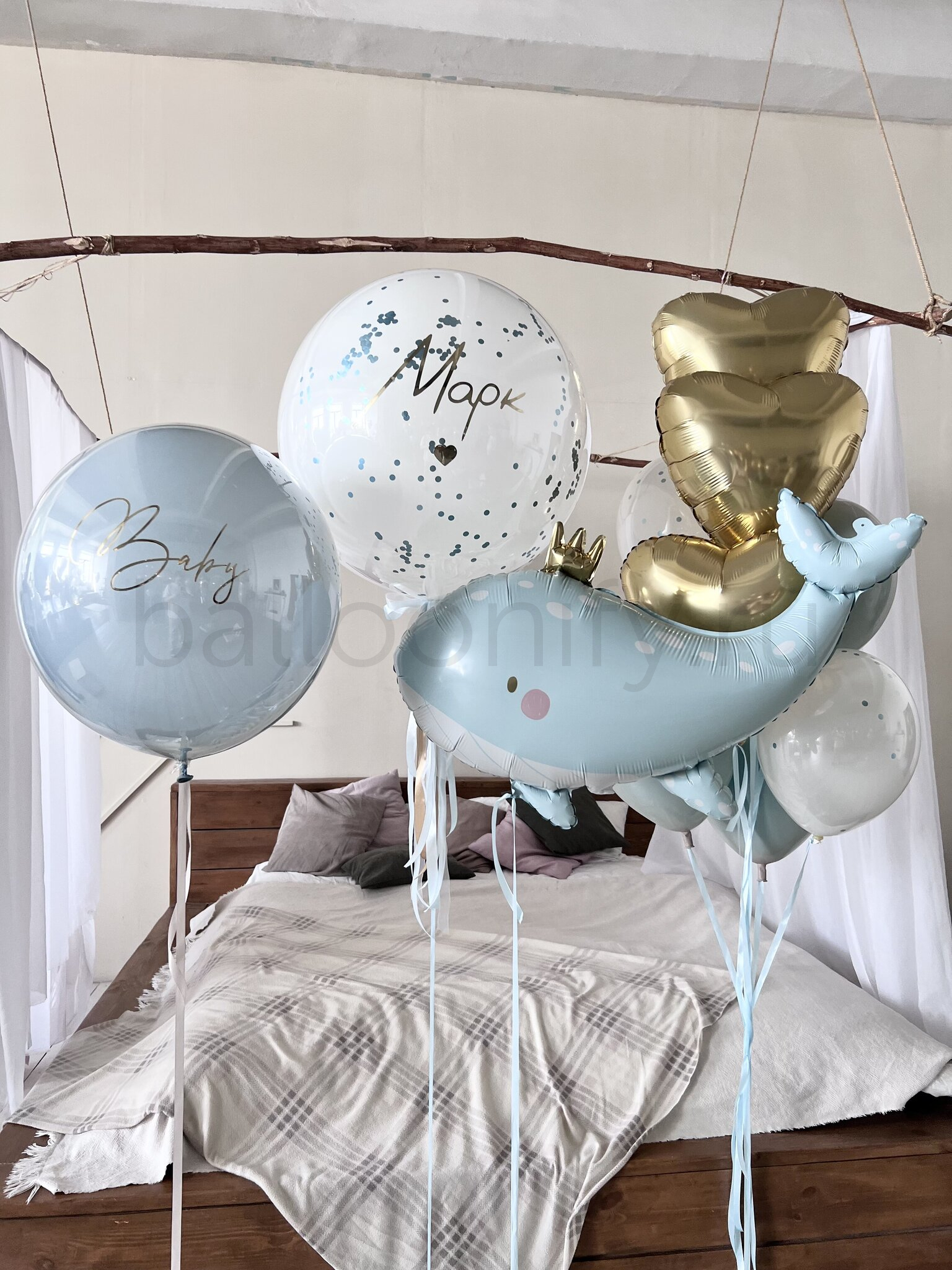 В центре композиции величественно парит огромный голубой кит с короной (91 см), окруженный сияющим стеклянным шаром (61 см). Индивидуальная надпись добавляет персональности и особого смысла вашему торжеству.
