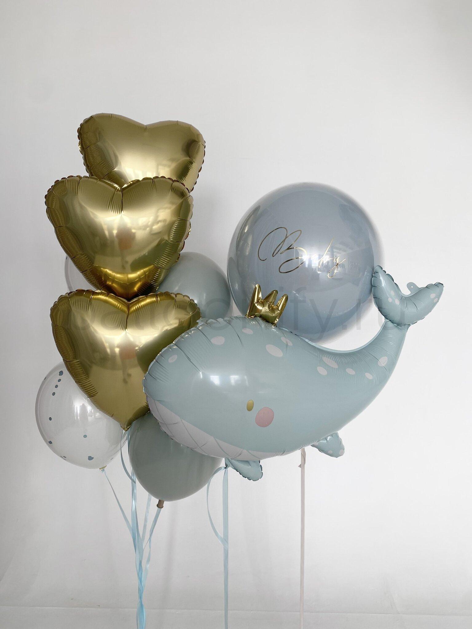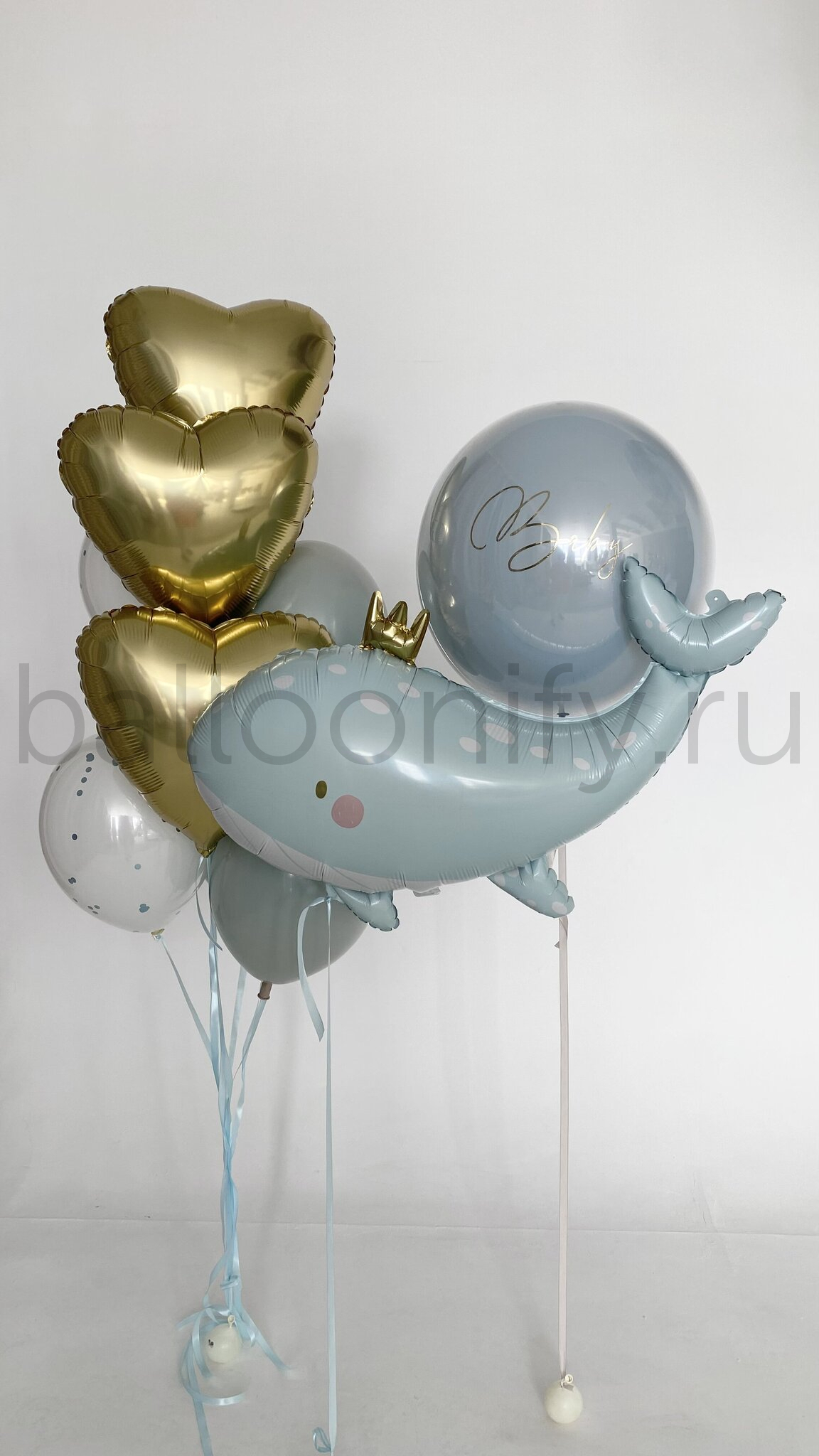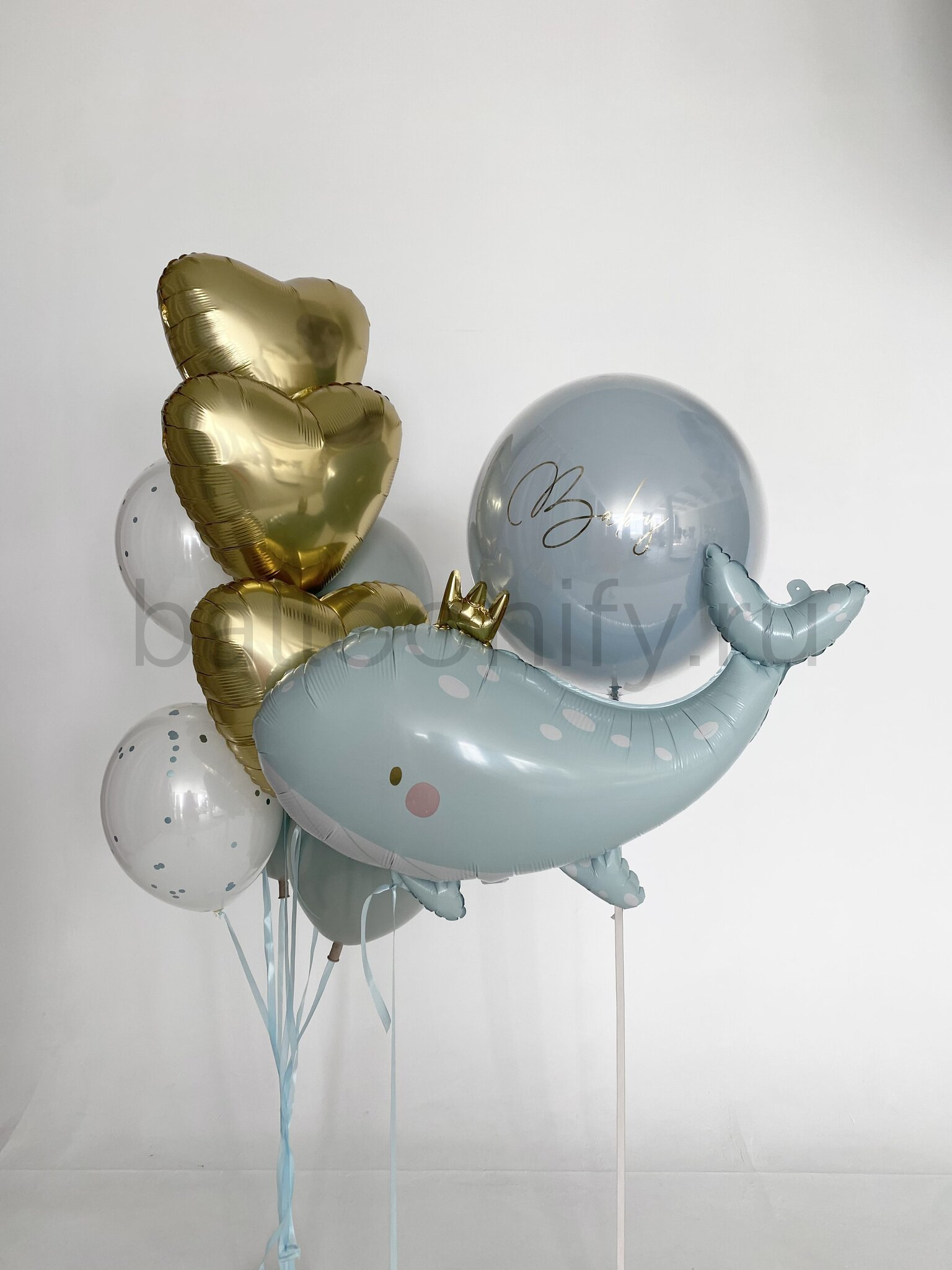 В центре композиции величественно парит огромный голубой кит с короной (91 см), окруженный сияющим стеклянным шаром (61 см). Индивидуальная надпись добавляет персональности и особого смысла вашему торжеству.