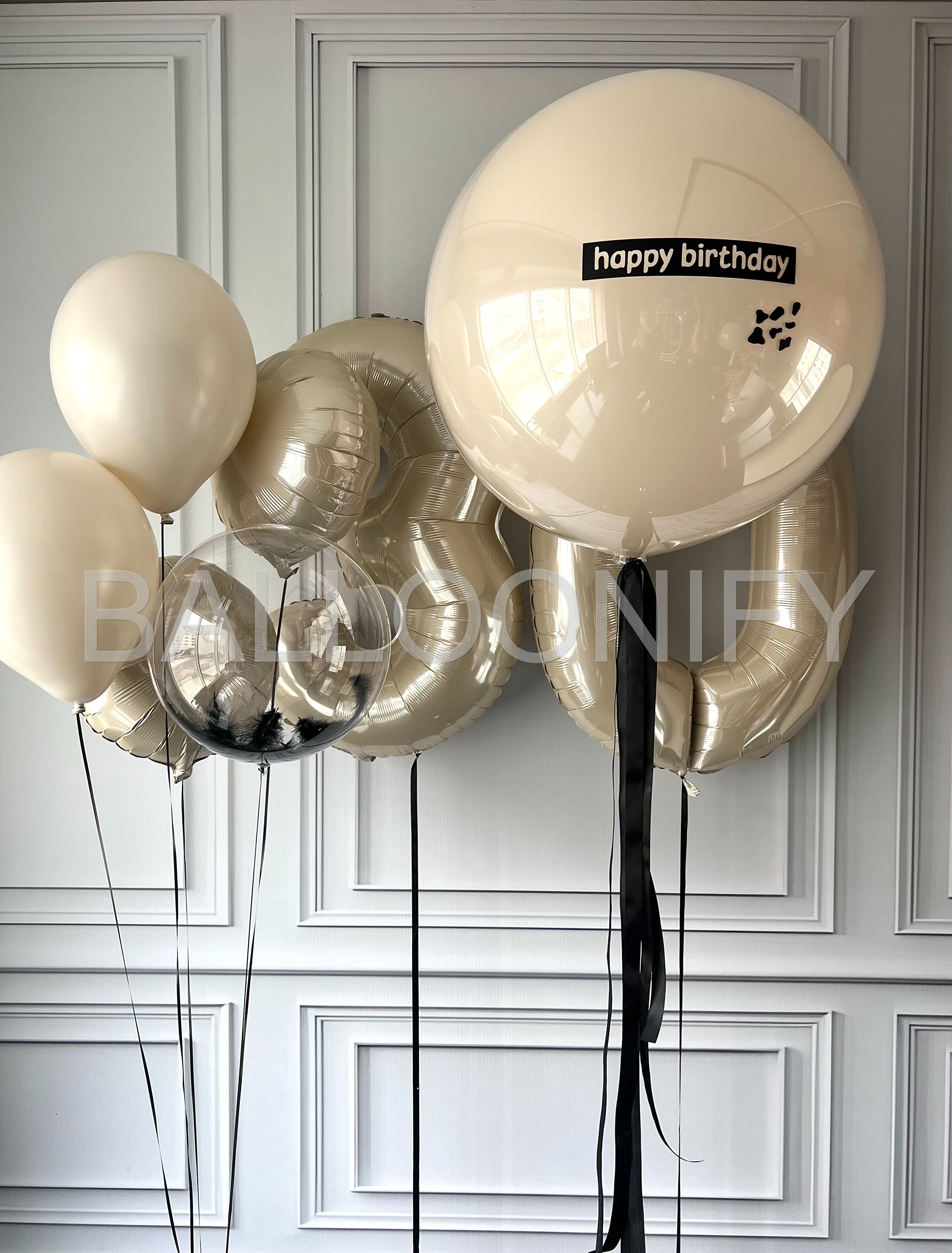 Элегантная композиция из воздушных шаров для празднования дня рождения: в центре — внушительный бежевый шар-гигант с лаконичной чёрной надписью «happy birthday», создающий акцент и задающий торжественный тон и блестящие фольгированные шары в форме цифры «3» и «0». Дополняют его несколько изысканных шаров в нюдовых и кремовых оттенках, а также прозрачный шар с черными перьями. Чёрные ленты придают ансамблю утончённость и завершённость. Минималистичный, но стильный дизайн идеально подойдёт для изысканного поздравления! 🌟