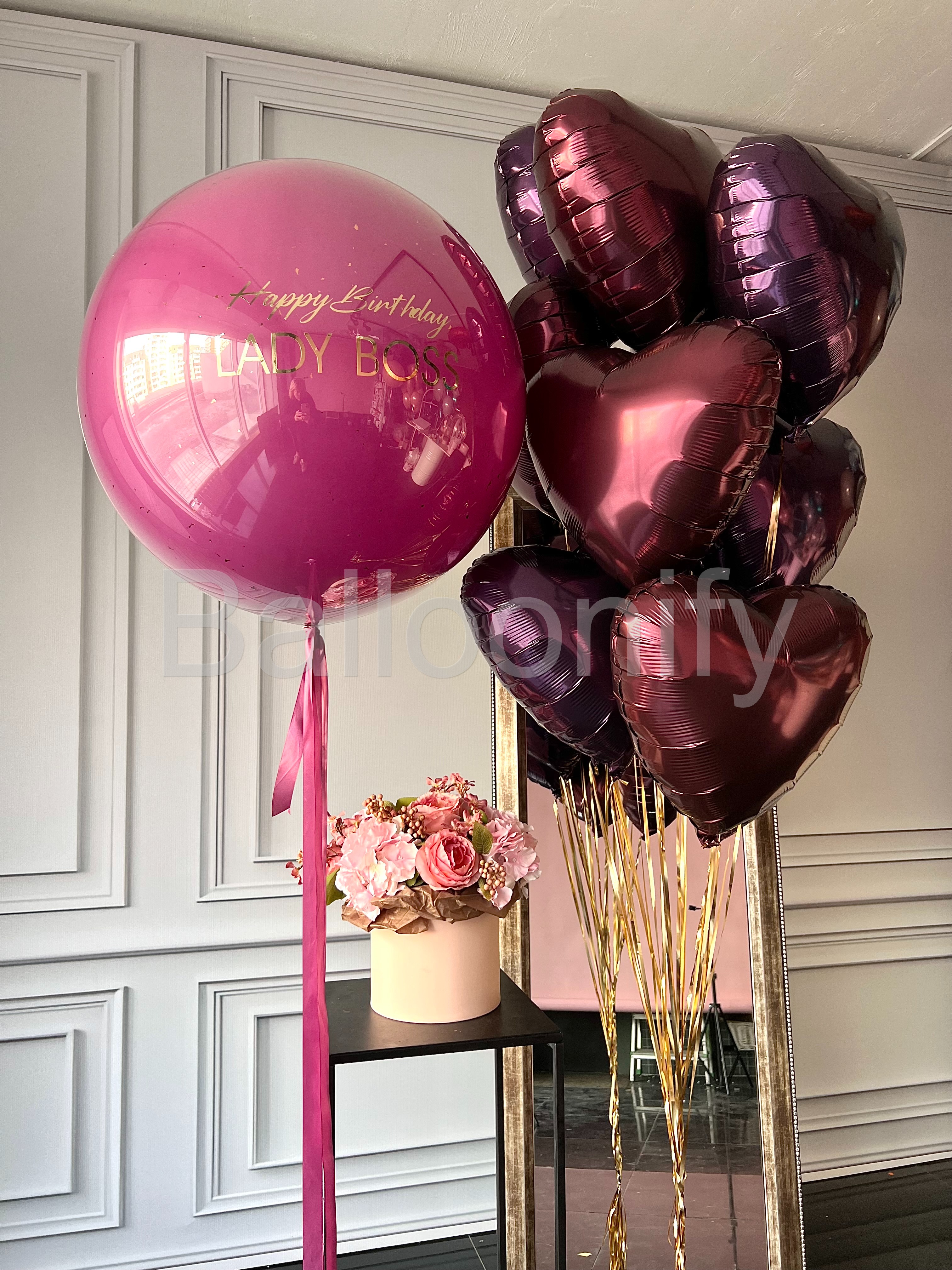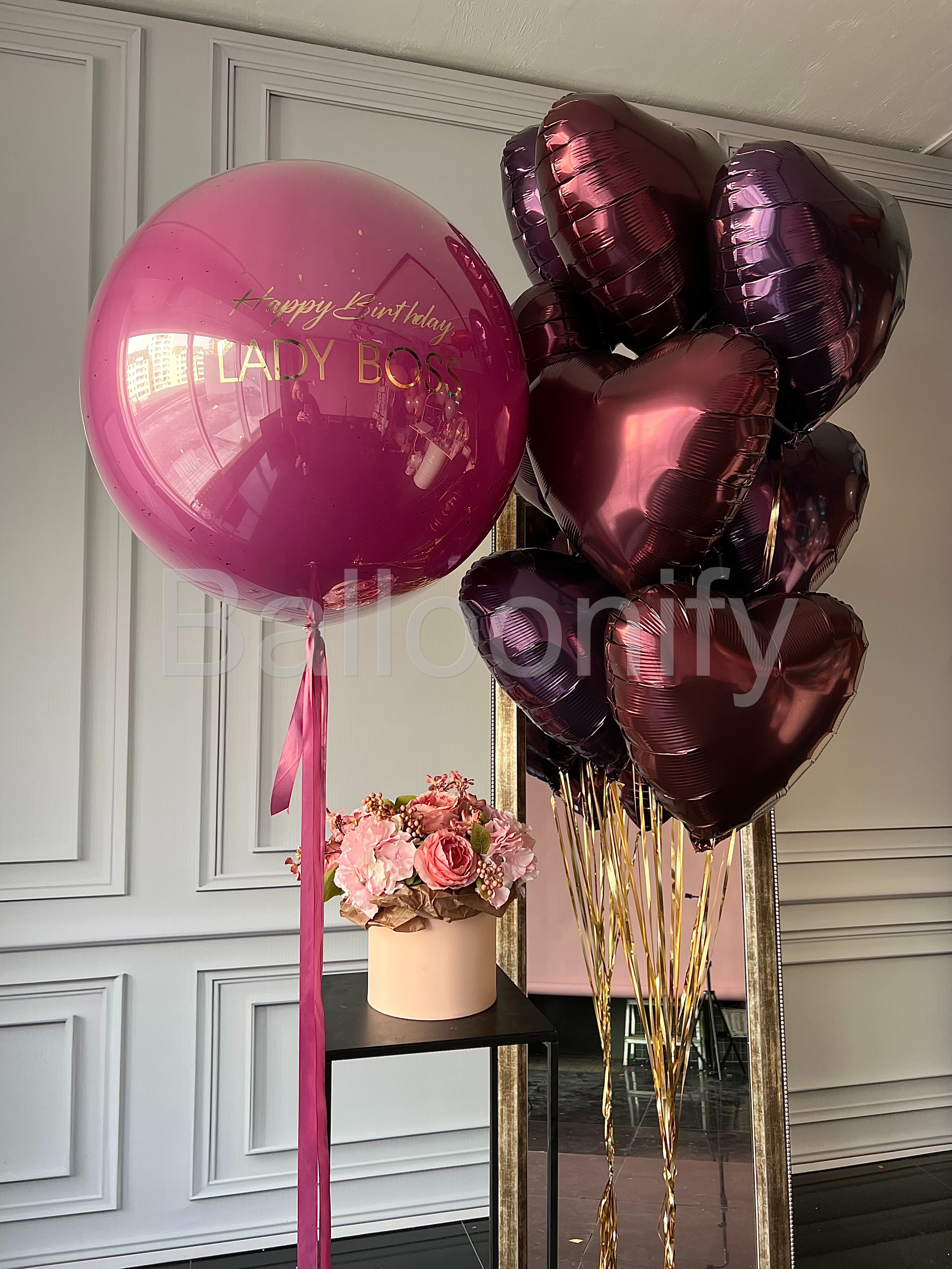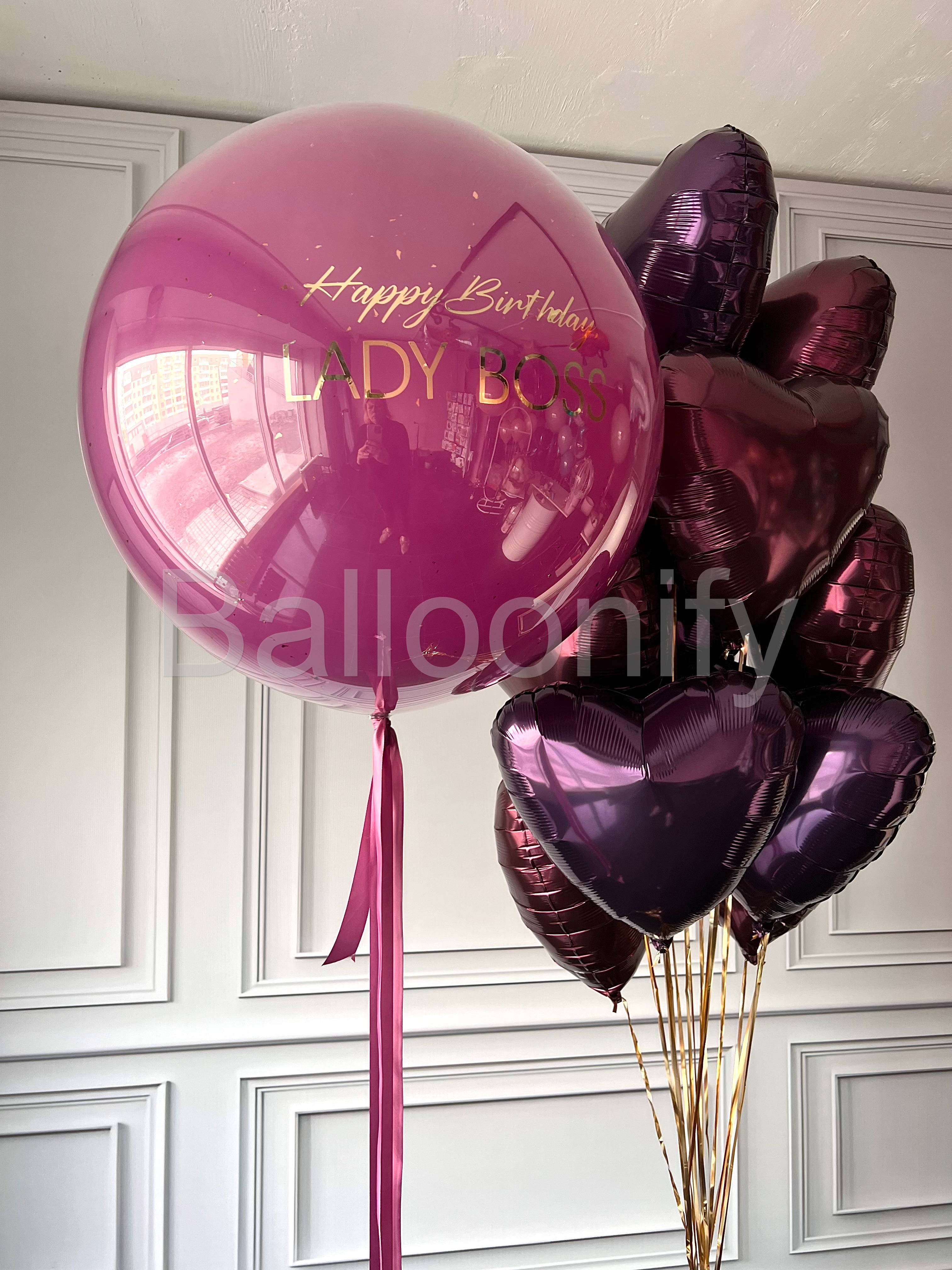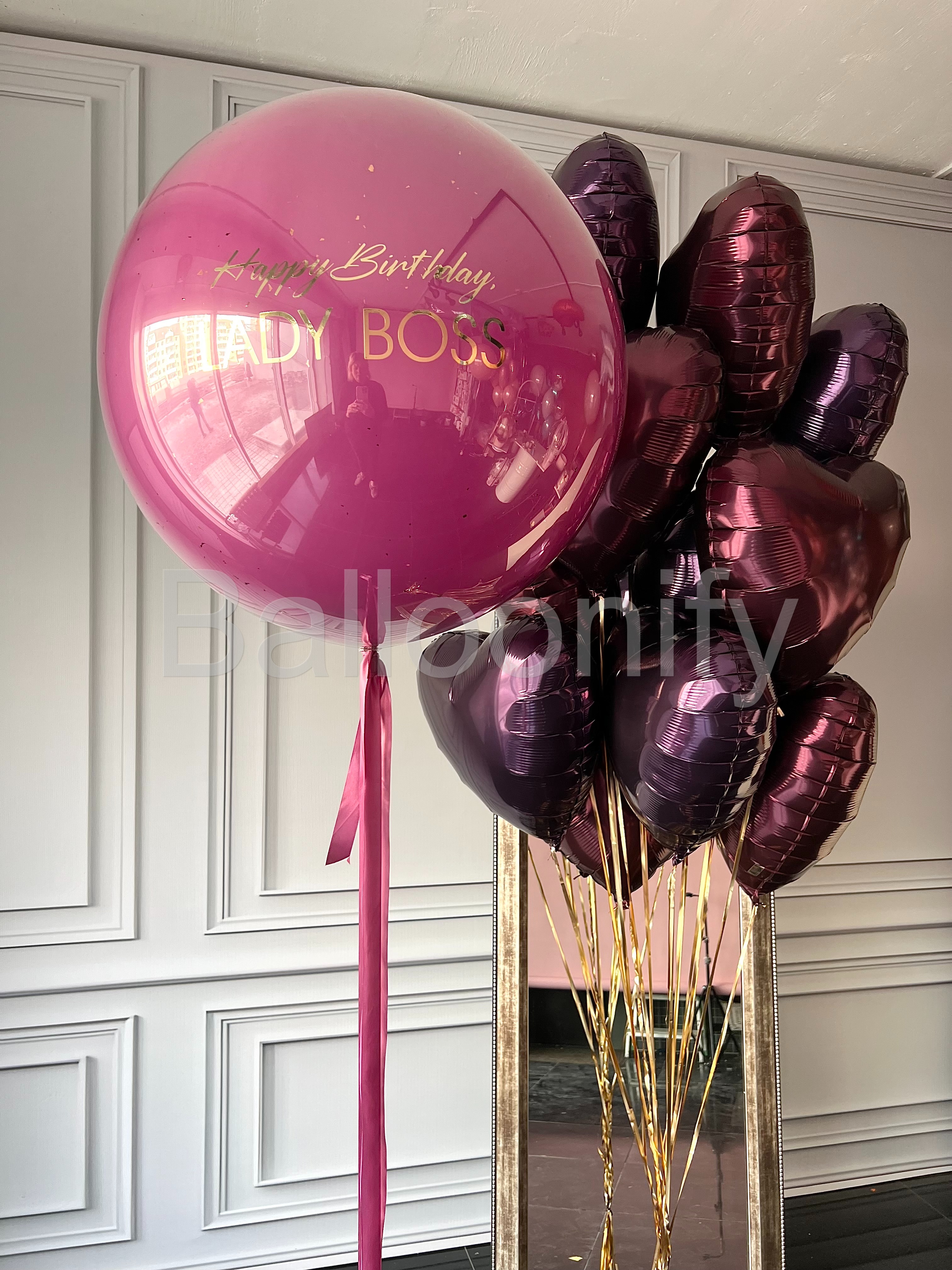 Роскошный букет воздушных шаров для особенного праздника: большой стеклянный шар насыщенного цвета орхидея, с элегантной золотой надписью «Happy Birthday LADY BOSS» в сочетании с блестящими фольгированными шарами в форме сердец глубокого бордового цвета. Идеальное украшение для стильного дня рождения амбициозной именинницы! 🌟