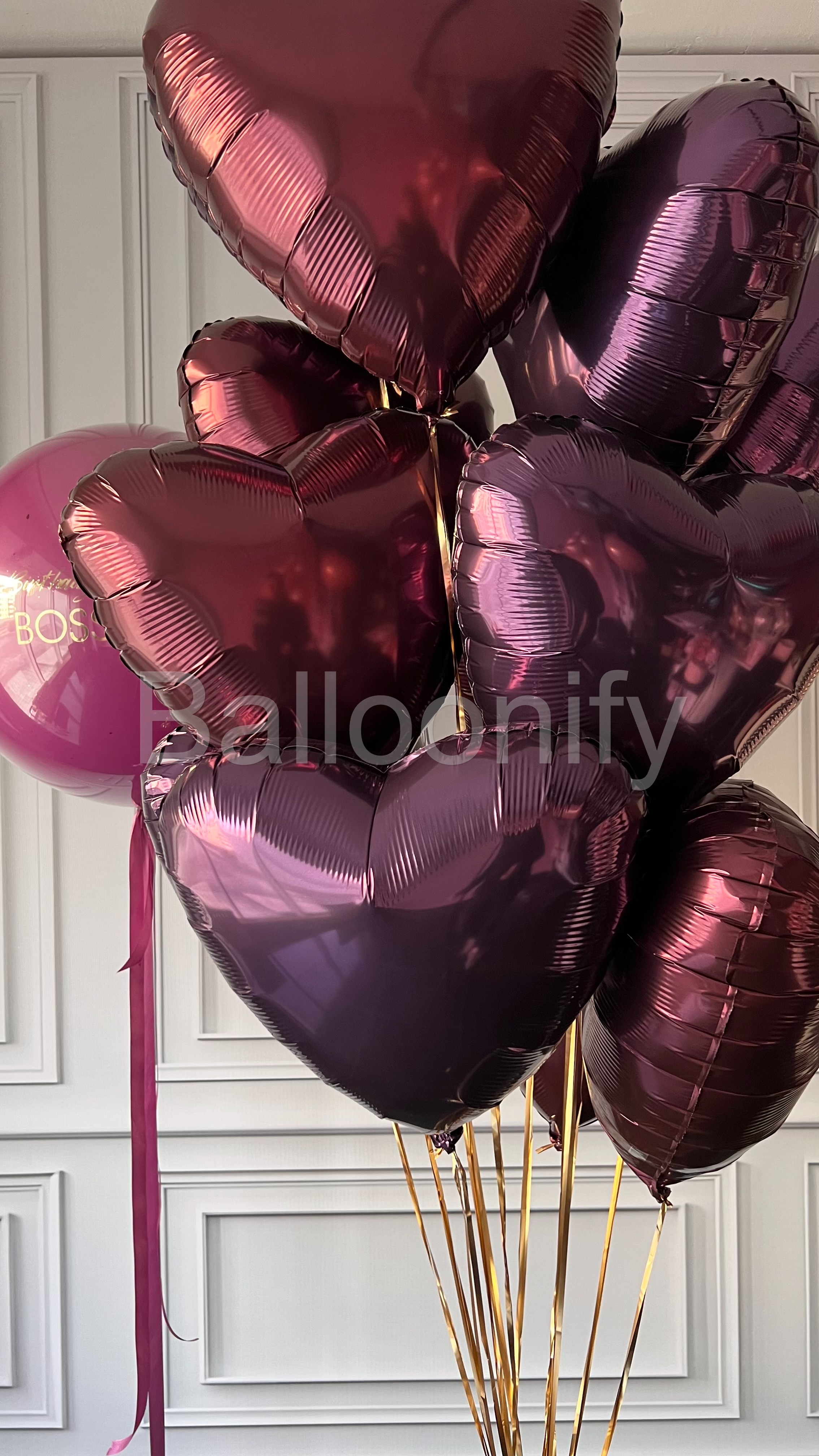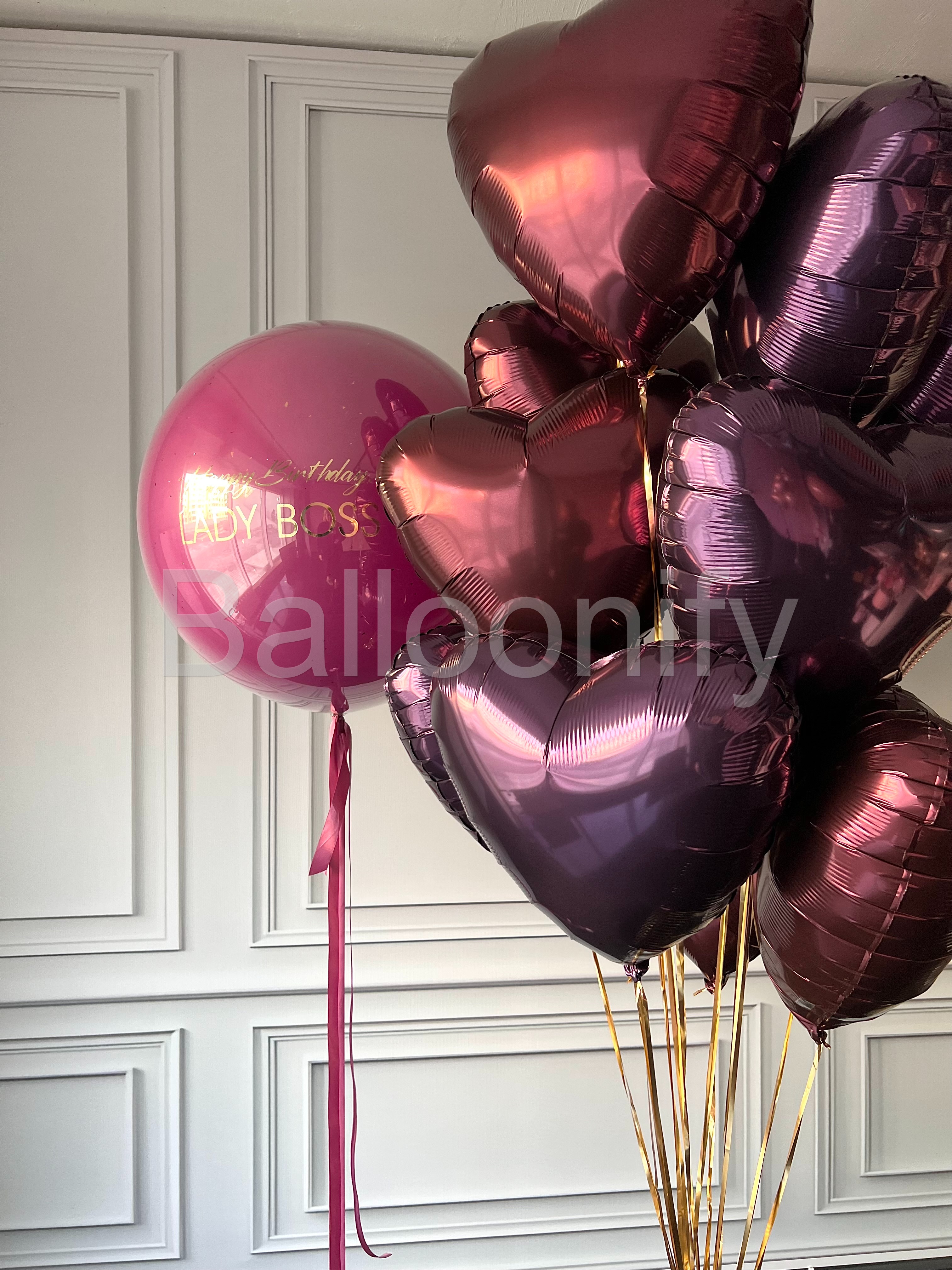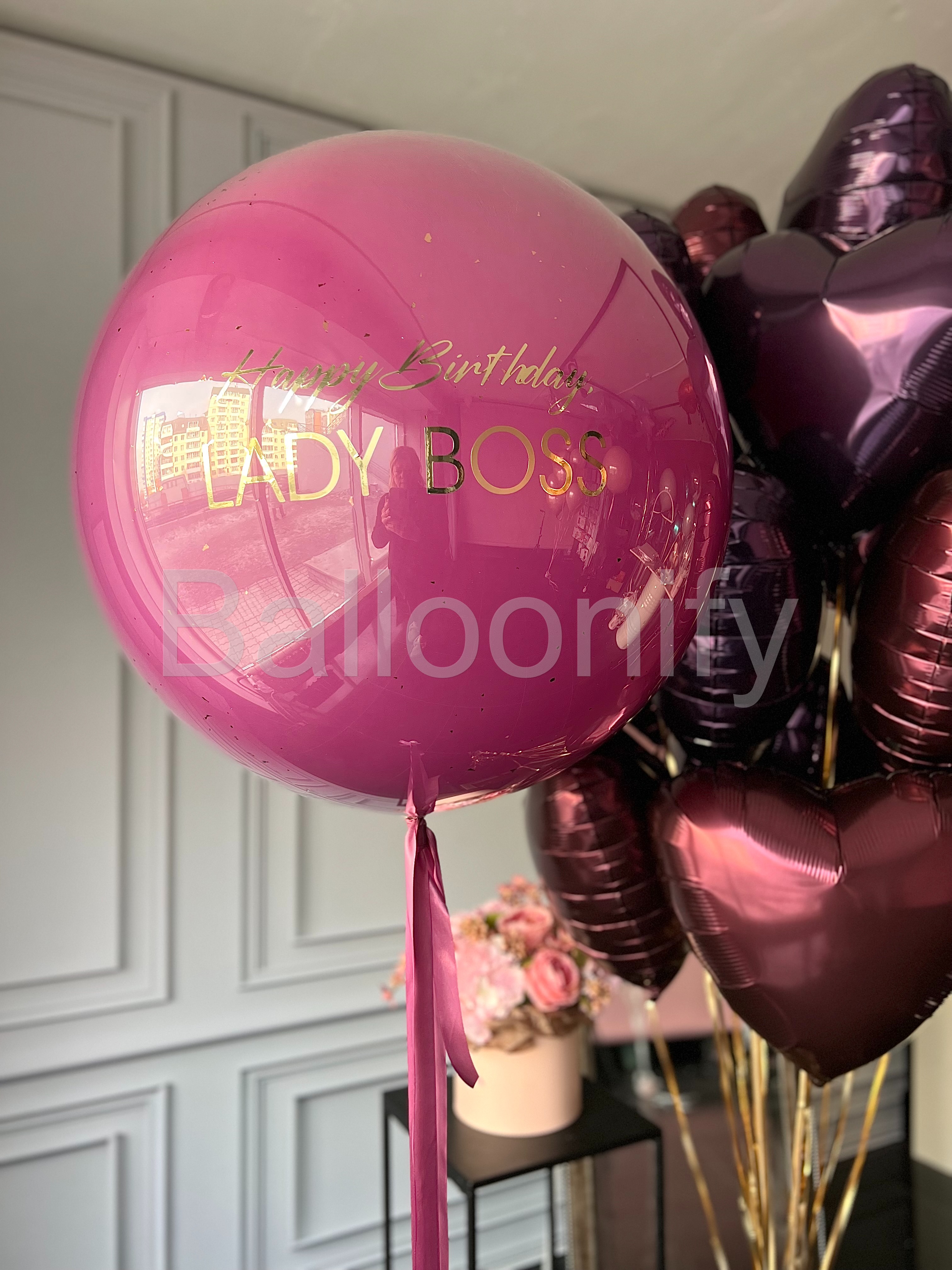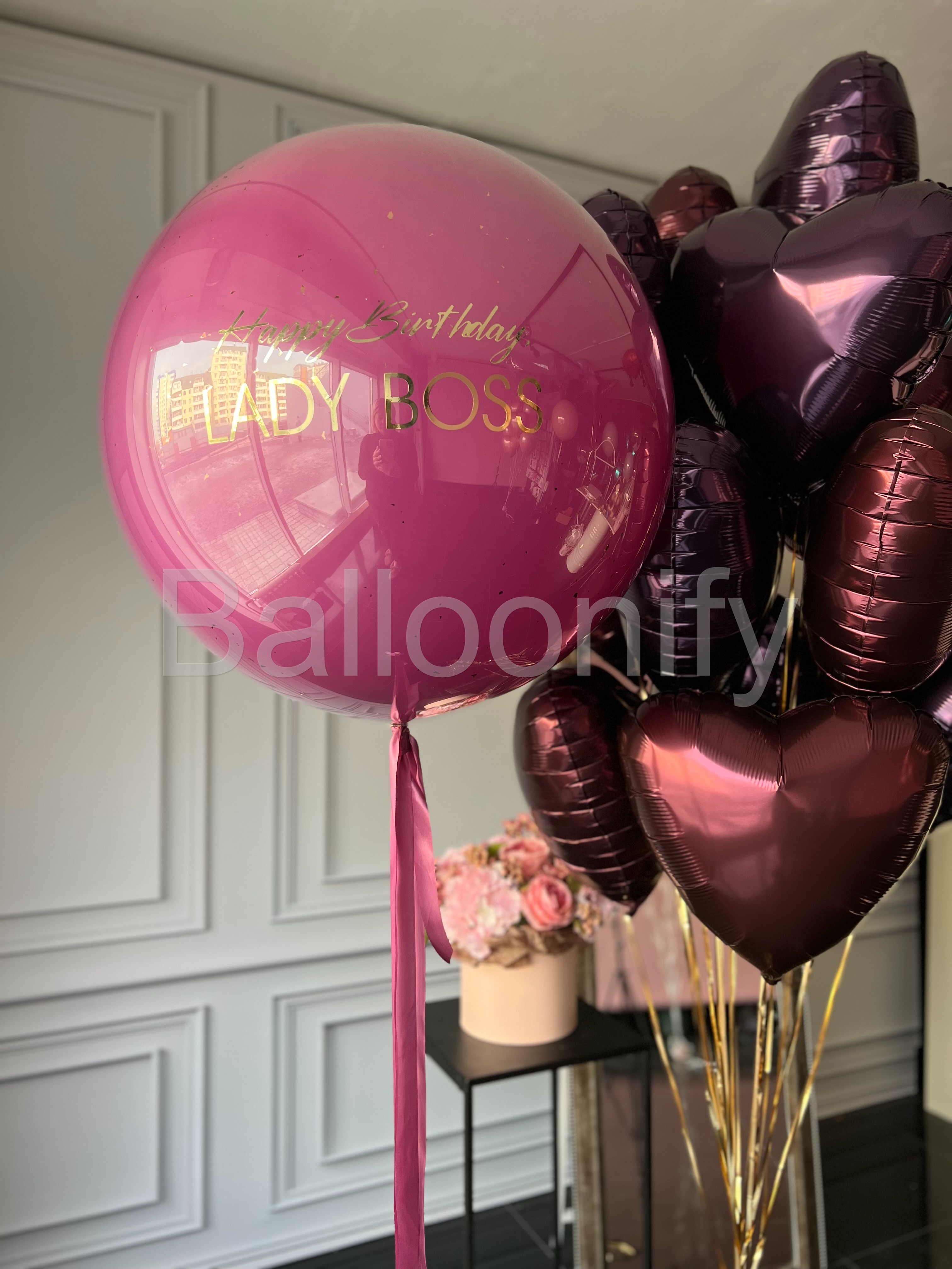 Роскошный букет воздушных шаров для особенного праздника: большой стеклянный шар насыщенного цвета орхидея, с элегантной золотой надписью «Happy Birthday LADY BOSS» в сочетании с блестящими фольгированными шарами в форме сердец глубокого бордового цвета. Идеальное украшение для стильного дня рождения амбициозной именинницы! 🌟