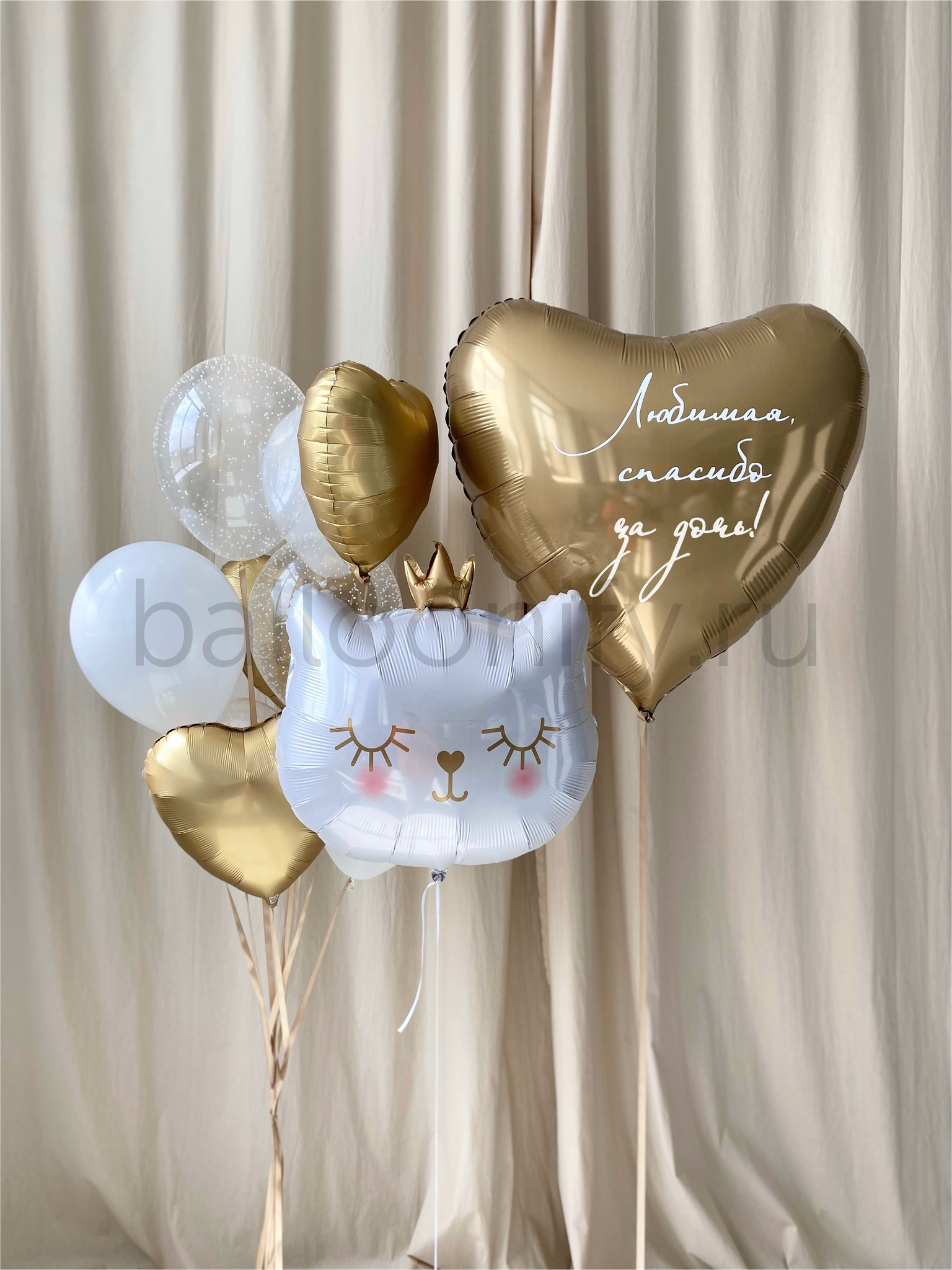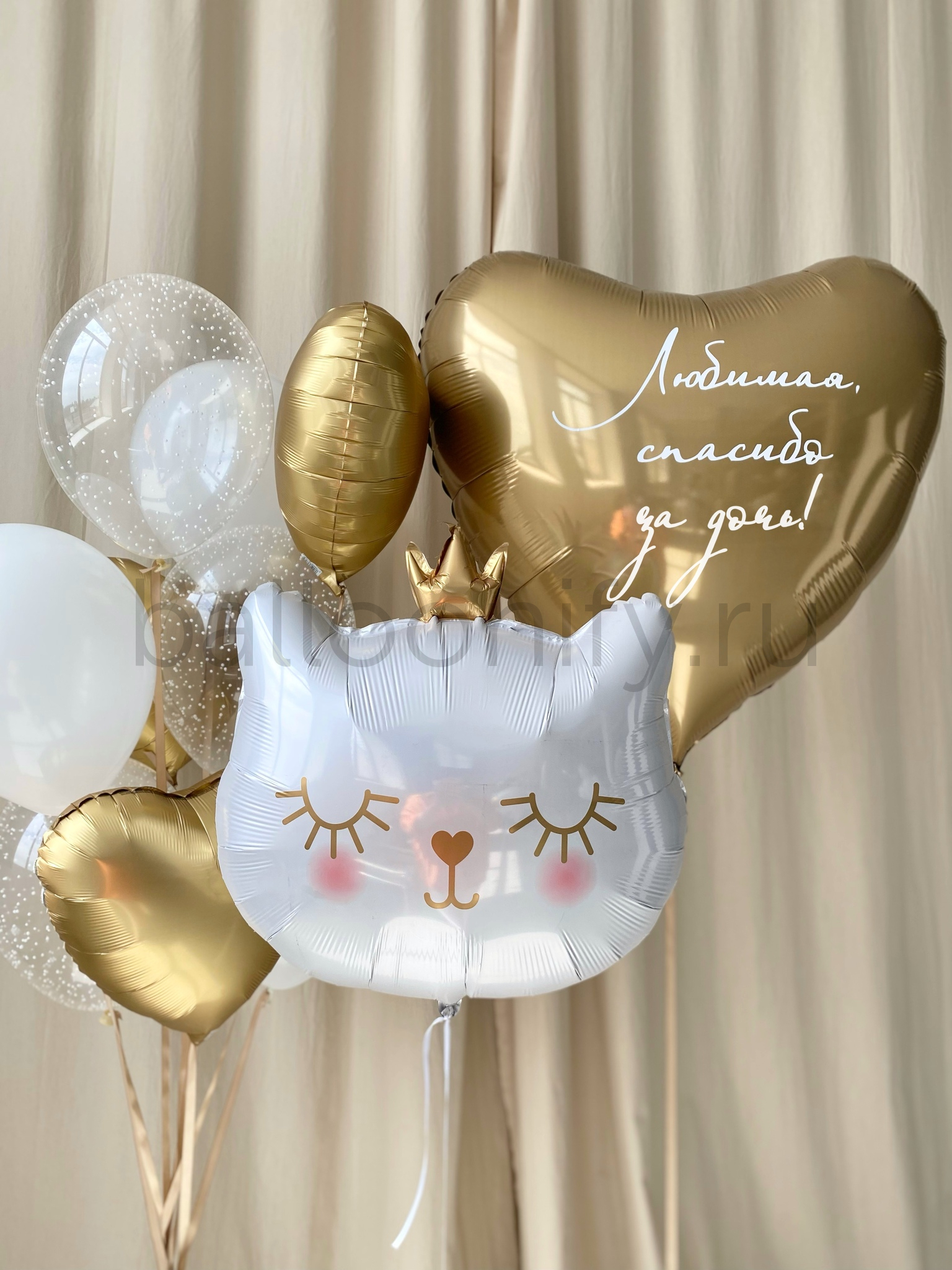 Фонтан белоснежных шаров с золотыми сердечками создает атмосферу праздника и волшебства. Этот подарок идеально подходит для поздравления с рождением малышки и выражения благодарности матери. А изящная фигурка кошечки в короне добавляет нежности и очарования.