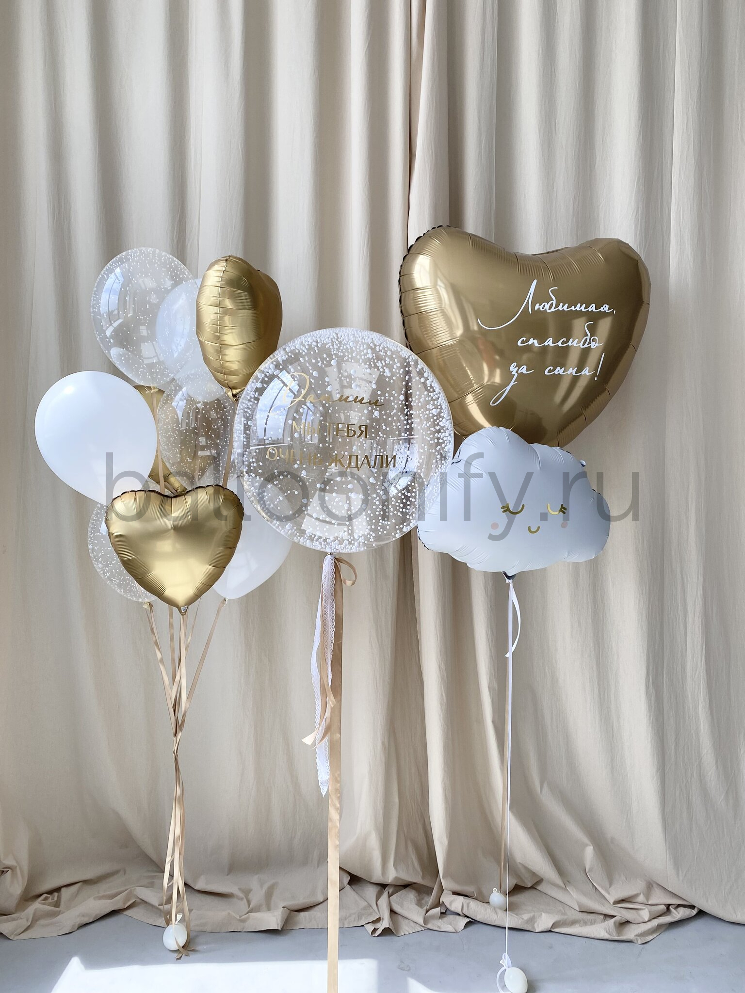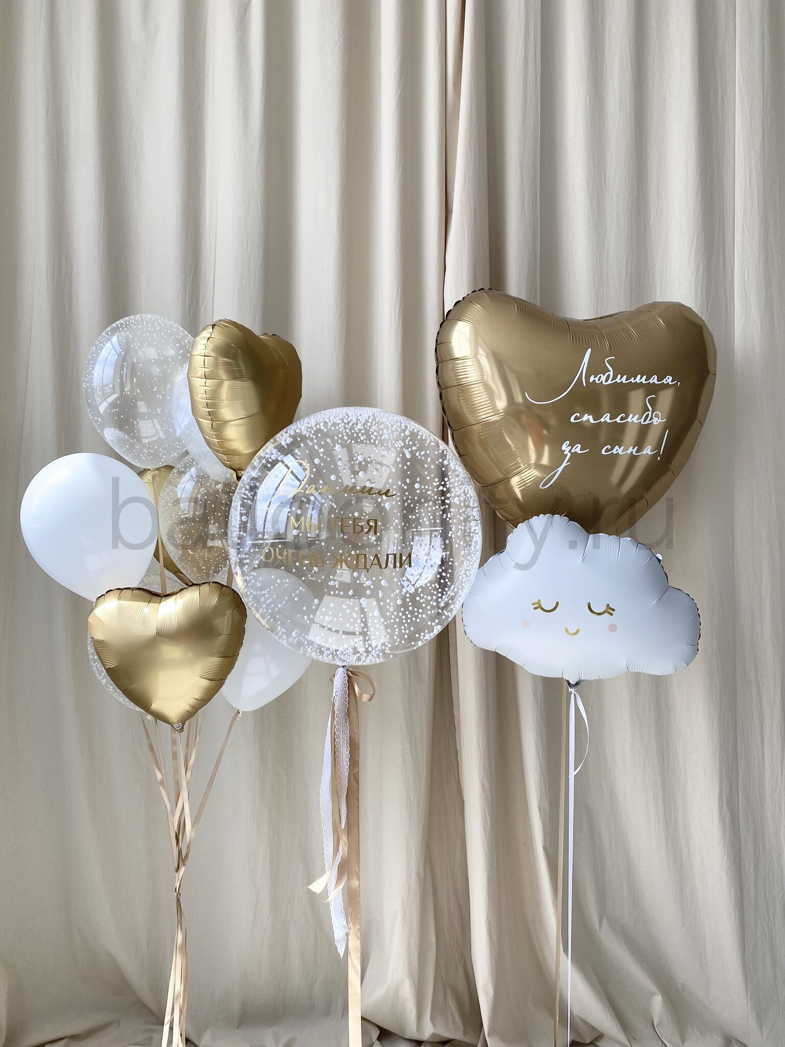 Фонтан белоснежных шаров с золотыми сердечками создает атмосферу праздника и волшебства. Нежное небесное облачко добавляет воздушность и романтичность, а прозрачный баблс с белым пенопластом и надписью “Имя, Мы тебя очень ждали” завершает композицию, приветствуя нового члена семьи в мир безграничной любви.
