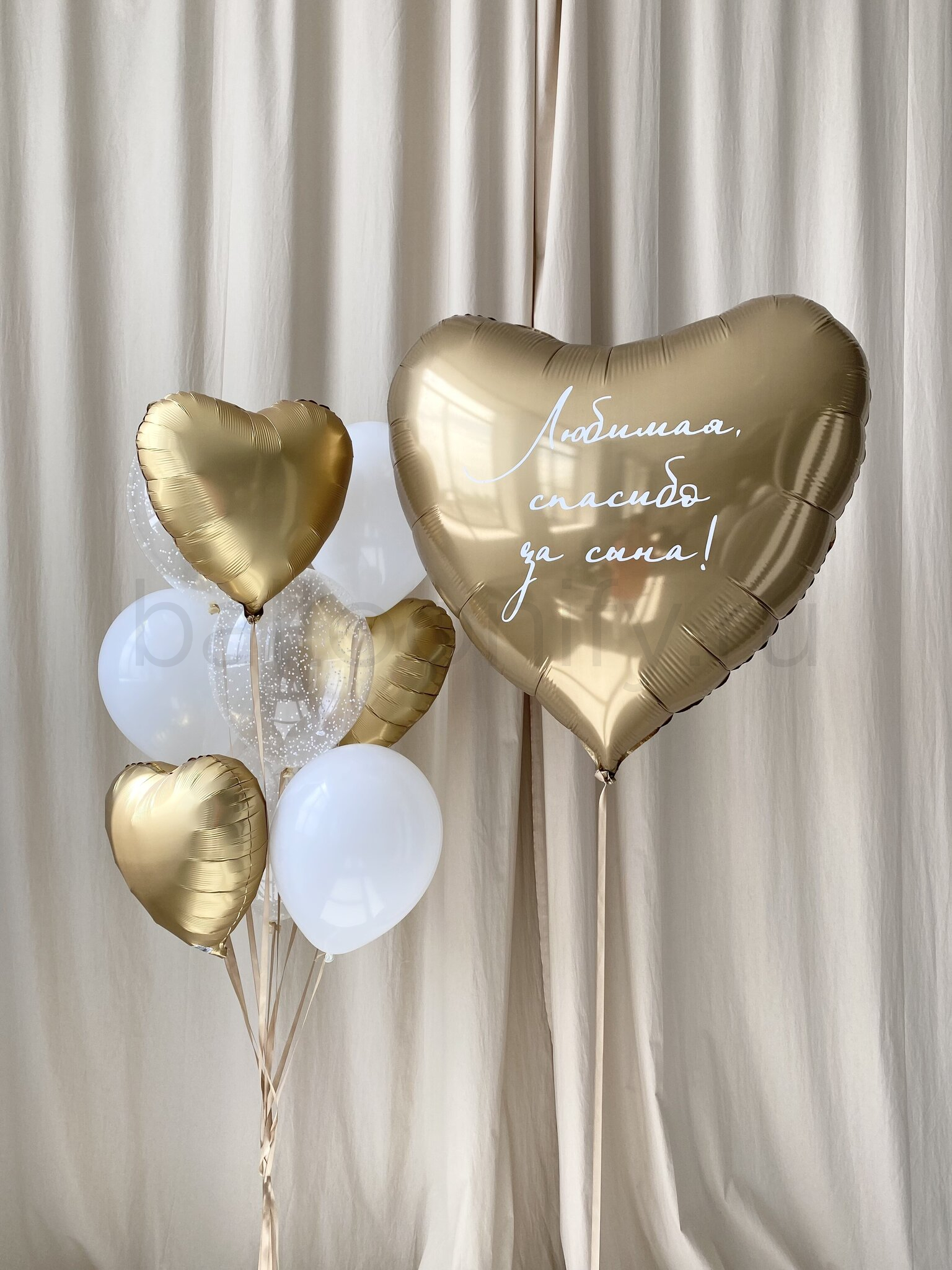 Фонтан белоснежных шаров с золотыми сердечками создает атмосферу праздника и волшебства. Нежное небесное облачко добавляет воздушность и романтичность,