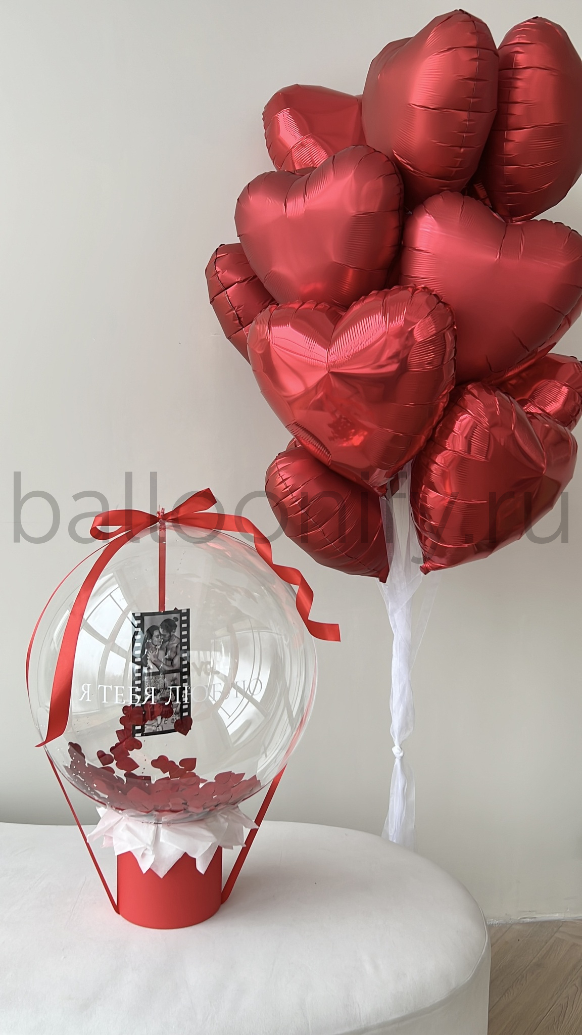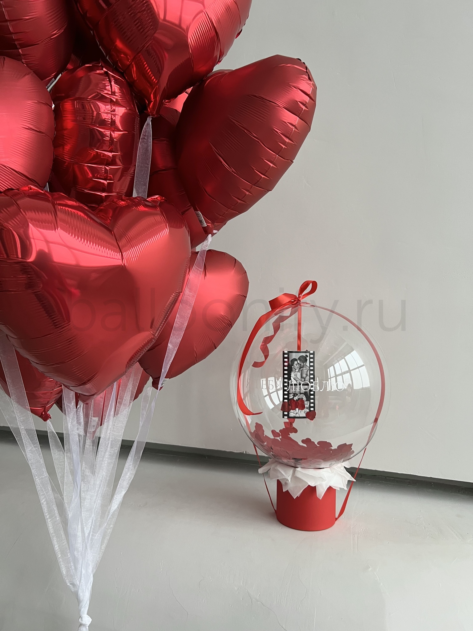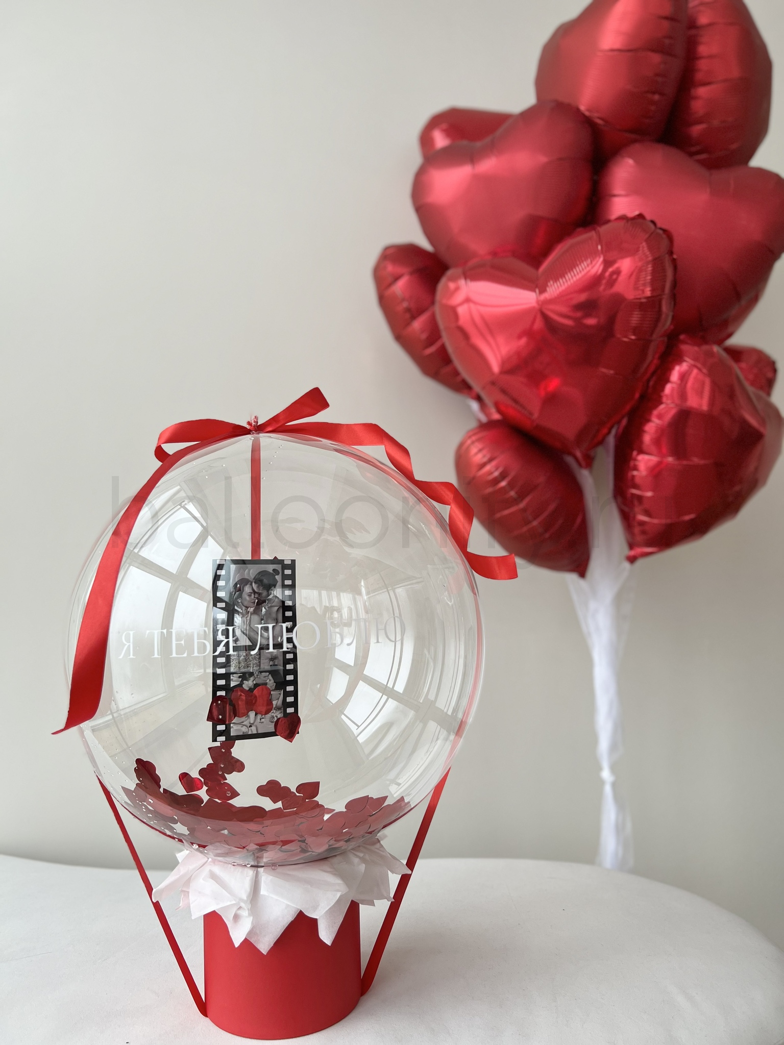 Дизайн коробки выполнен в благородных красно-алых тонах, которые символизируют теплоту, страсть и глубокую привязанность. Главным элементом композиции является прозрачный воздушный шар, наполненный гелием, который создает завораживающий эффект парящего облака над коробкой. А внутри шара располагается особая композиция - Ваше фото!