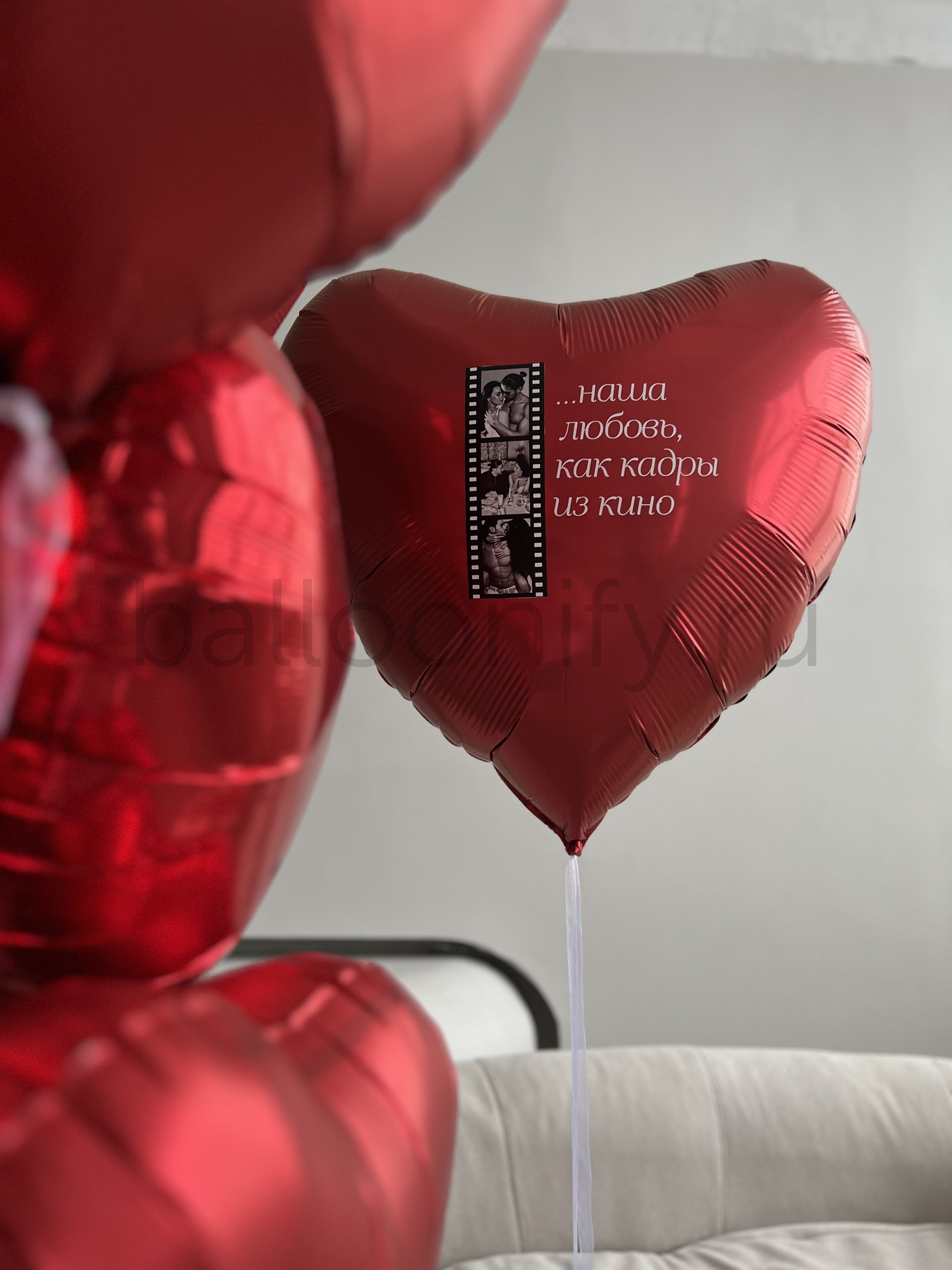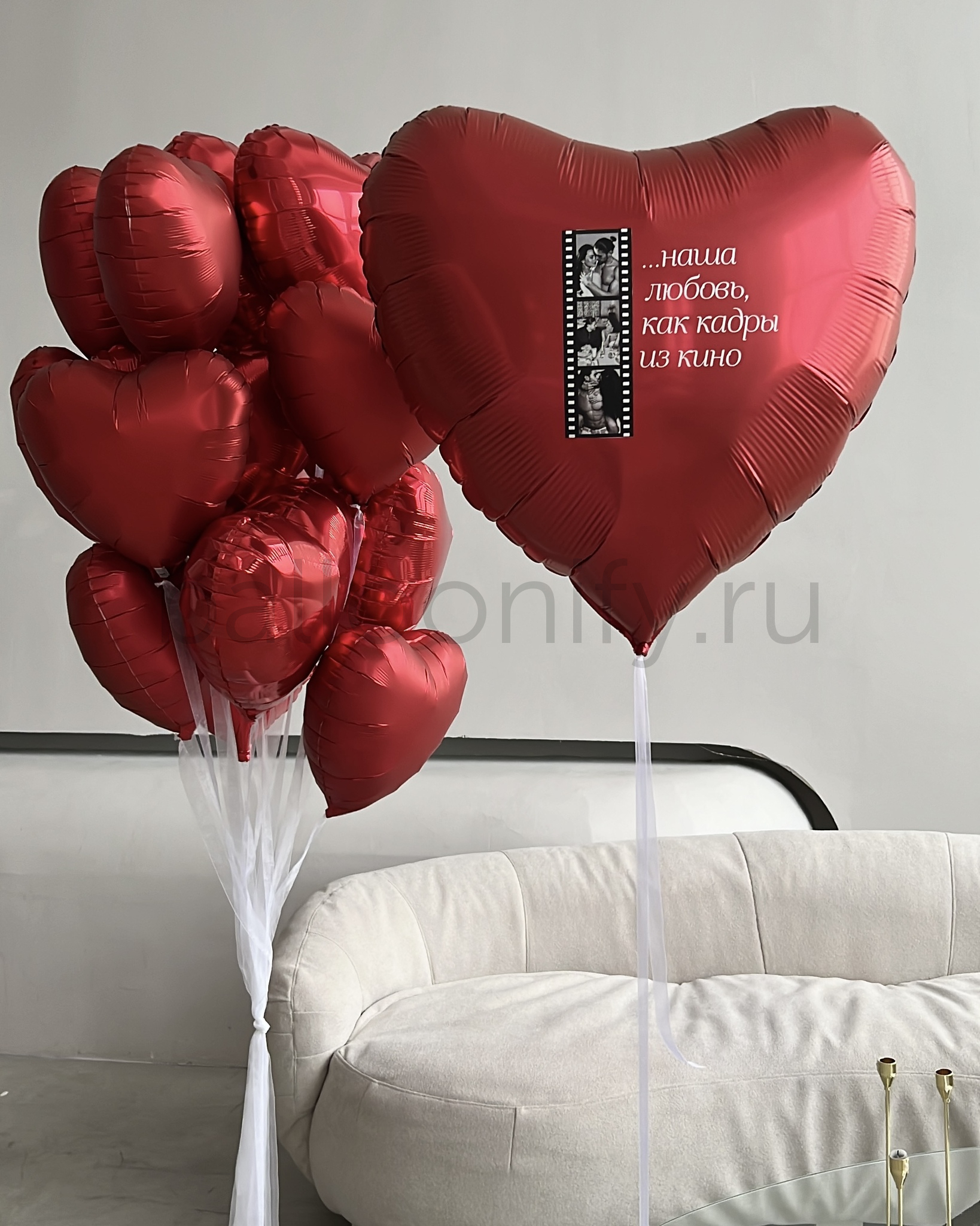 Этот набор создаст незабываемую атмосферу романтического фильма в реальности! Величественное большое сердце с Вашим фото, в виде кадров кинопленки, станет центральным элементом композиции, а россыпь фольгированных сердечек 46 см - добавит игривости и легкости.