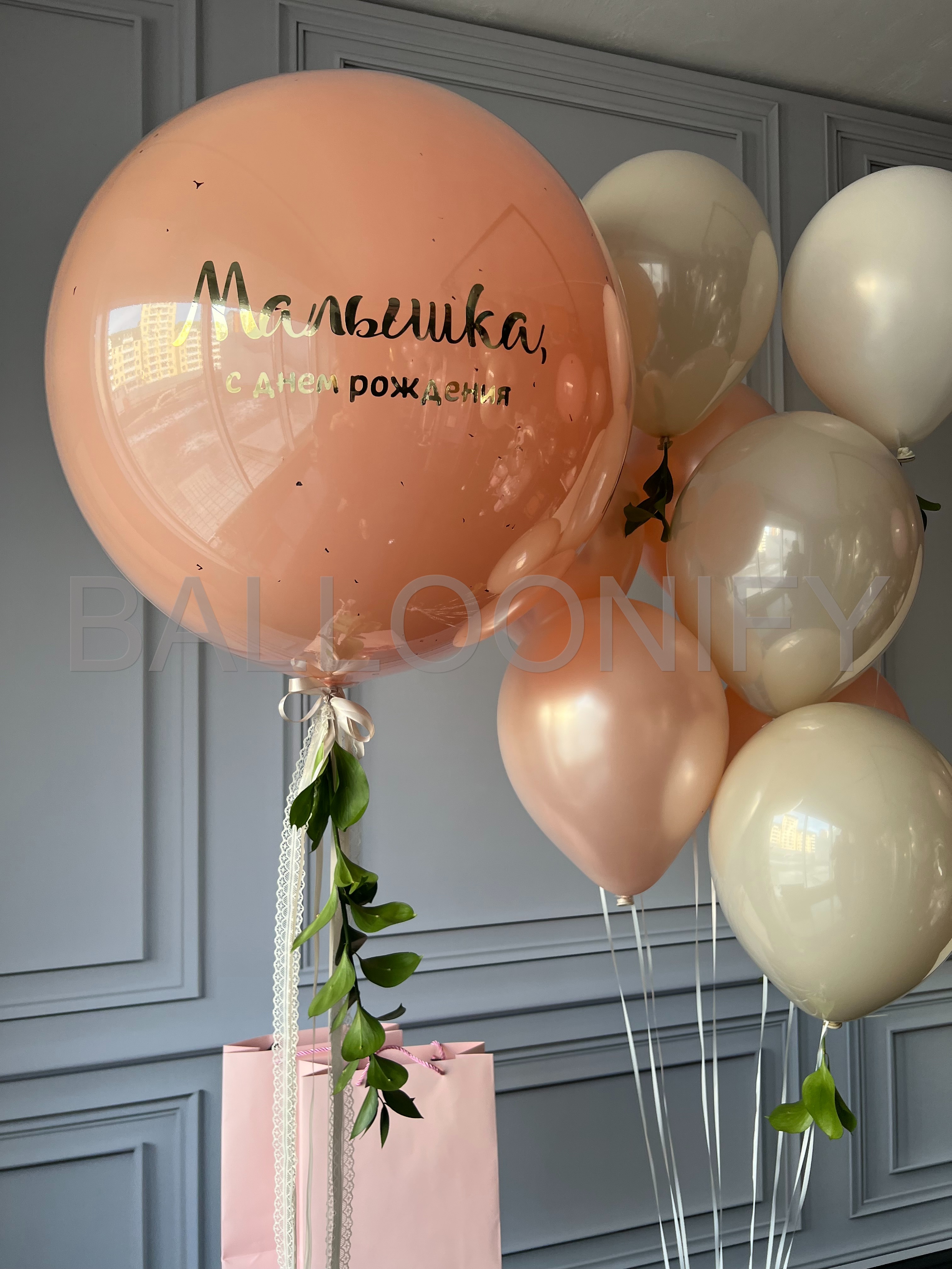 Нежная композиция из воздушных шаров в пастельных тонах — идеальный способ поздравить маленькую принцессу с днём рождения! В центре — огромный персиковый шар с трогательной золотой надписью «Малышка, с днём рождения», окружённый шарами кремового и персикового оттенков. Украшена зеленью и изящными лентами. Создаст атмосферу уюта и радости на празднике. 🌟