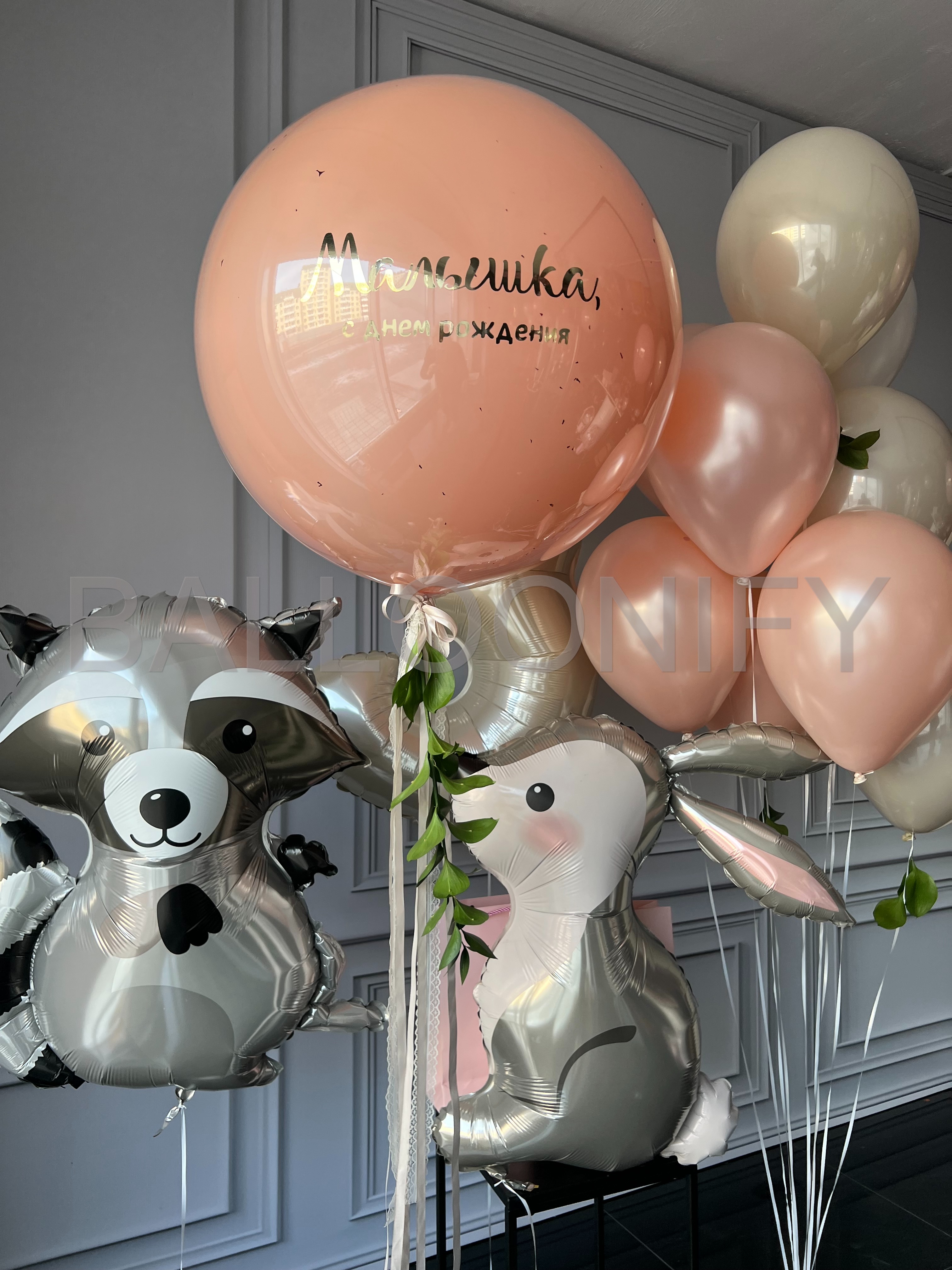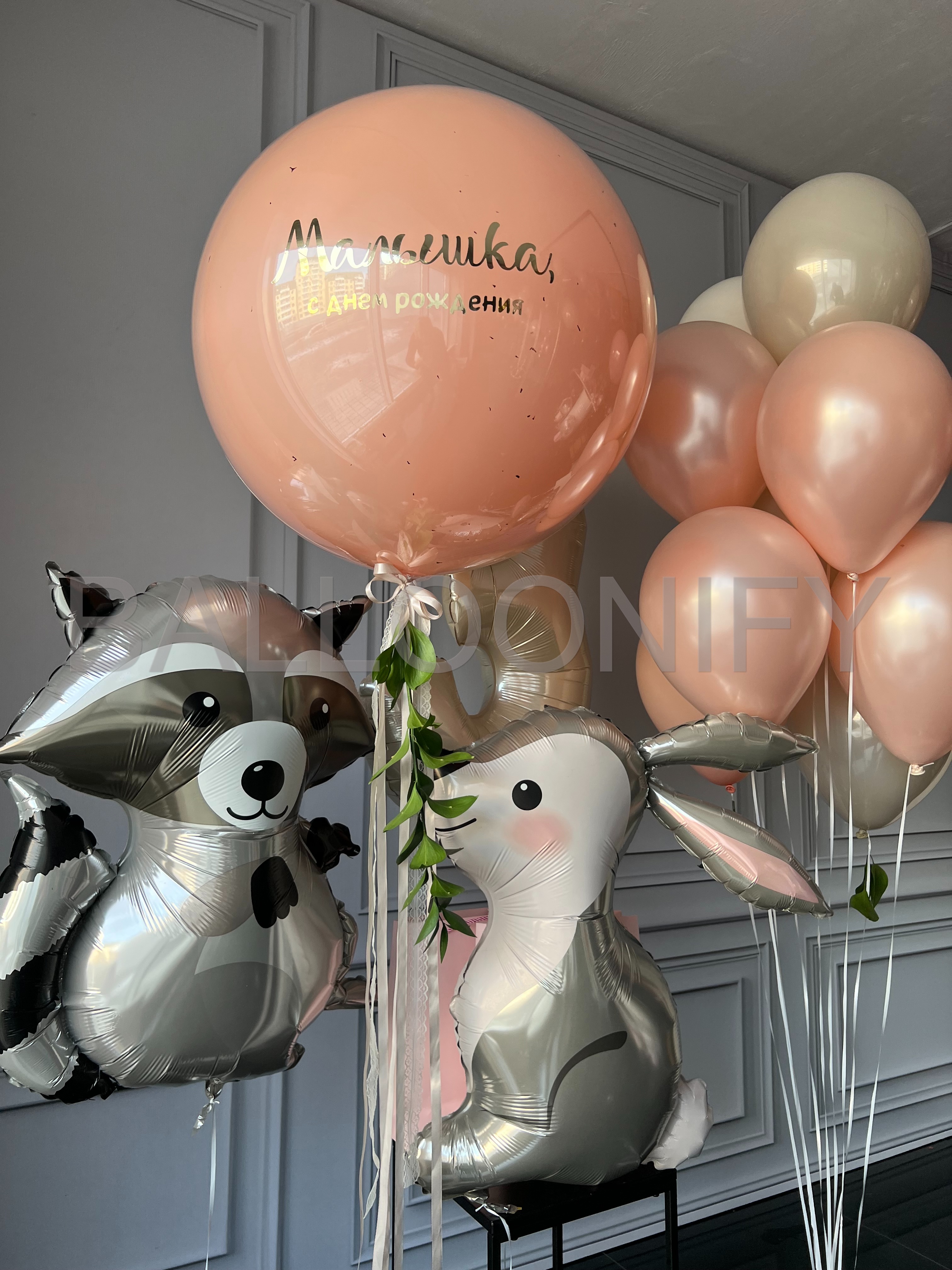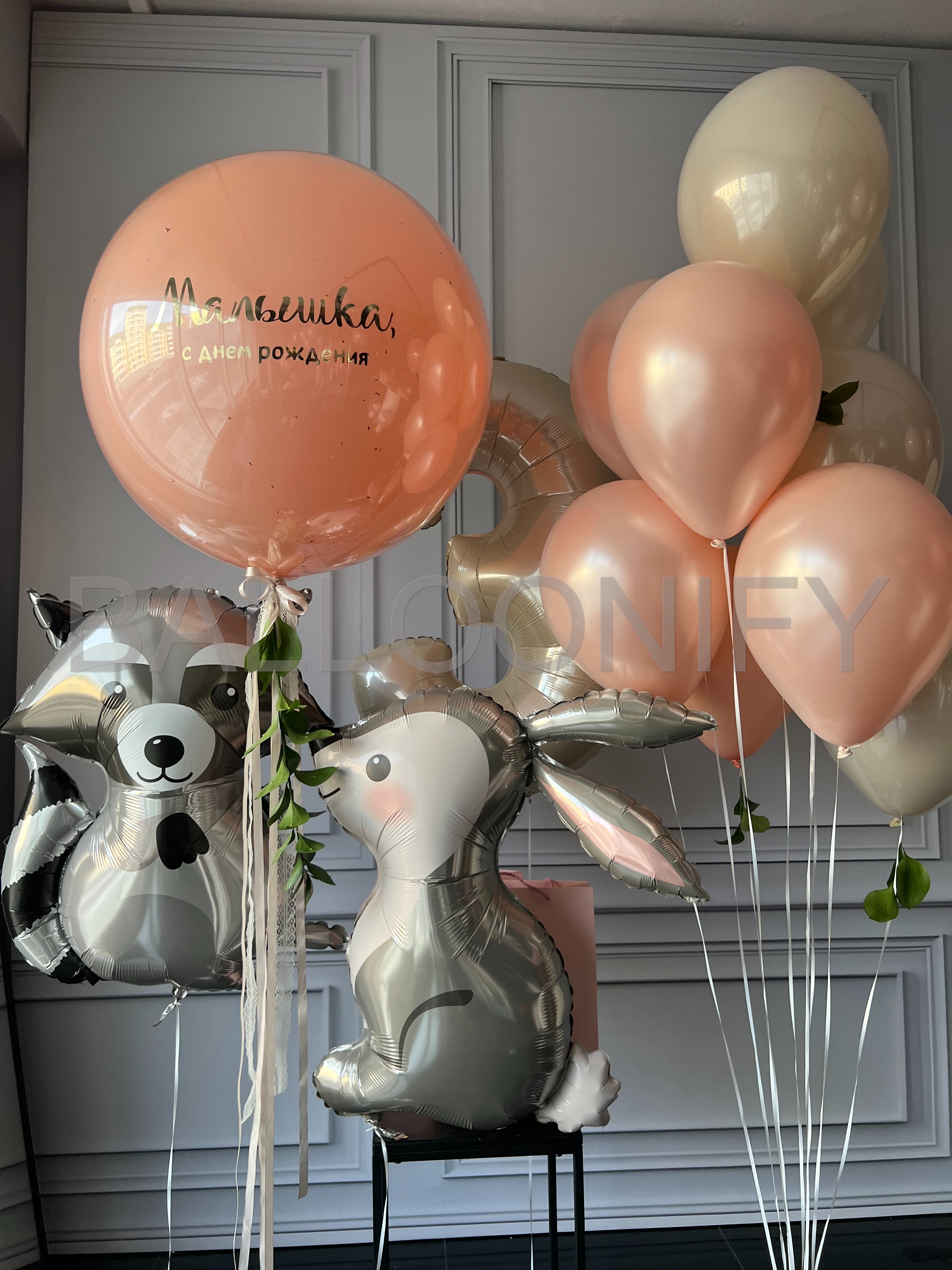 Нежная и очаровательная композиция из воздушных шаров для детского дня рождения: огромный персиковый шар с трогательной надписью «Малышка, с днём рождения», блестящие шары пастельных оттенков (персиковый, кремовый, песочный), фольгированные шары в виде милых зверушек — енота и зайчика, а также шар в виде цифры. Украшена изящными лентами и зеленью. Создаст волшебную атмосферу на празднике вашей малышки. 🌟