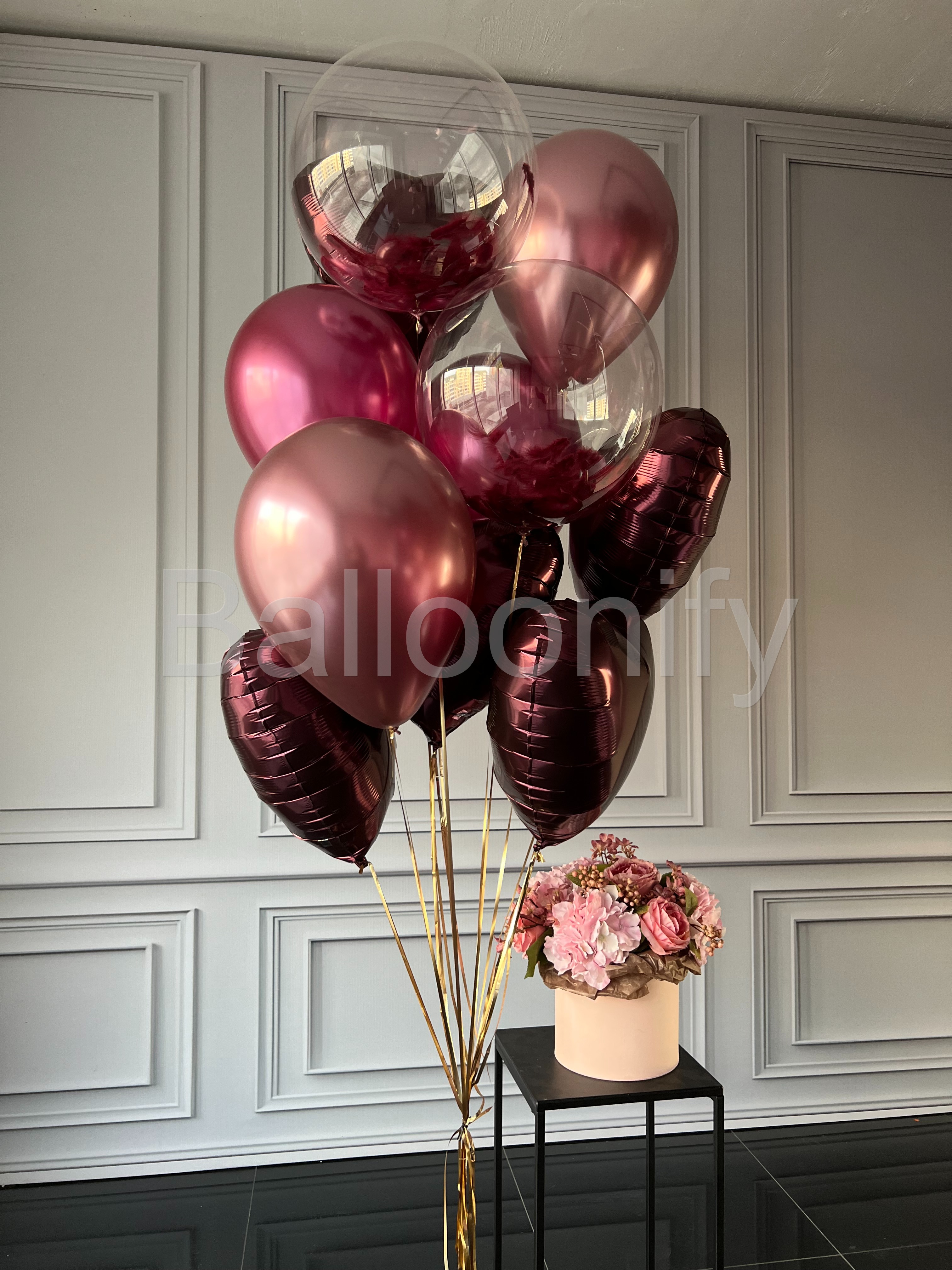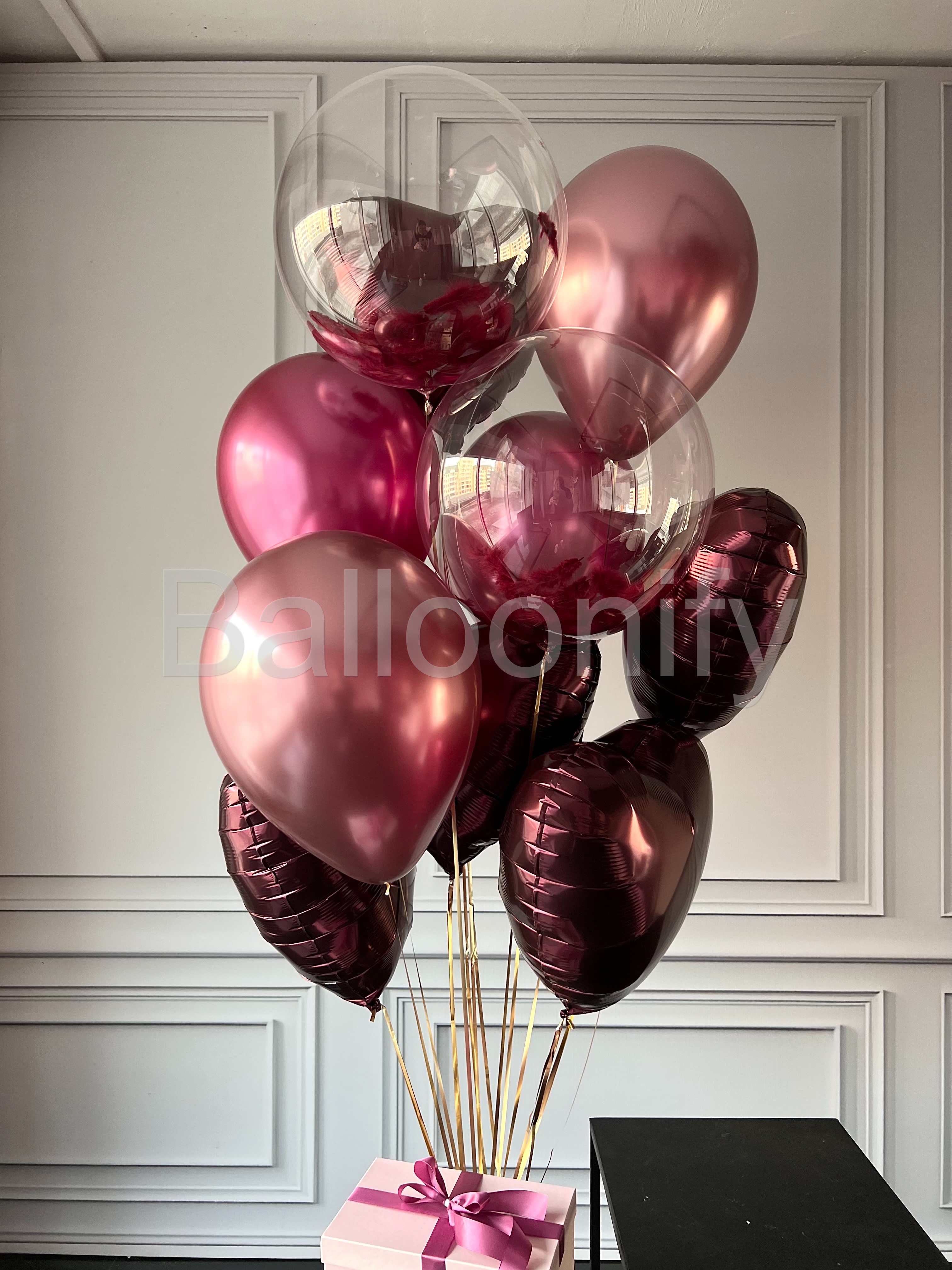 Элегантная композиция из гелиевых шаров в насыщенных бордово-розовых оттенках — хромированные шары, воздушные «баблсы», и блестящие шары в форме сердец. Идеальный выбор для особого повода: дня рождения, романтического вечера или поздравления любимой женщины. 🌟