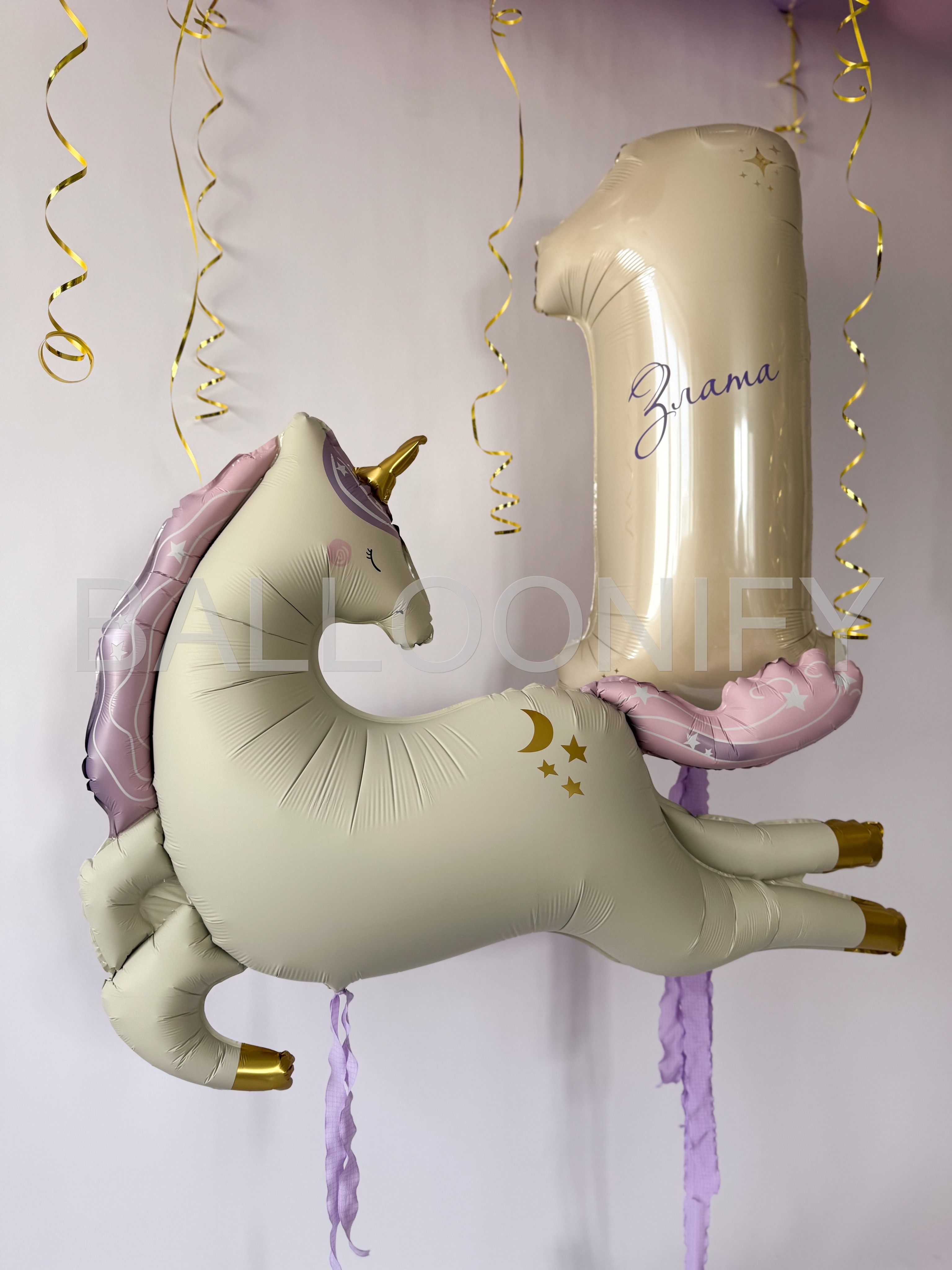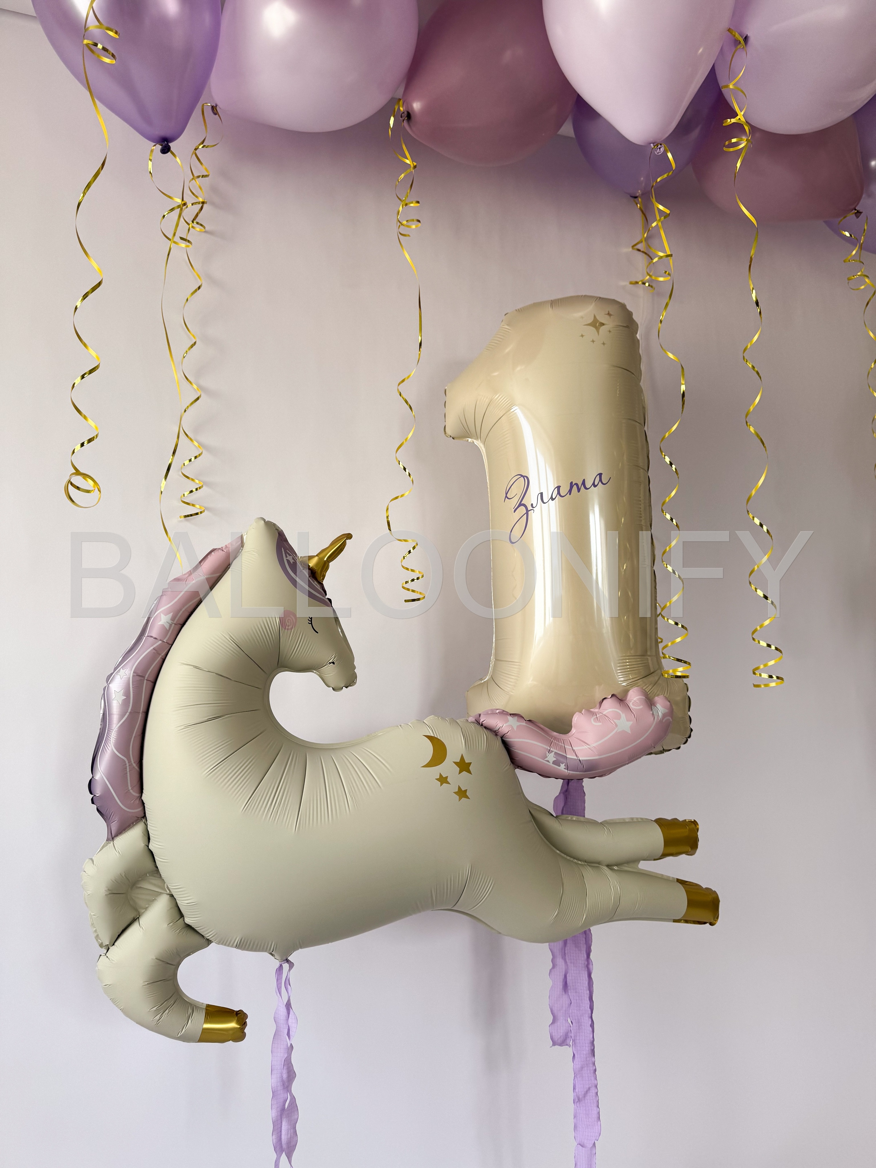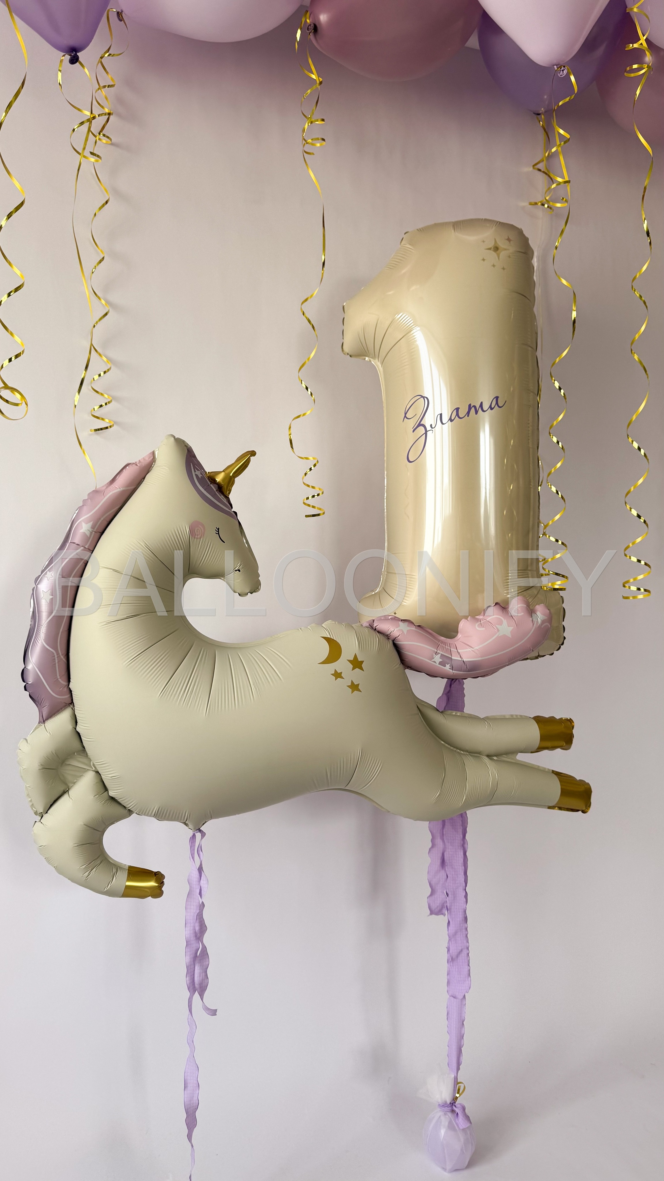 Нежная композиция из воздушных шаров для празднования первого дня рождения малышки: очаровательный шар-единорог в пастельных тонах с золотыми копытцами, большой шар в виде цифры «1» с именем, а также гроздь шаров сиреневых и лиловых оттенков с изящными золотыми лентами. Создаёт волшебную, сказочную атмосферу — идеально для фотозоны и украшения зала.