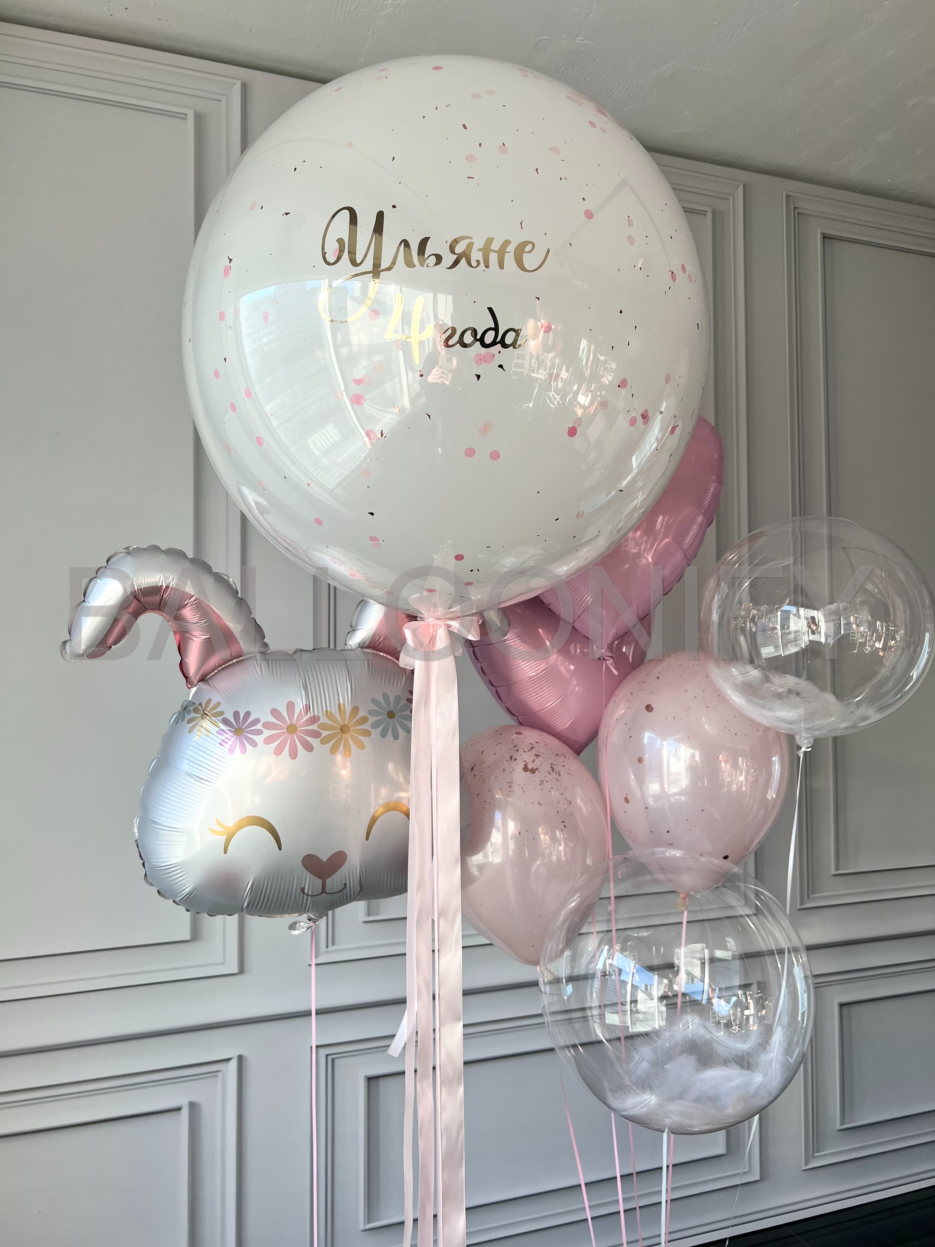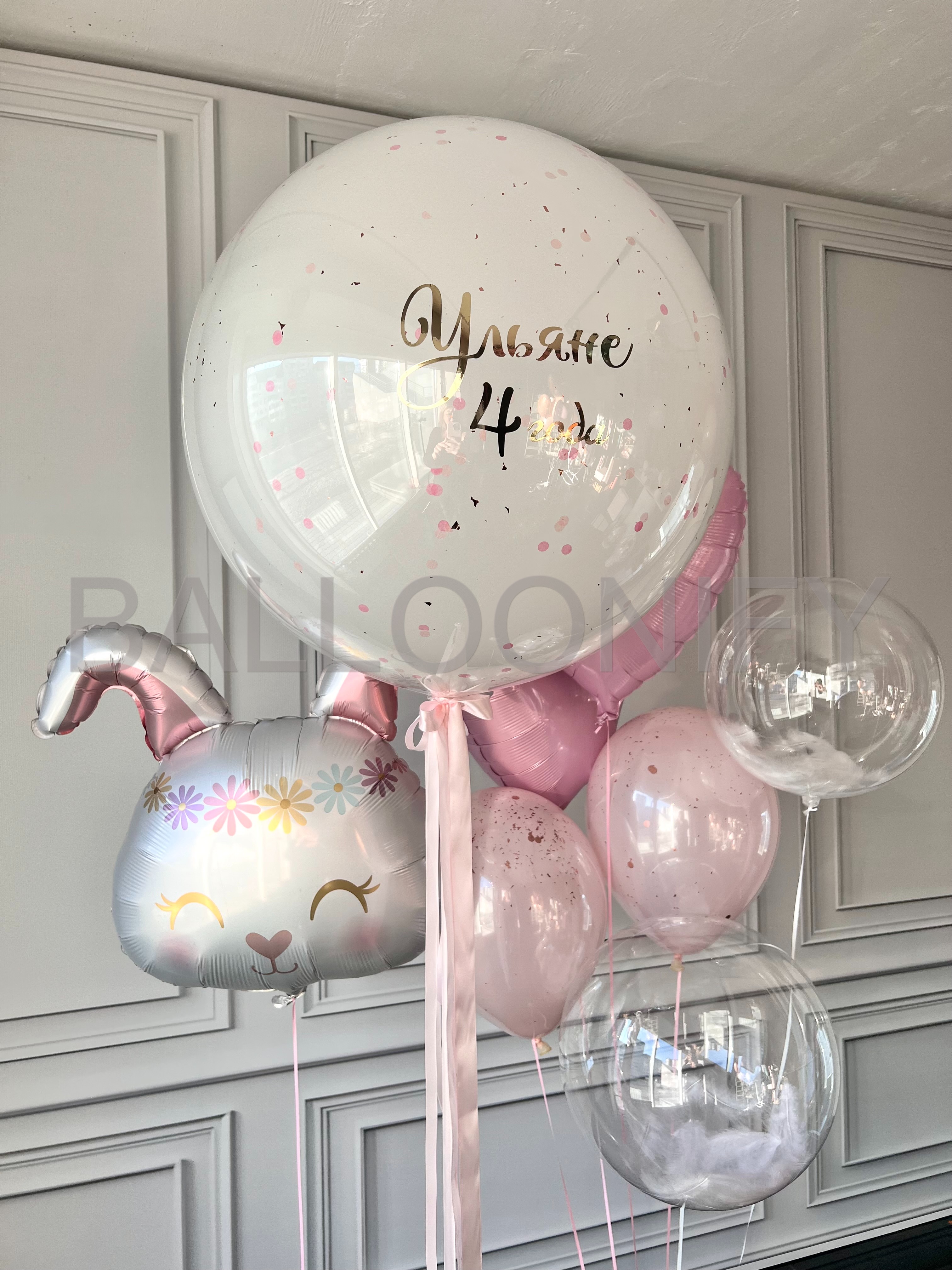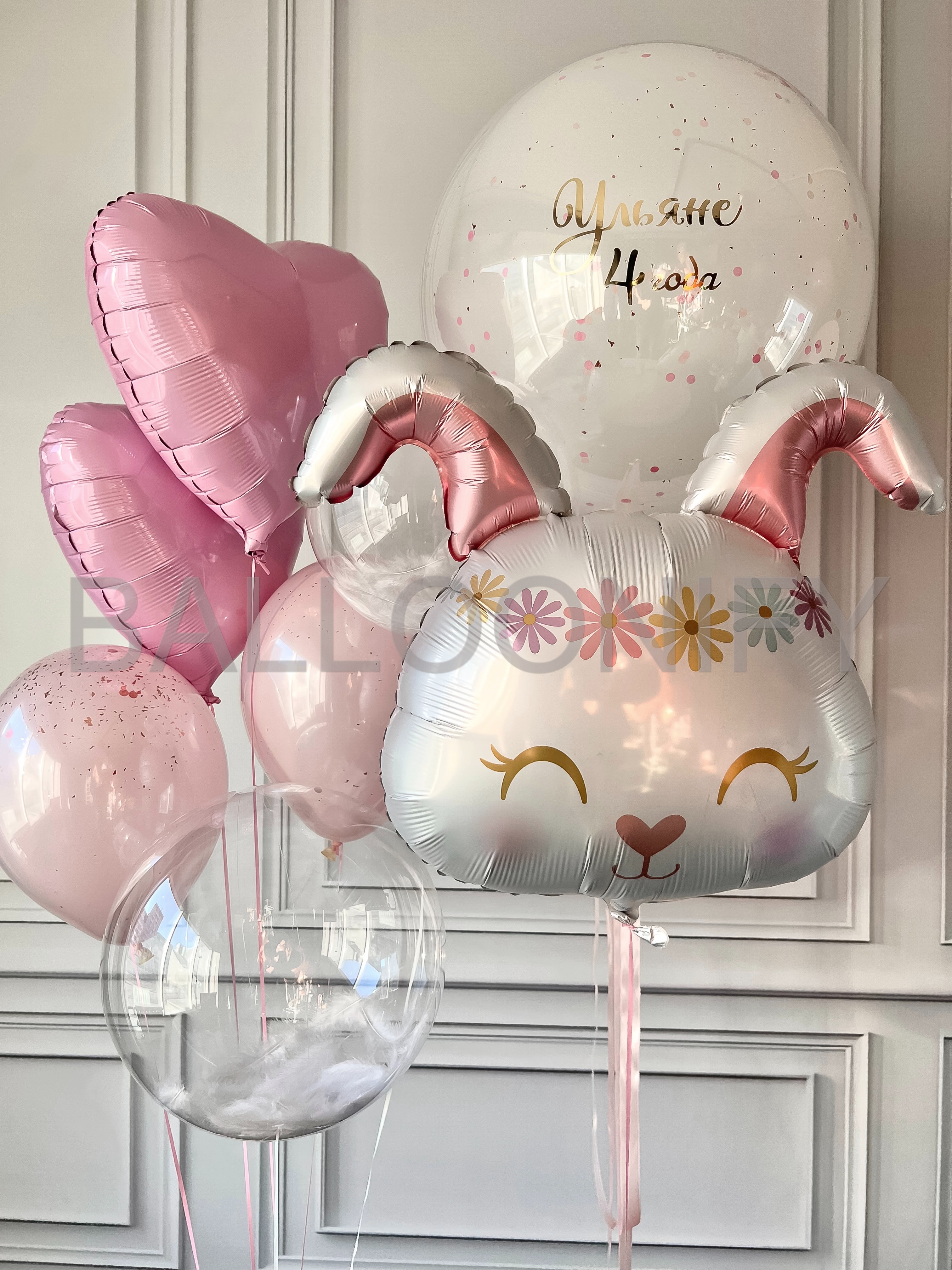 Нежная композиция из гелиевых шаров для маленькой именинницы: в центре — большой фольгированный шар в виде милого зайчика с цветочной короной и закрытыми глазками, вокруг — розовые шары-сердечки, полупрозрачные шары с конфетти, прозрачный шар с пушистыми облачками и крупный шар с изящной надписью «Ульяне 4 года». Пастельная гамма и милые детали создают волшебную атмосферу праздника! 🌟