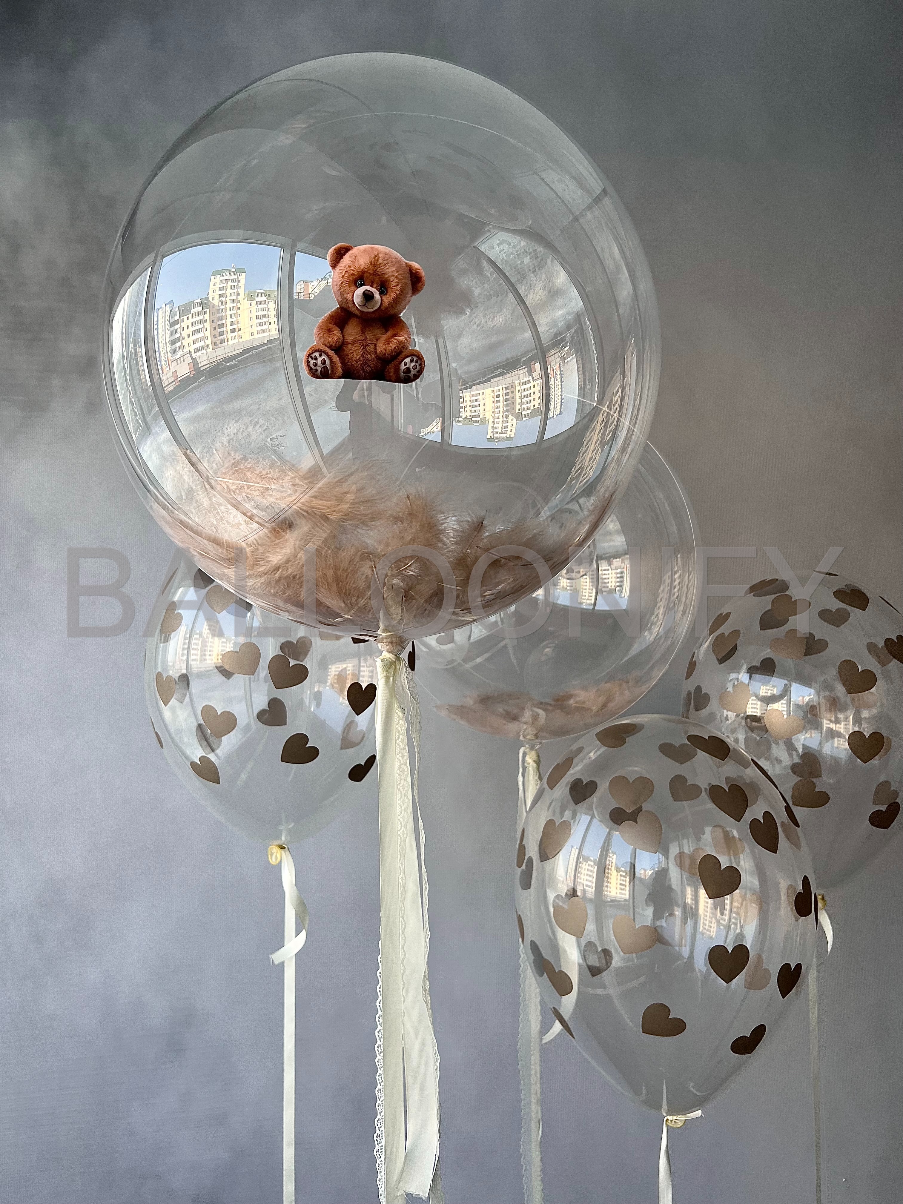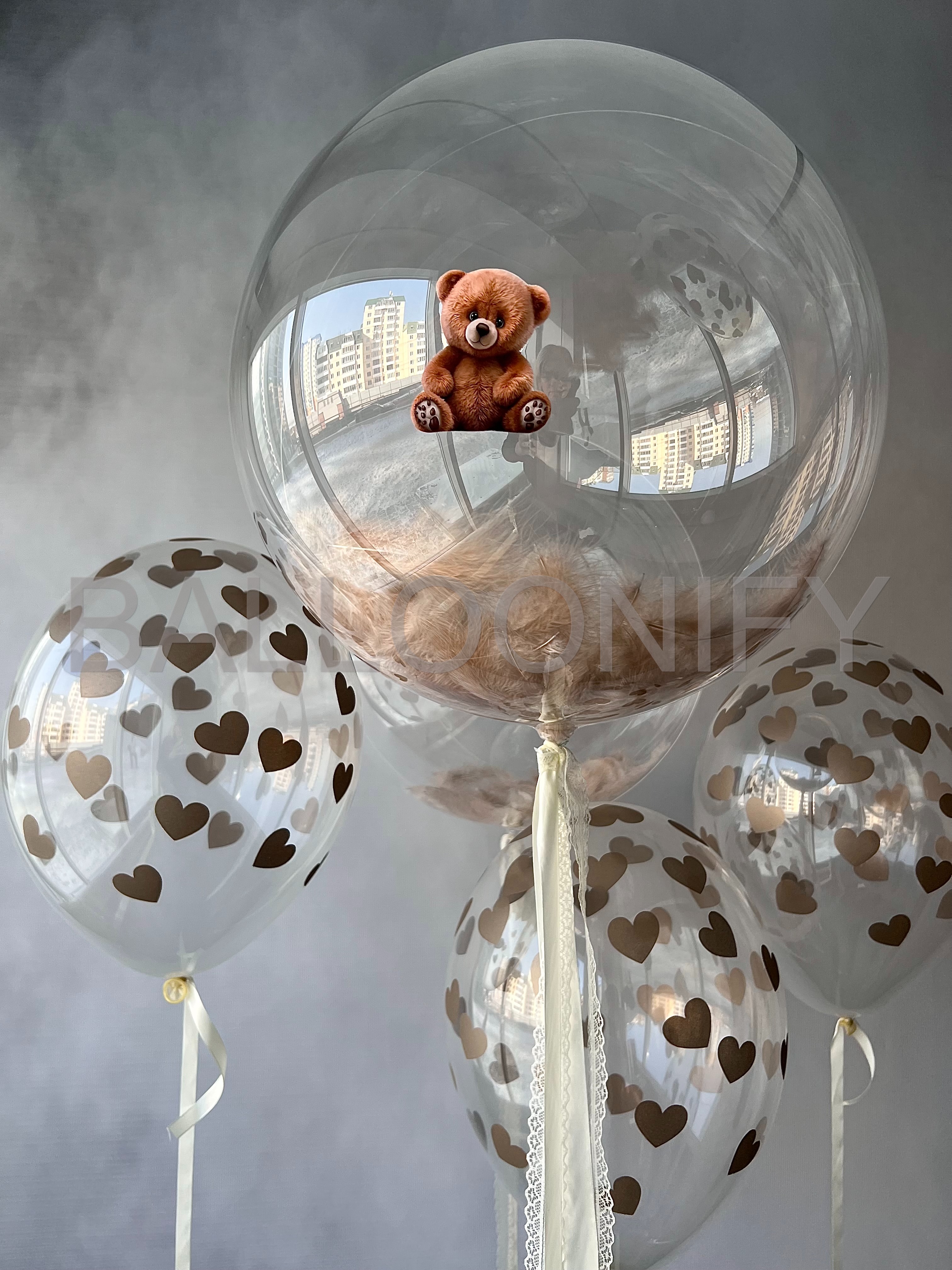 Нежная и трогательная композиция из прозрачных воздушных шаров: крупный шар с пушистыми перьями и милым плюшевым медвежонком внутри создаёт ощущение волшебства, а окружающие его шары украшены изящным принтом в виде золотистых сердечек. Лёгкие кружевные ленты добавляют изысканности. Идеальный выбор для поздравления малыша, романтического сюрприза или нежного поздравления близкому человеку. 🌟