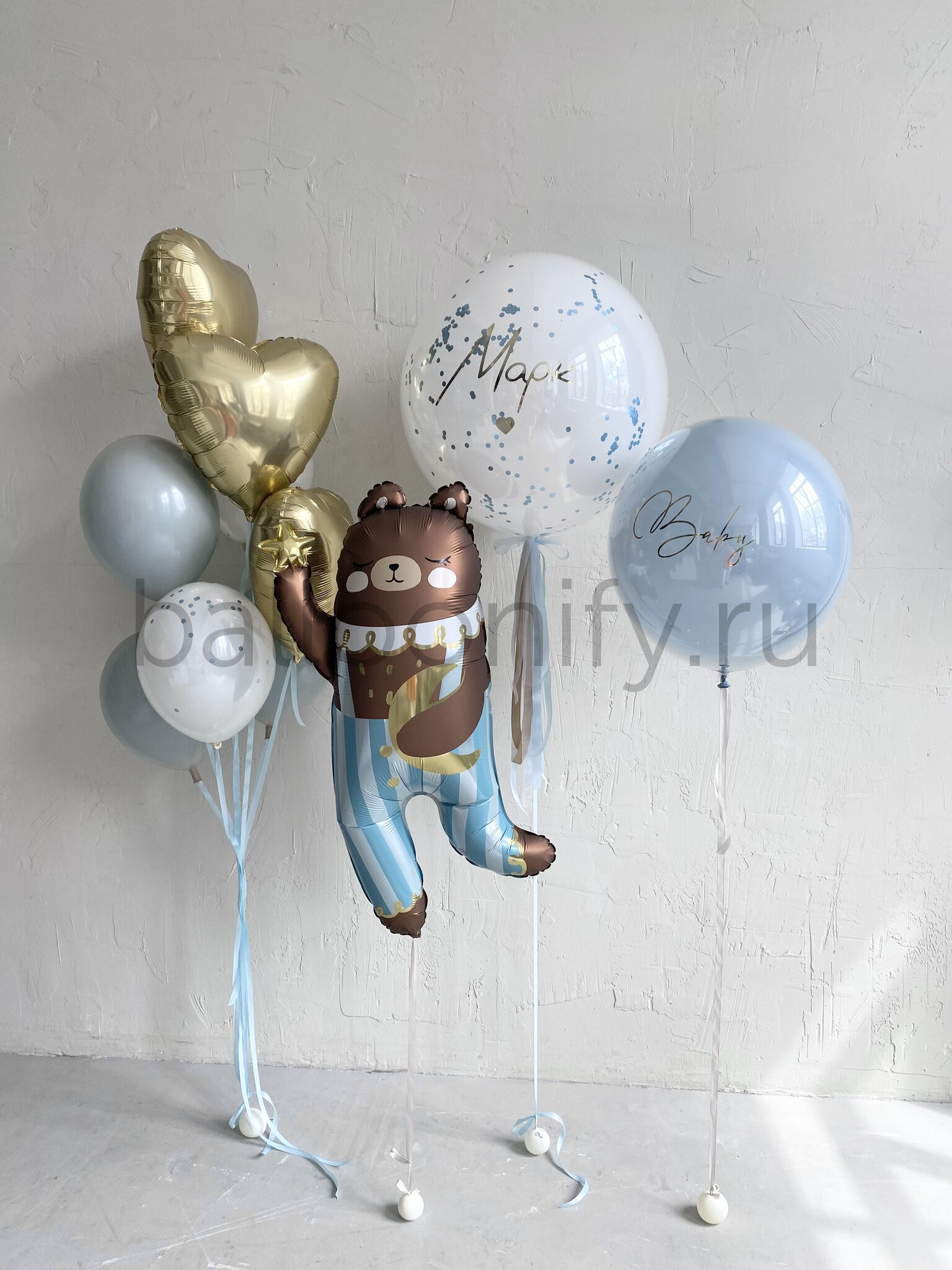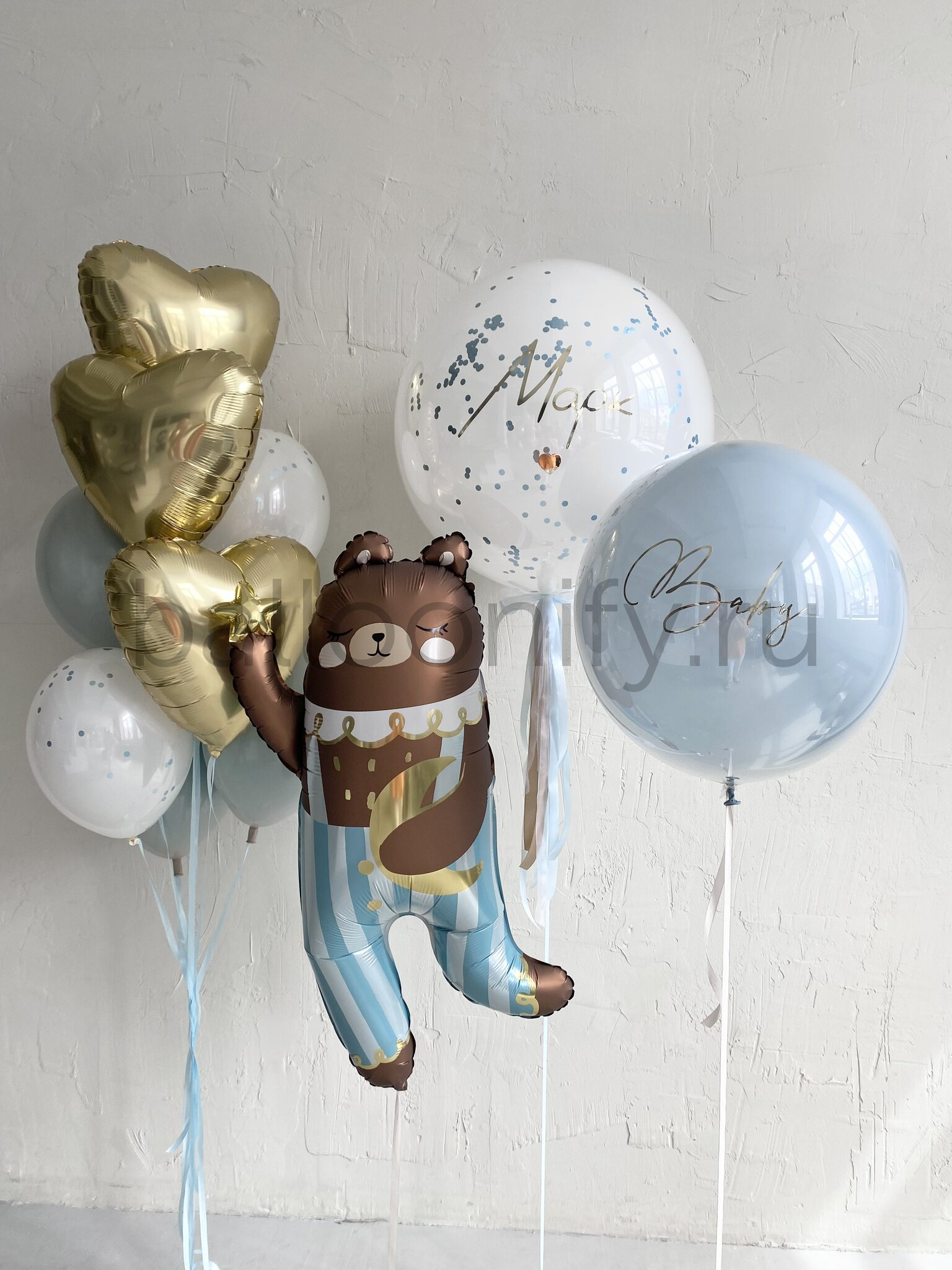 Изысканное оформление для празднования появления на свет малыша. В центре внимания — очаровательный медвежонок в элегантном полосатом наряде, создающий атмосферу радости и торжества. Его великолепие подчёркивают роскошные стеклянные шары диаметром 61 см, наполняющий пространство волшебным сиянием. Индивидуальная надпись придаёт композиции неповторимый характер и особый смысл.
