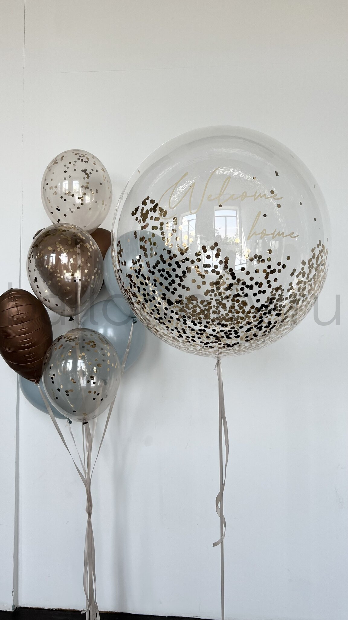 Элегантное оформление праздника рождения крохи. Главная звезда композиции — крупный прозрачный шар диаметром 61 см, который наполняет пространство чарующим светом. Индивидуальное текстовое оформление делает набор шаров уникальным и значимым.