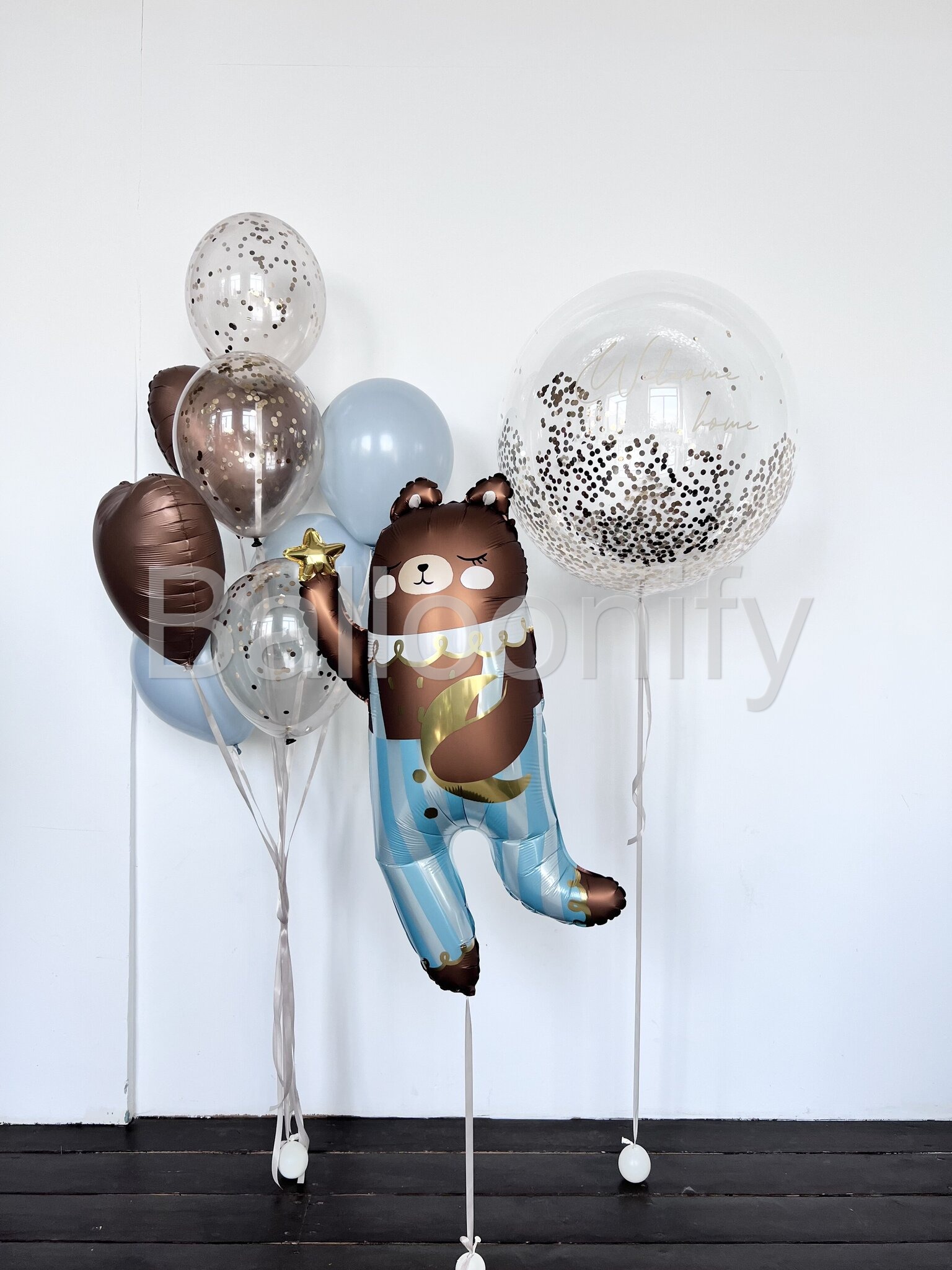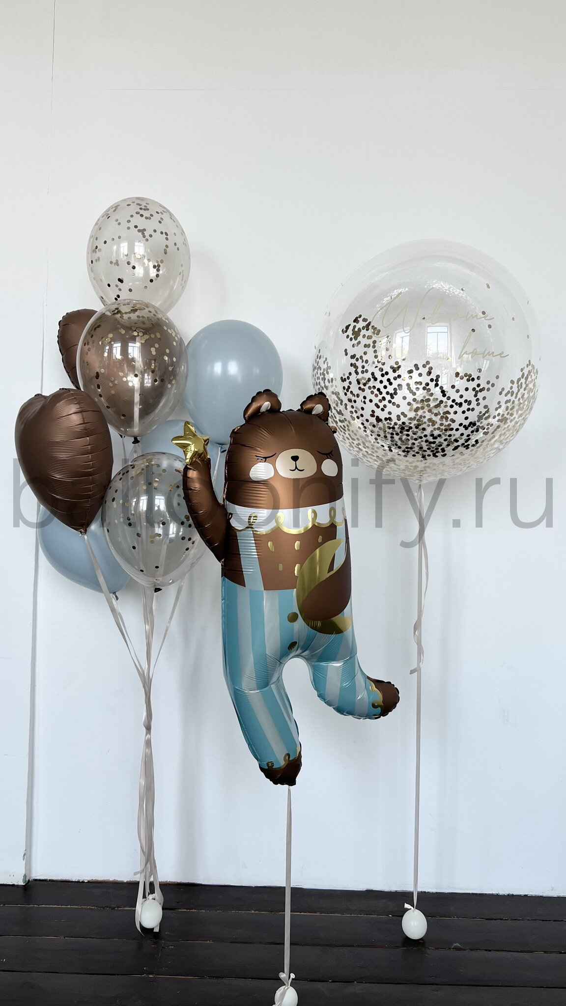 Изысканное оформление для празднования появления на свет малыша. В центре внимания — очаровательный медвежонок в элегантном полосатом наряде, создающий атмосферу радости и торжества. Его великолепие подчёркивает большой прозрачный шар диаметром 61 см, наполняющий пространство волшебным сиянием. Индивидуальная надпись придаёт композиции неповторимый характер и особый смысл.