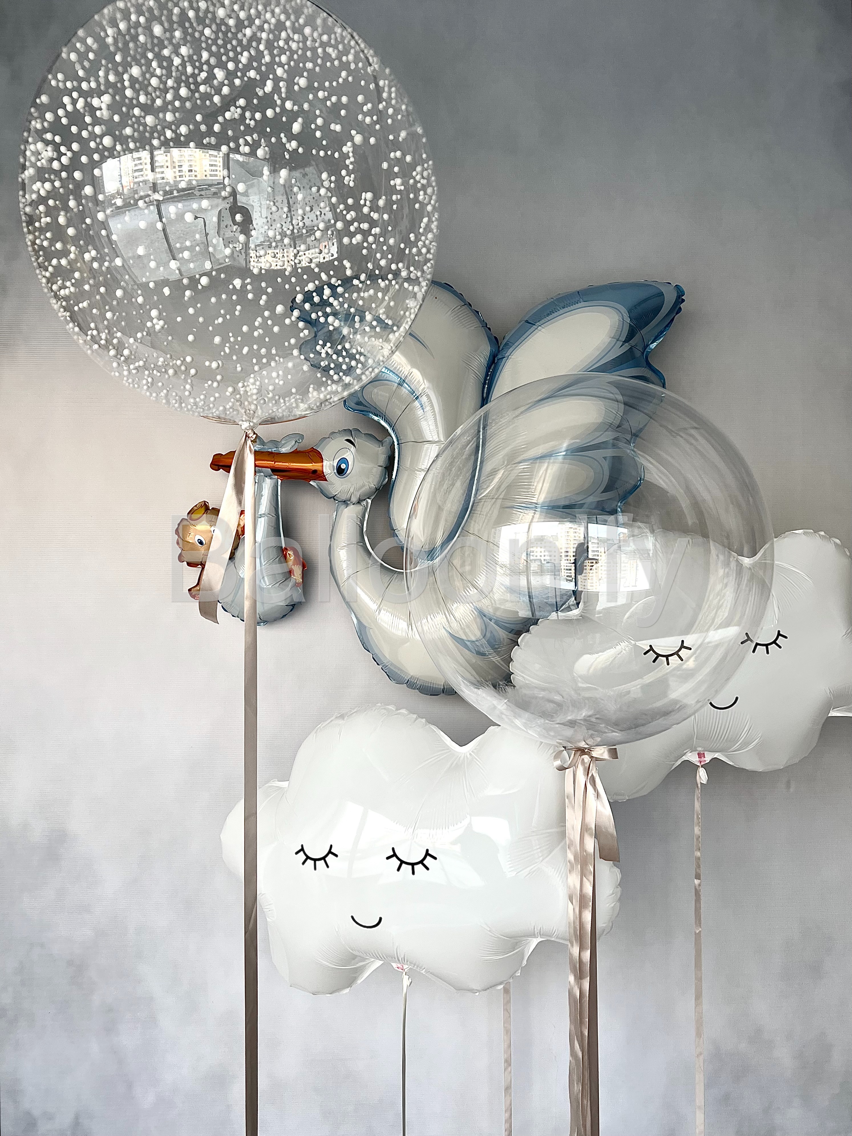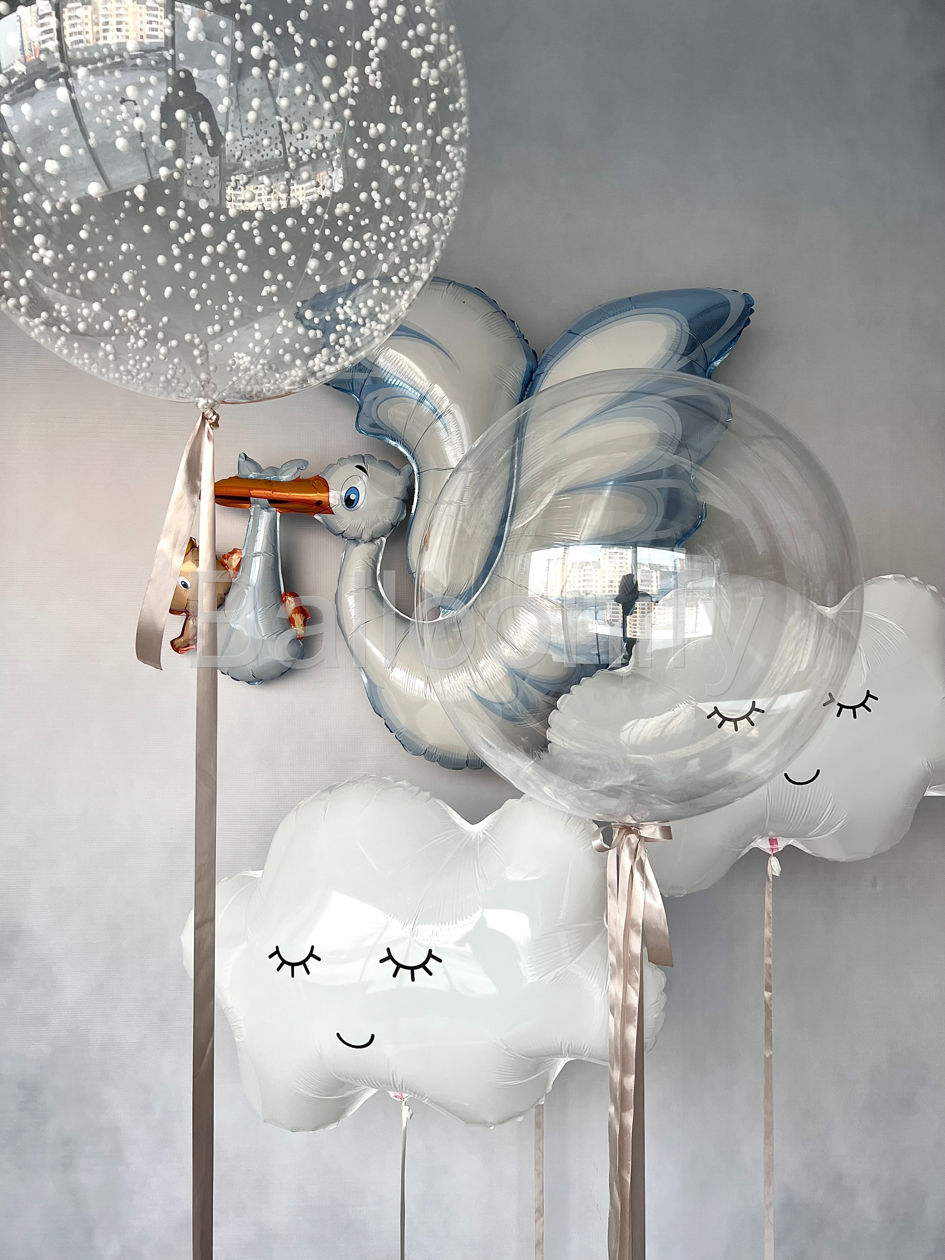 Нежная и трогательная композиция из воздушных шаров, идеально подходящая для поздравления с рождением малыша и оформления выписки из роддома. Центральным элементом является большой фольгированный аист с младенцем в клюве — классический символ новорождённых, выполненный в мягких голубых и белых тонах. Аист выглядит очень мило, а фигурка малыша добавляет композиции трогательности. 🌟