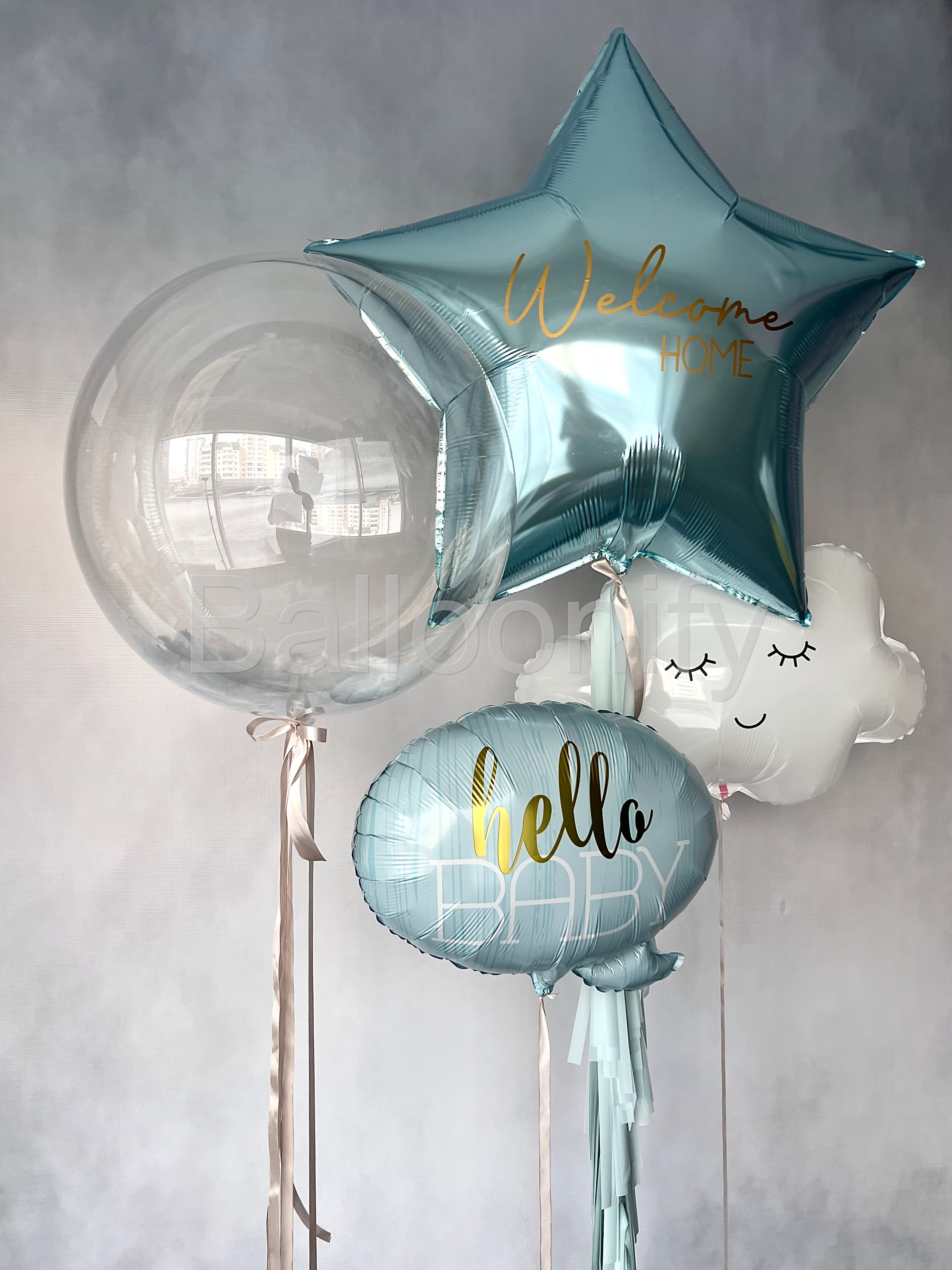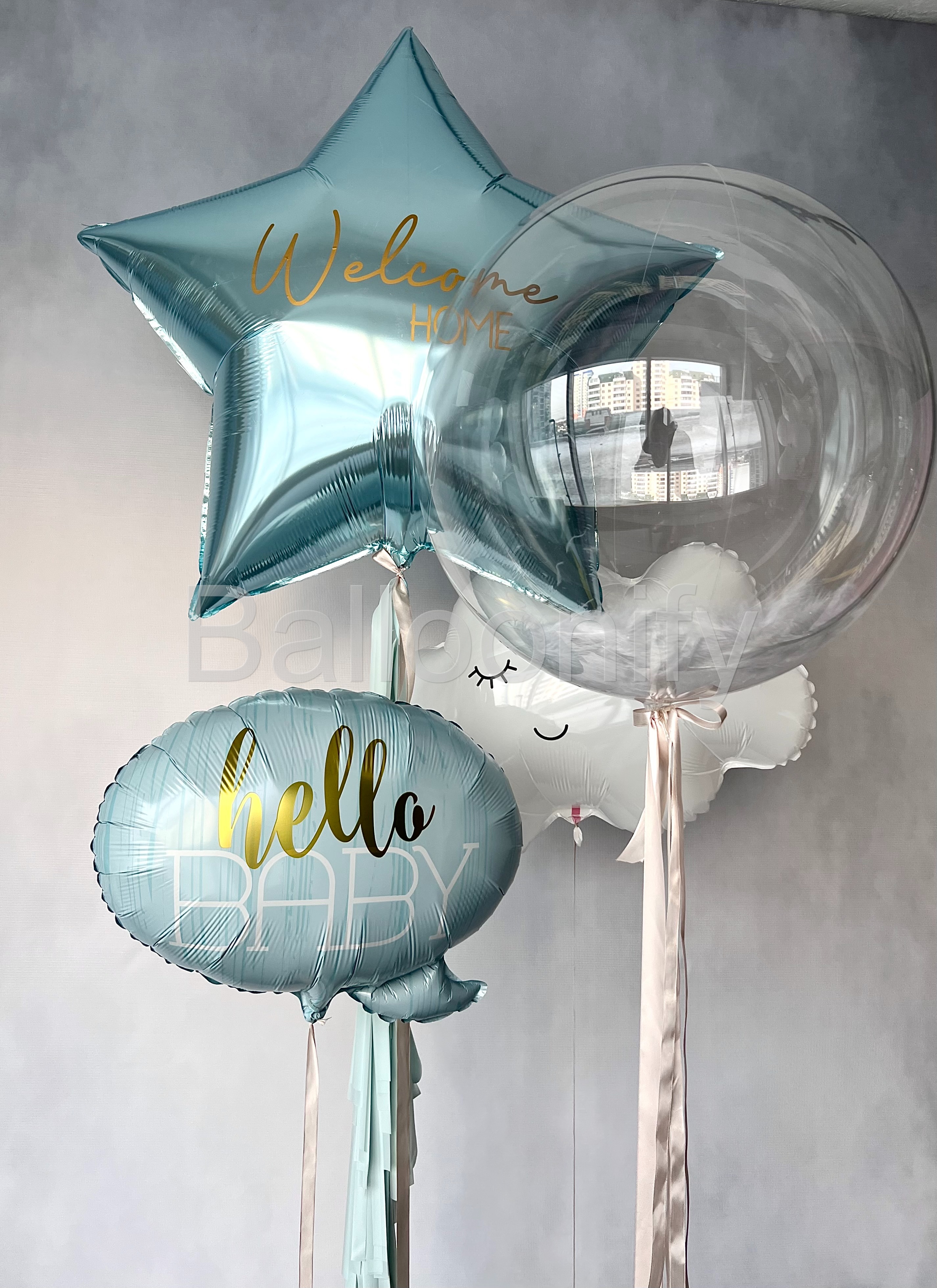 Нежная и трогательная композиция из воздушных шаров — идеальный декор для выписки из роддома или празднования рождения малыша. В композиции гармонично сочетаются четыре шара, каждый из которых добавляет особый шарм. 🌟