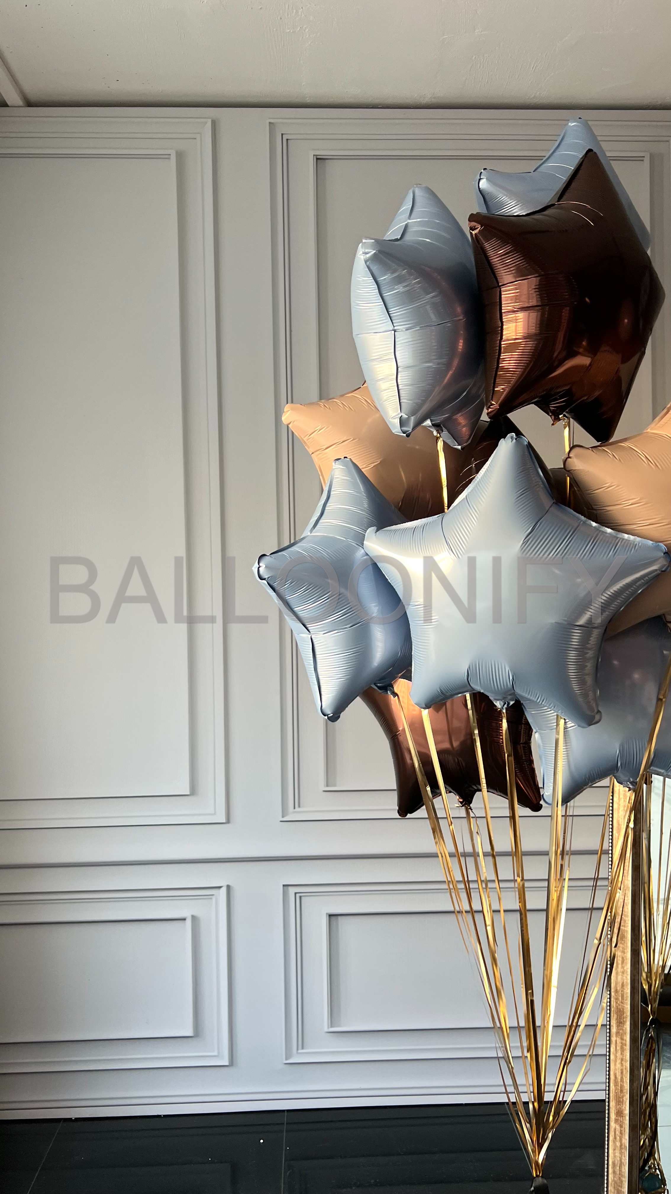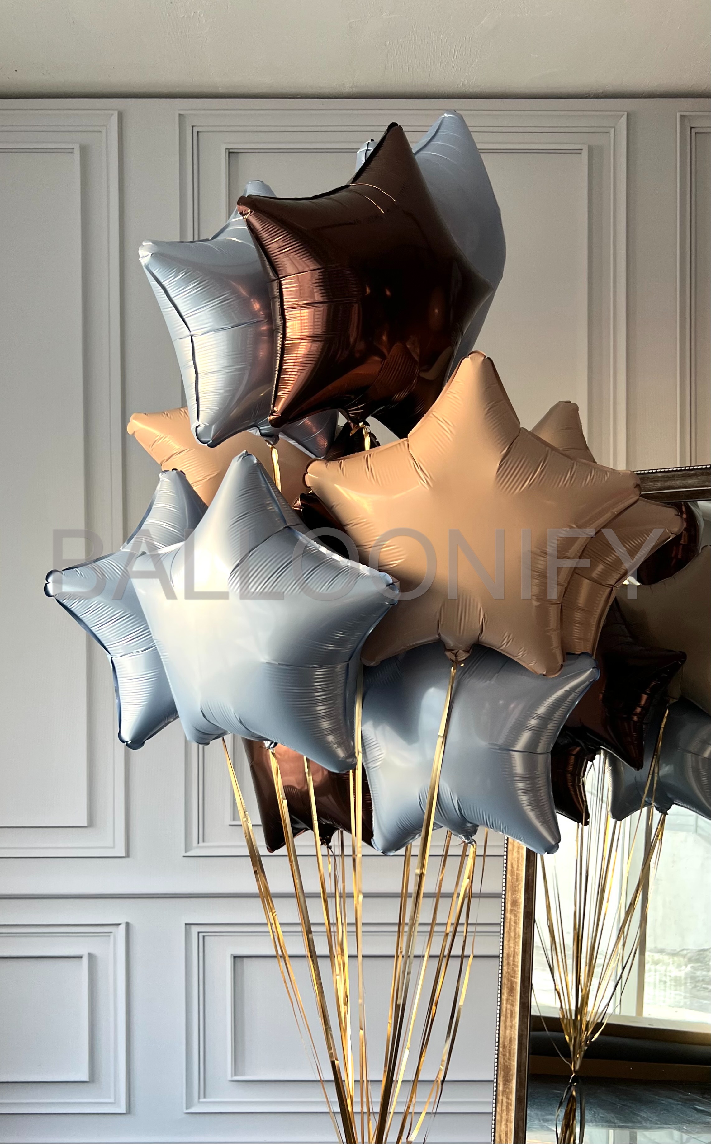 Элегантный букет из фольгированных шаров в форме звёзд — изысканное сочетание голубого, песочного и шоколадно-коричневых оттенков. Блестящая поверхность шаров и золотистые стойки создают ощущение роскоши и торжественности. Идеальный декор для дня рождения, юбилея, корпоративного мероприятия или любого особого события. 🌟