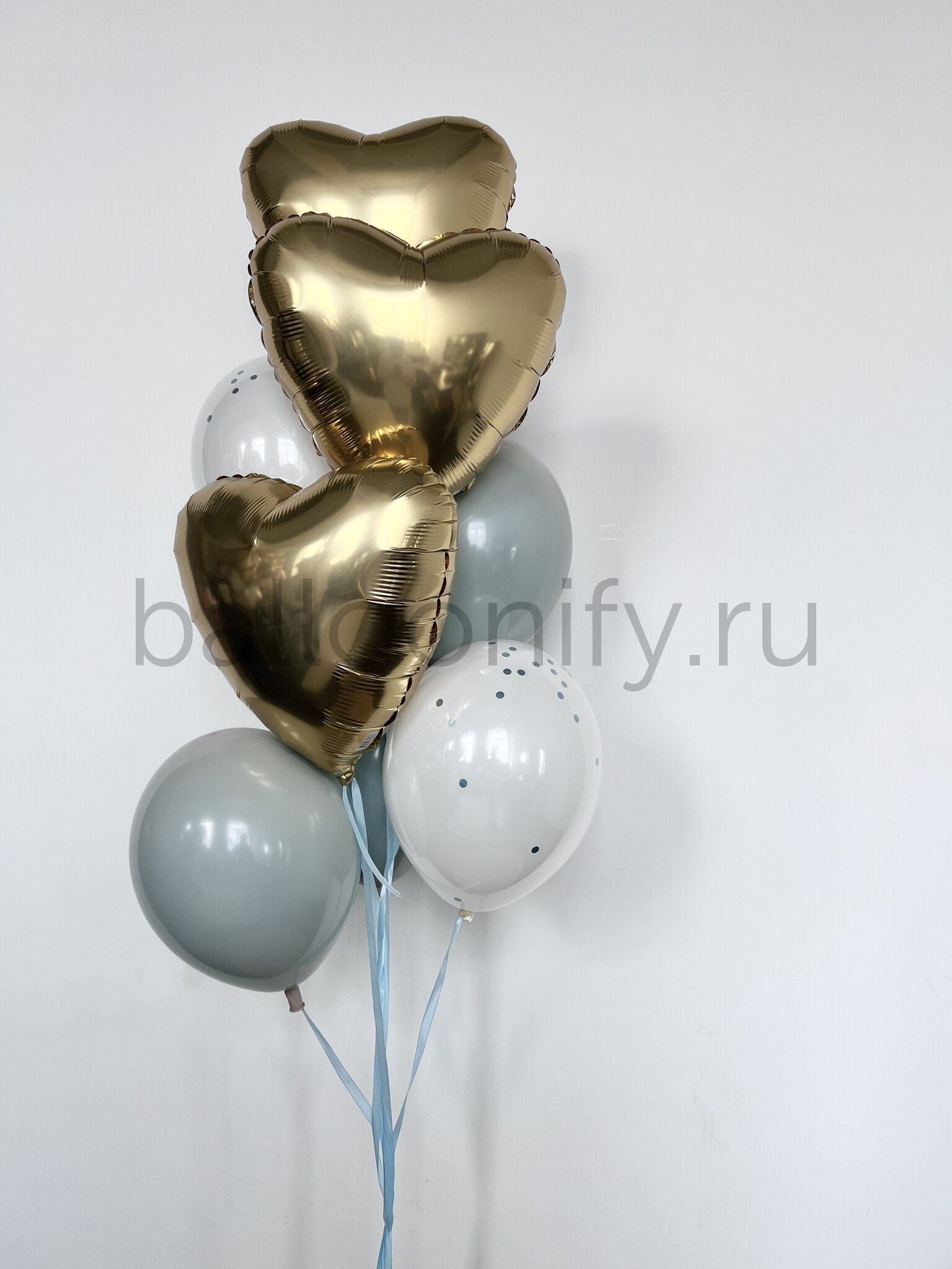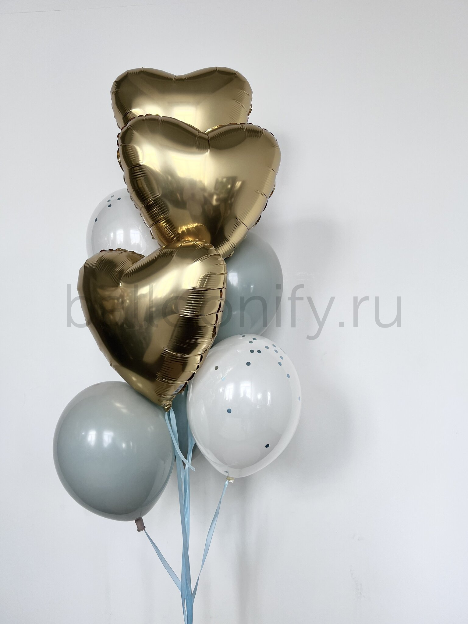 Небесная симфония – изысканная композиция, где гармония небесных оттенков создает волшебную атмосферу праздника. Золотые фольгированные сердца (45 см) придают благородство, а голубые и белые латексные шары с конфетти (30 см) создают плавные переливы небесной лазури.