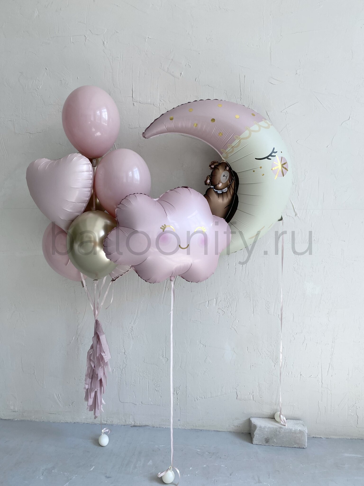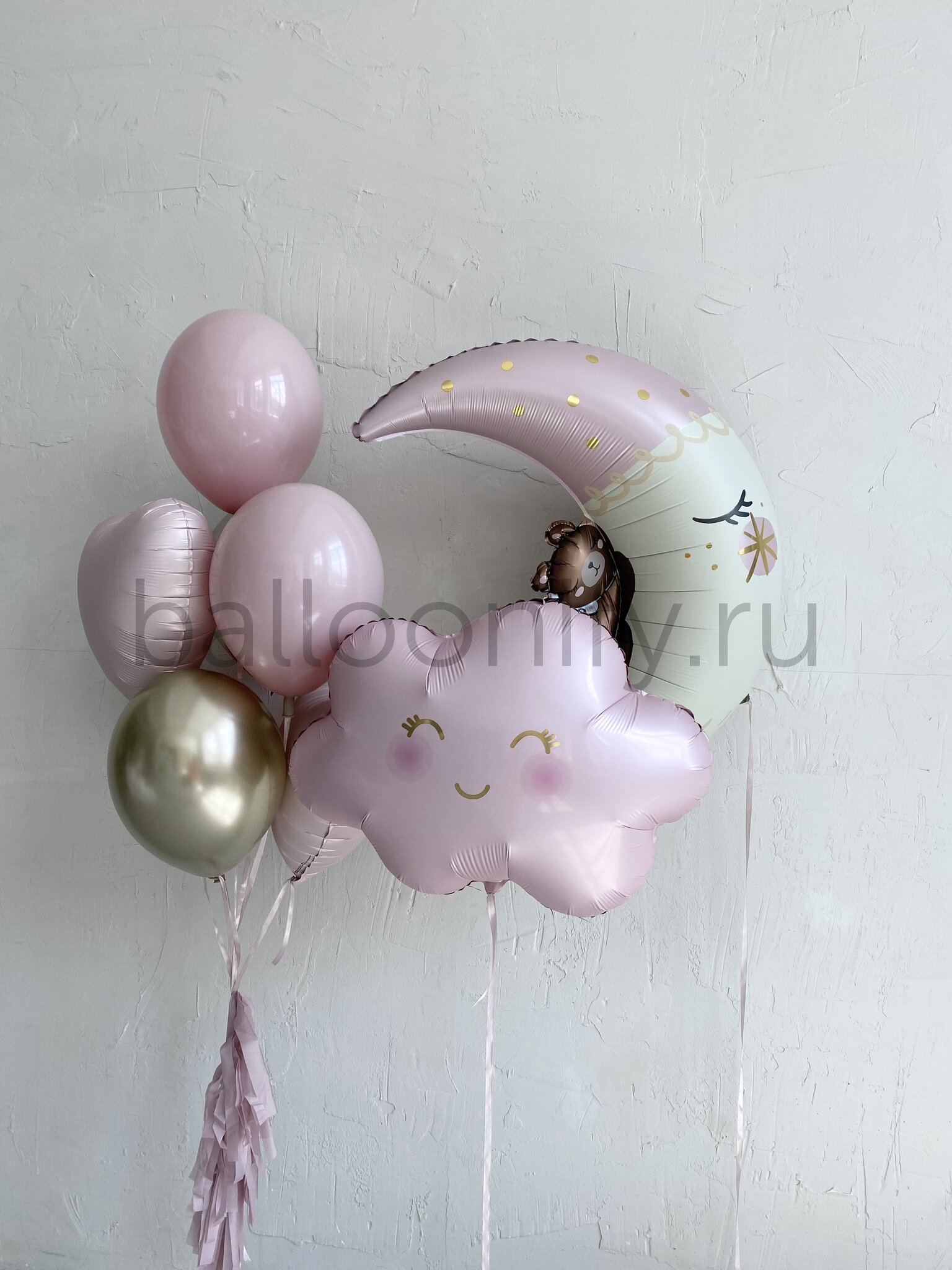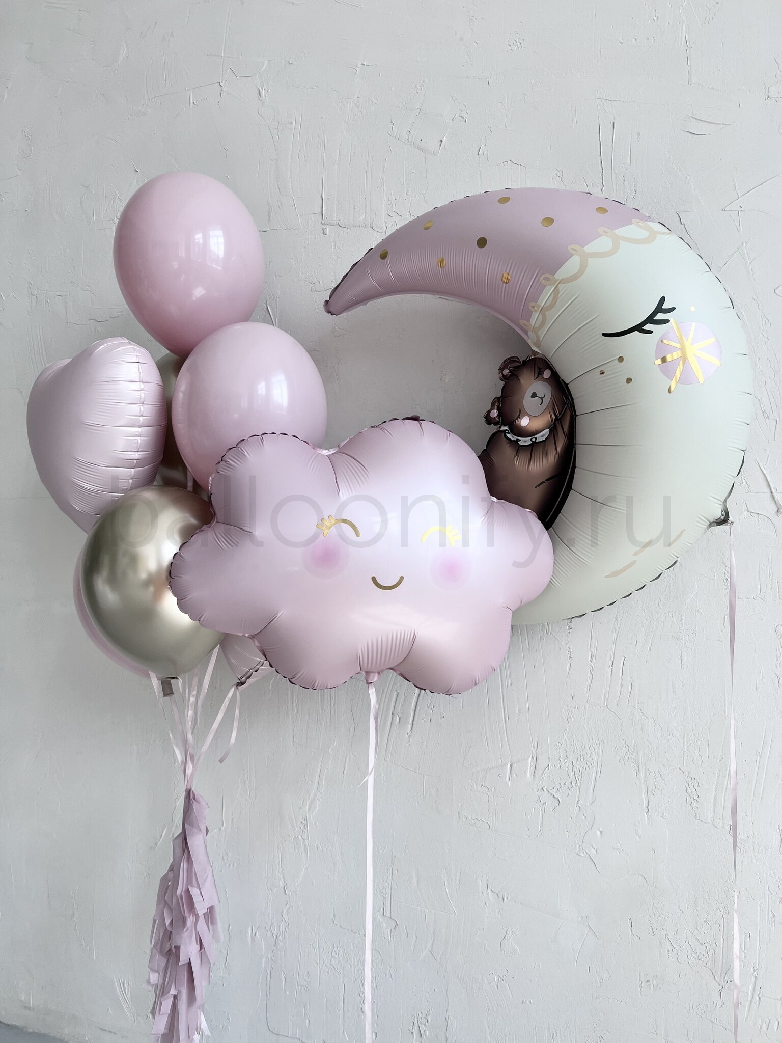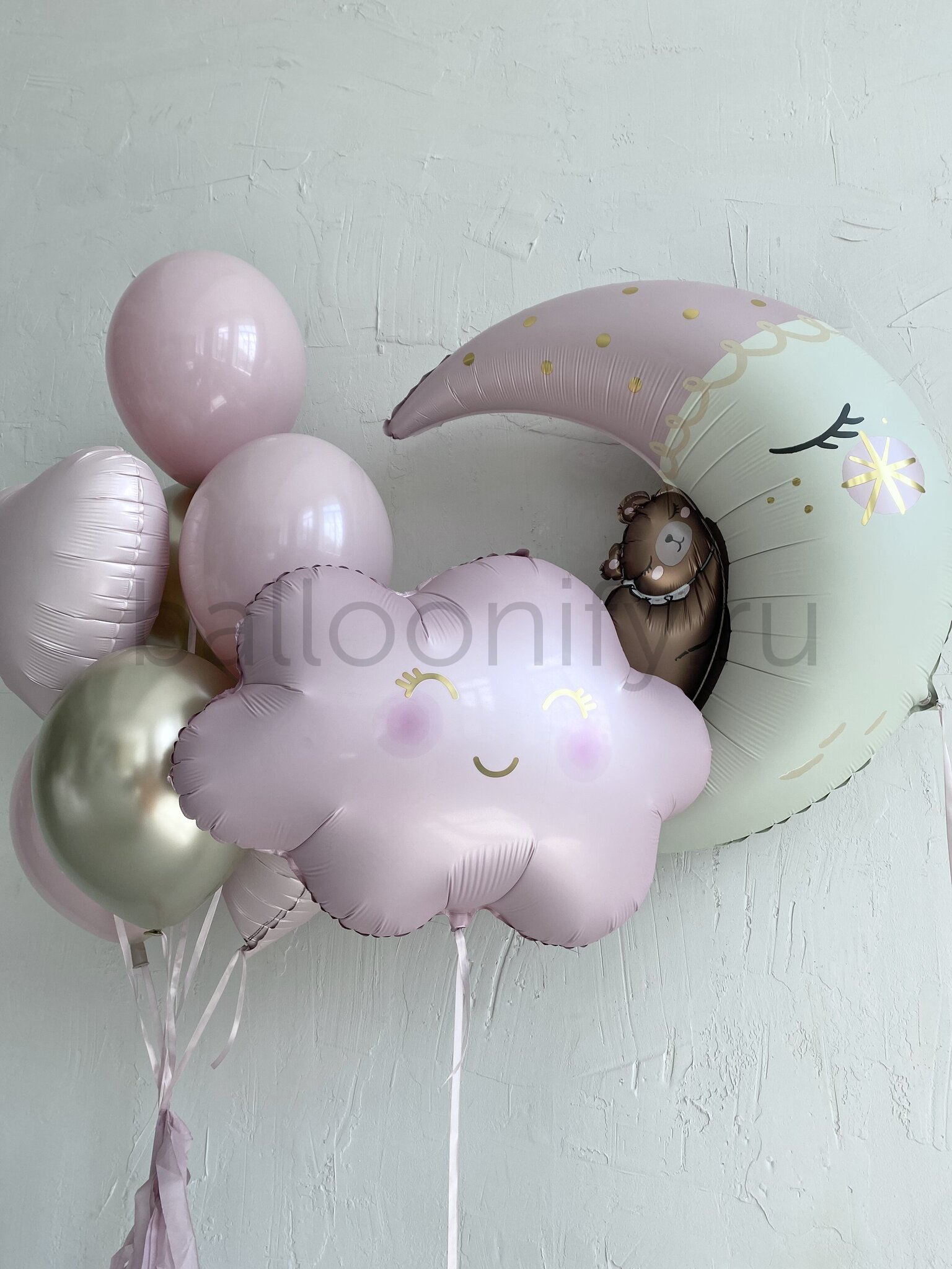Набор шаров «Мишка в розовых облаках» — это очаровательная композиция, которая идеально подойдет для создания волшебной атмосферы на празднике. В набор входят воздушные шары в нежных розовых и золотых тонах, а также тематические элементы: улыбающееся облачко, полумесяц с милым медвежонком.