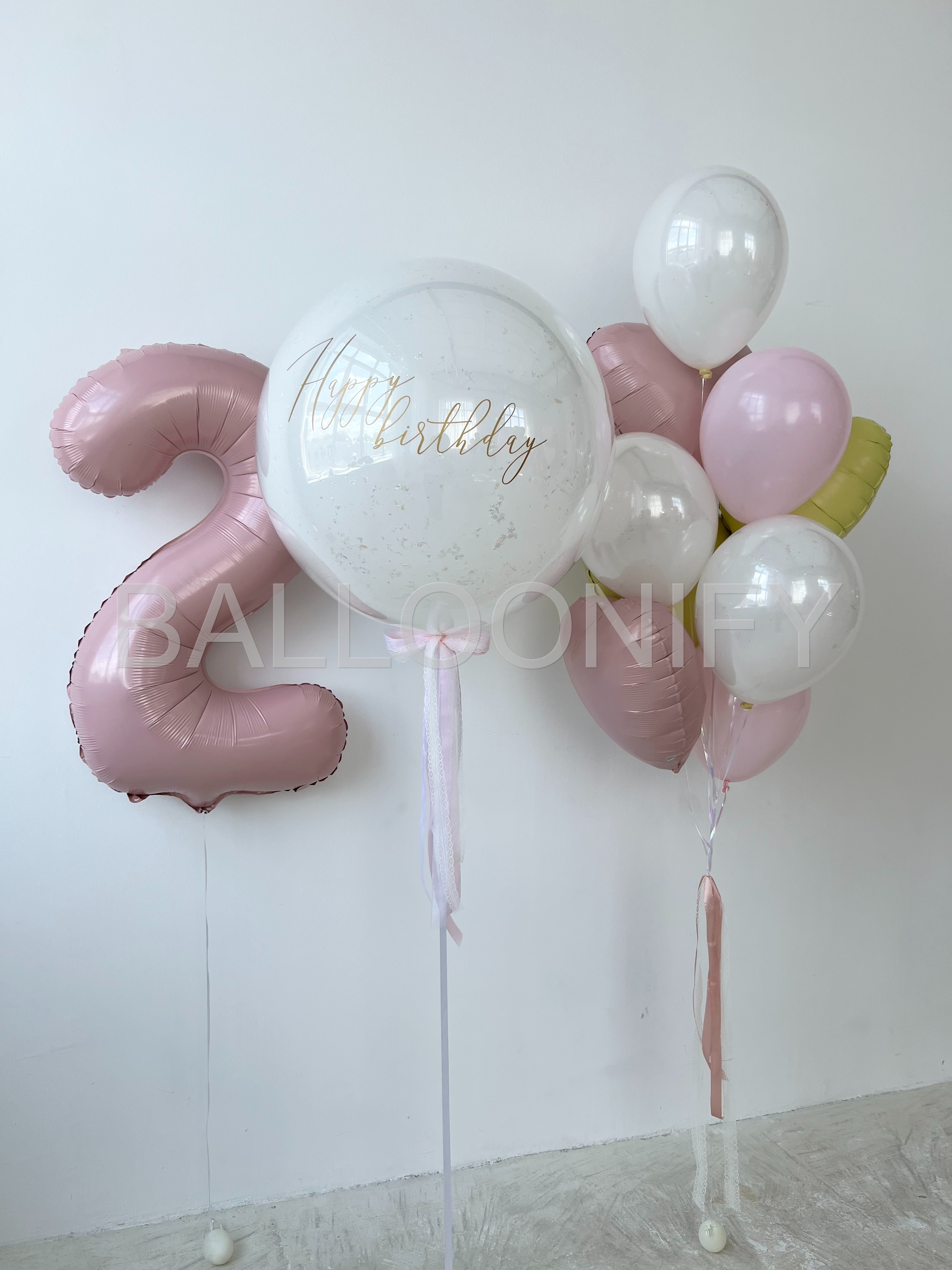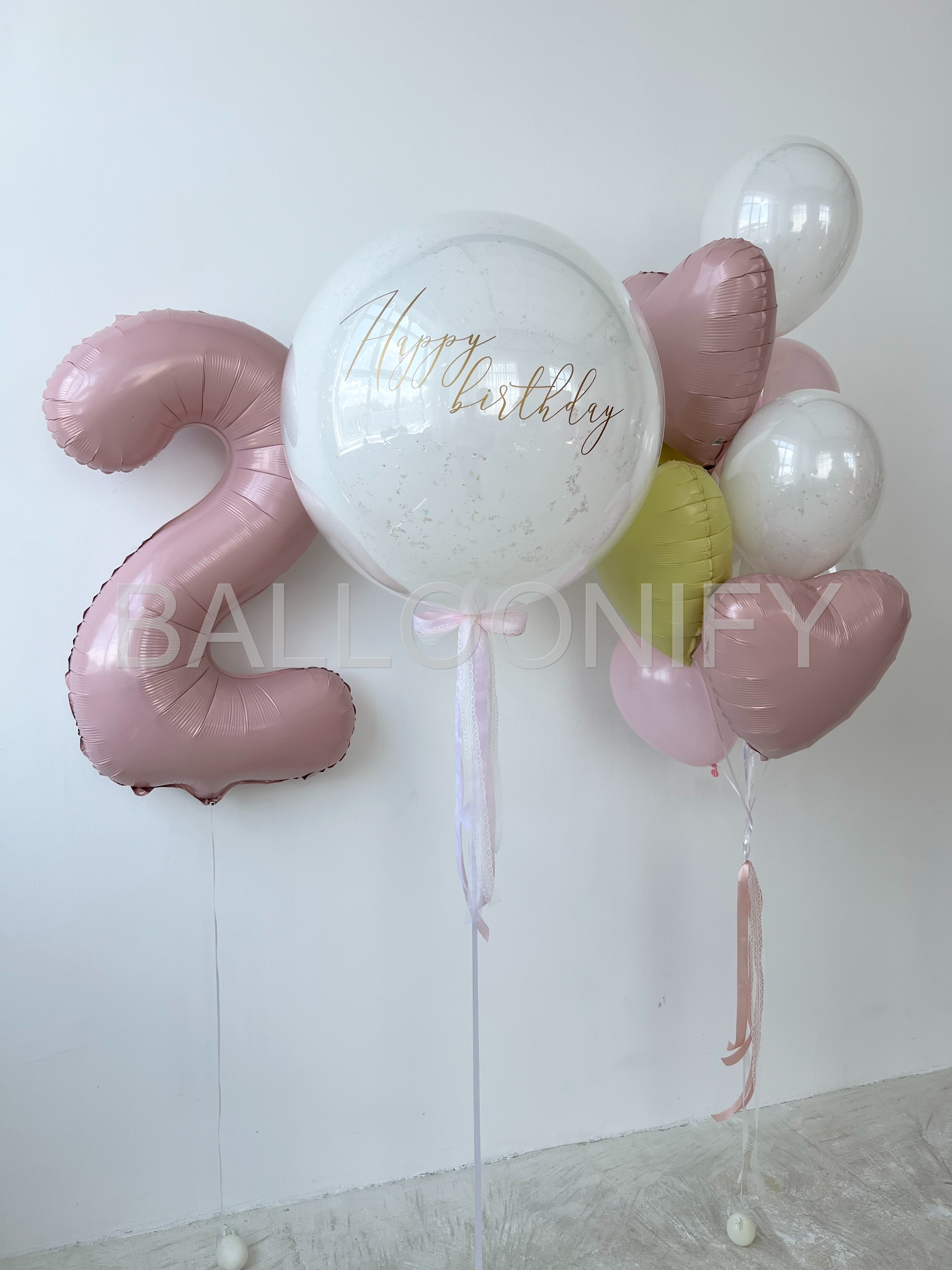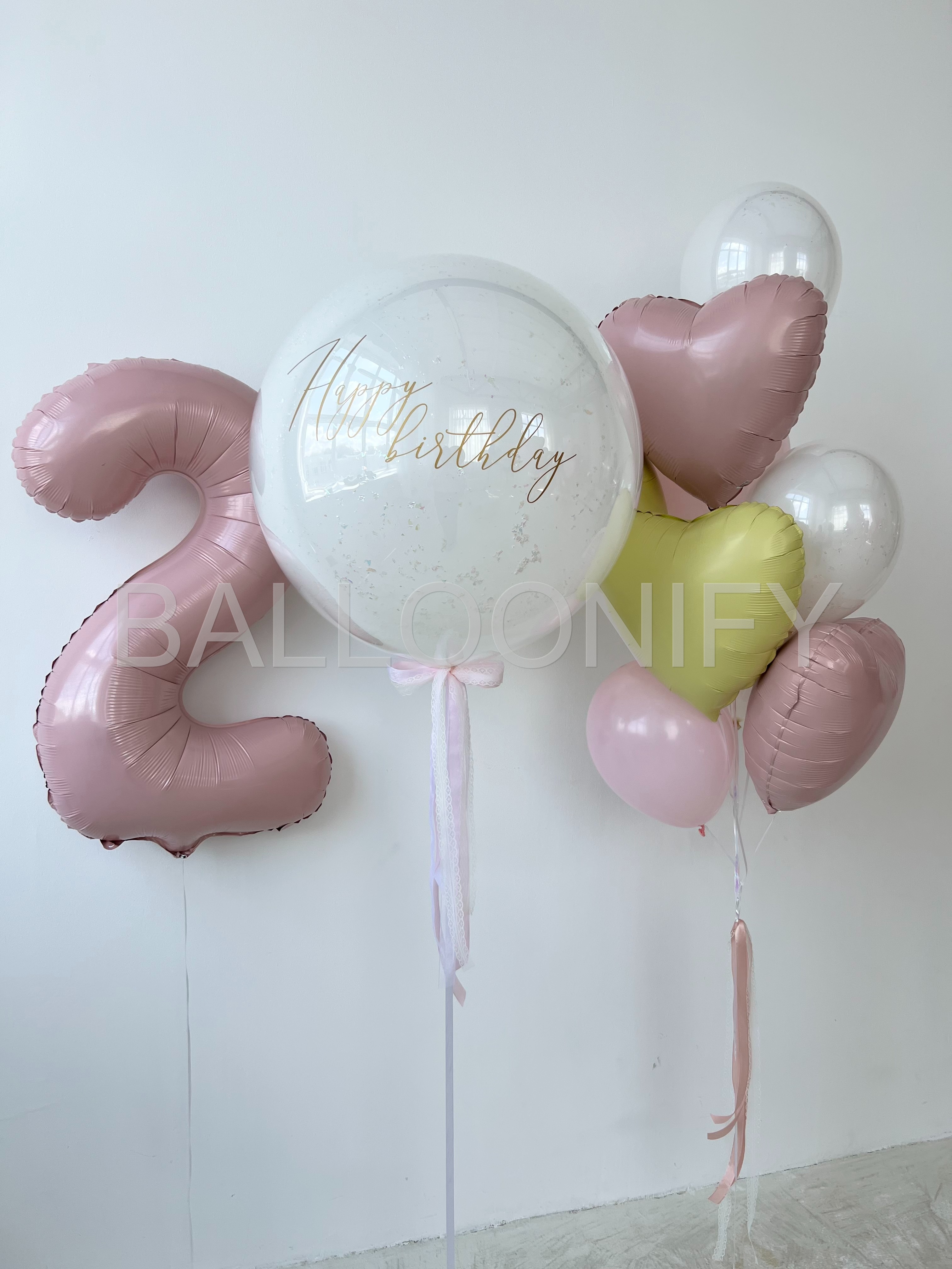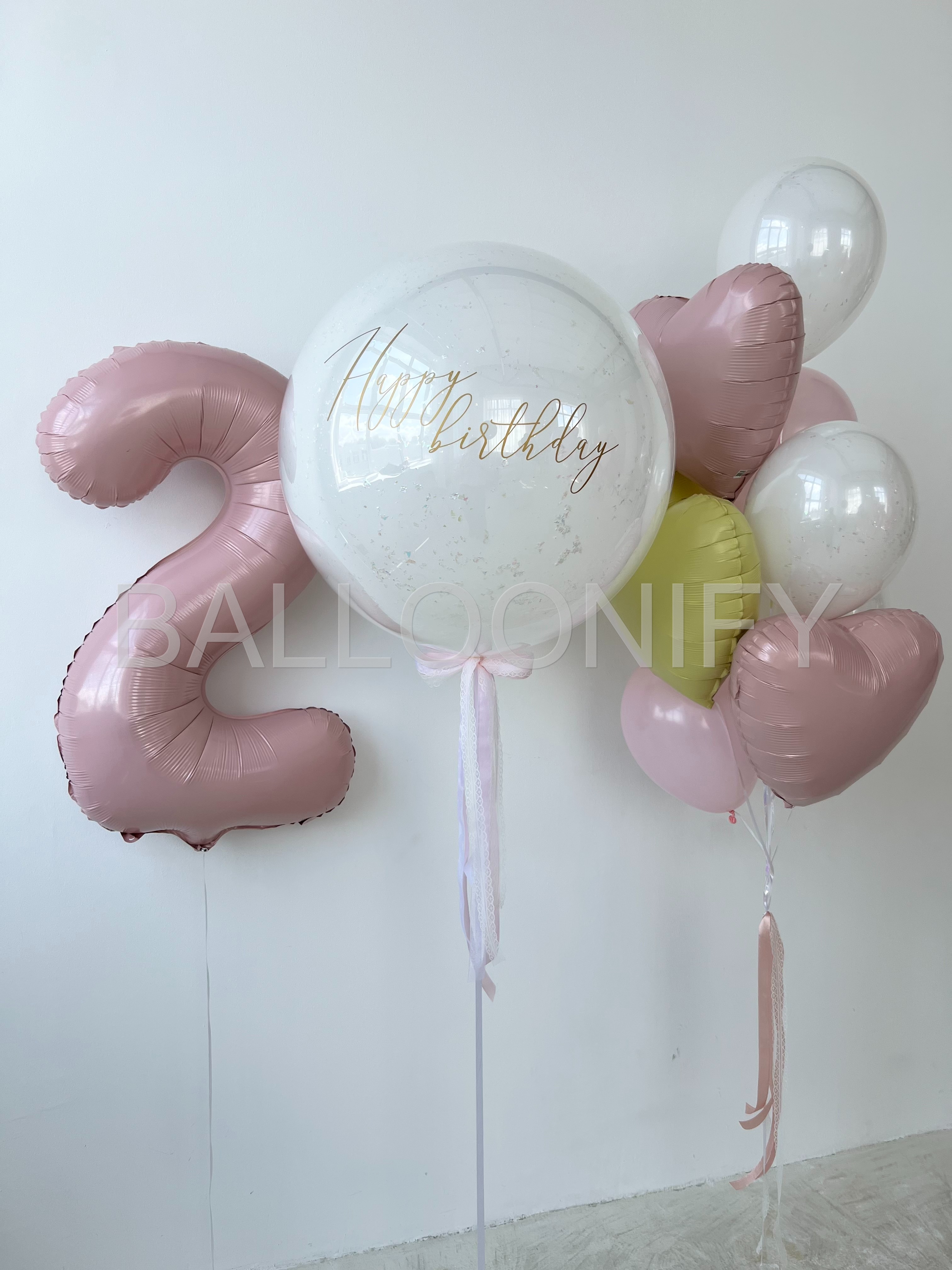 Элегантная композиция из воздушных шаров для празднования второго дня рождения: большой фольгированный шар в виде цифры «2» нежного розового оттенка, стеклянный шар с изысканной золотой надписью «Happy birthday», воздушные шары в форме сердечек (розовые, жёлтые) и классические белые шары. Нежная цветовая гамма и стильный дизайн создадут праздничную атмосферу и сделают день особенным. 🌟
