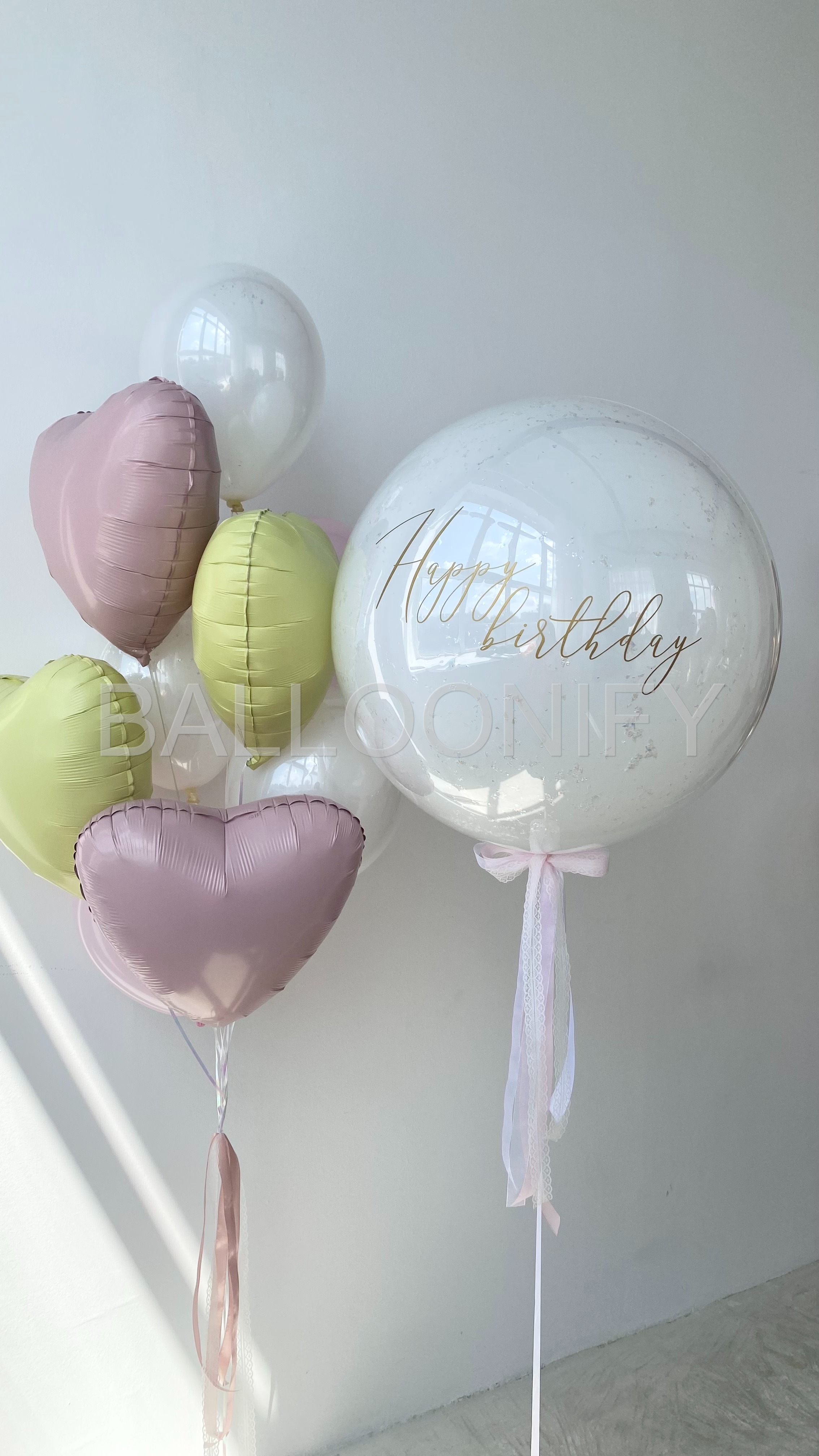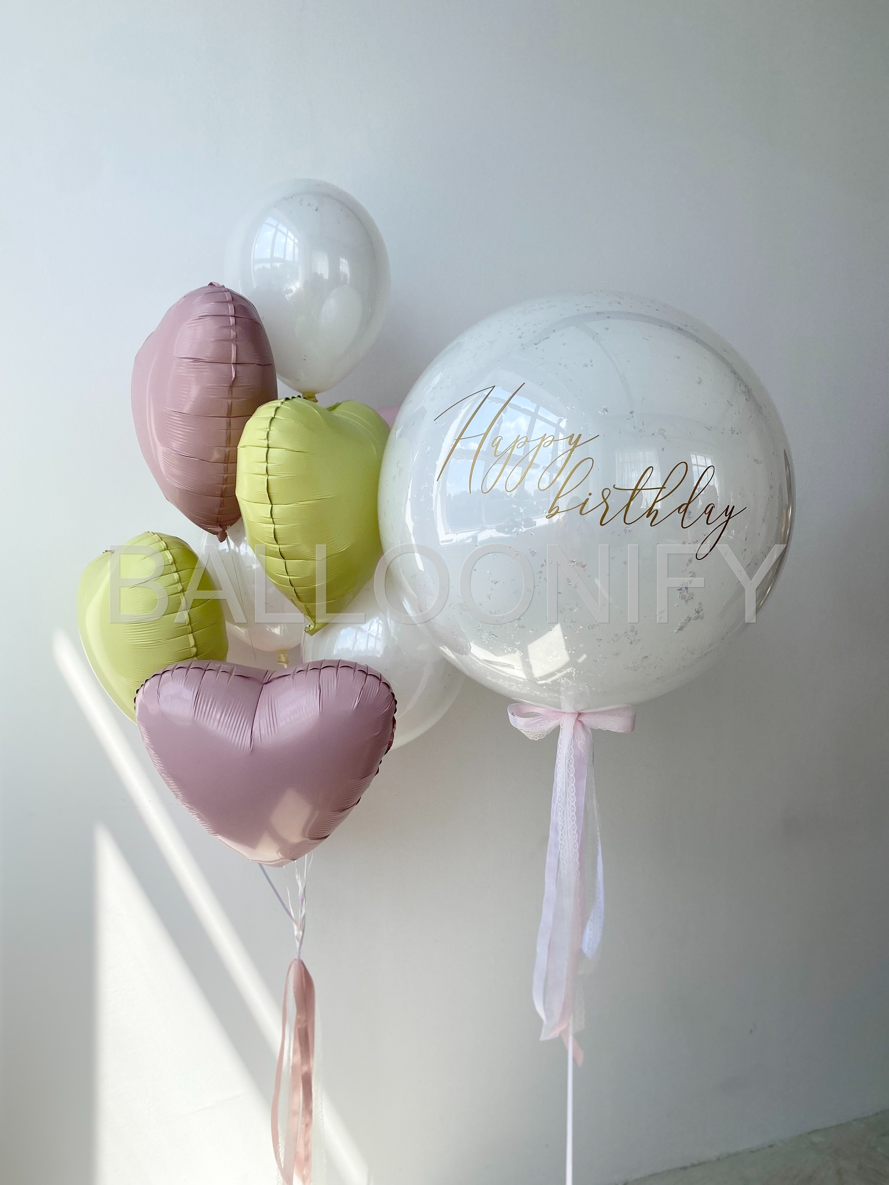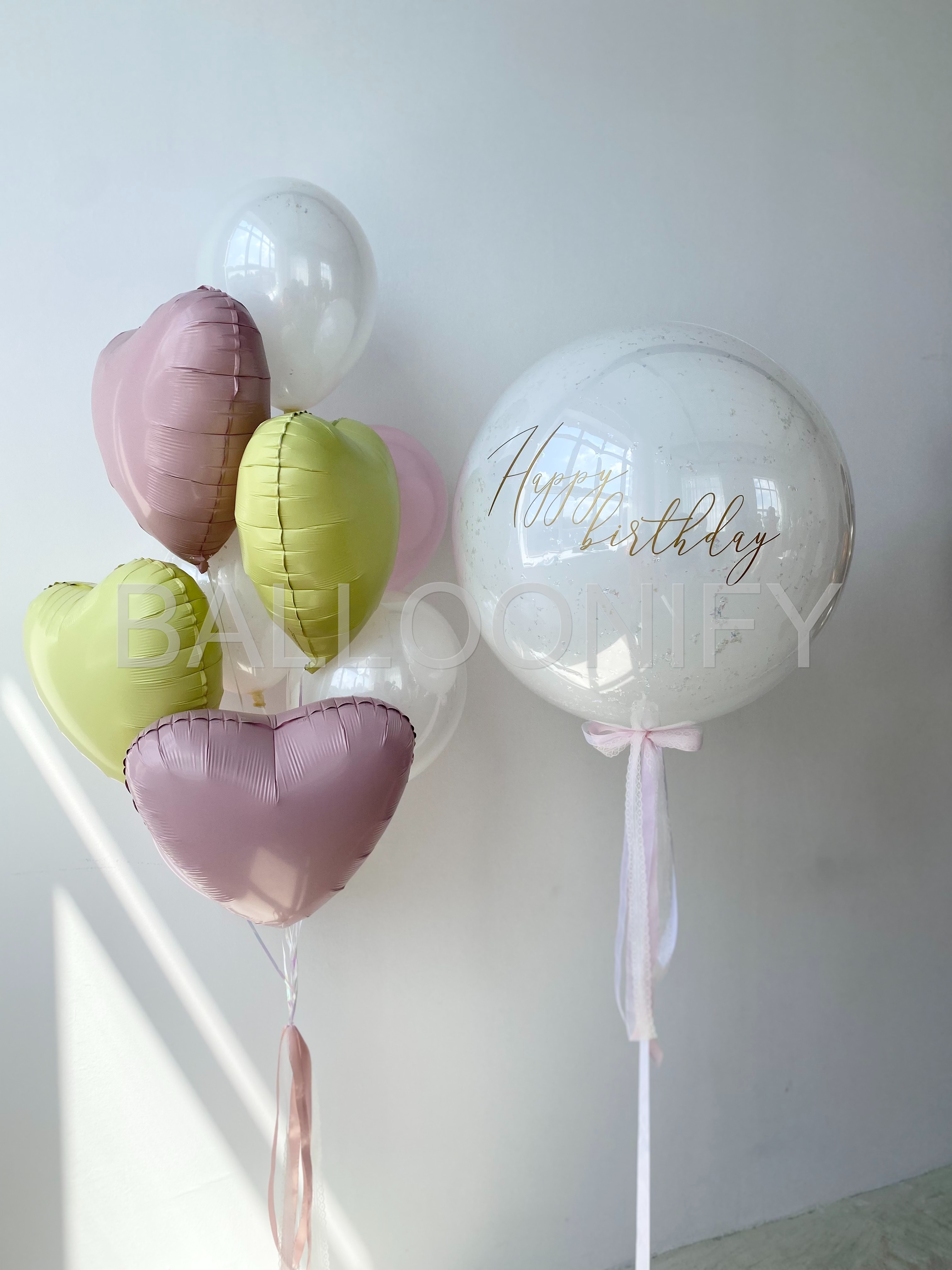Нежная композиция из воздушных шаров для дня рождения: крупный стеклянный шар с элегантной золотой надписью «Happy birthday», дополненный фольгированными шарами в форме сердечек пастельных оттенков — нежно-розового и светло-желтого, а также классическими белыми шарами. Лёгкие ленты придают ансамблю изысканность. Создаст тёплую и праздничную атмосферу в любом интерьере. 🌟
