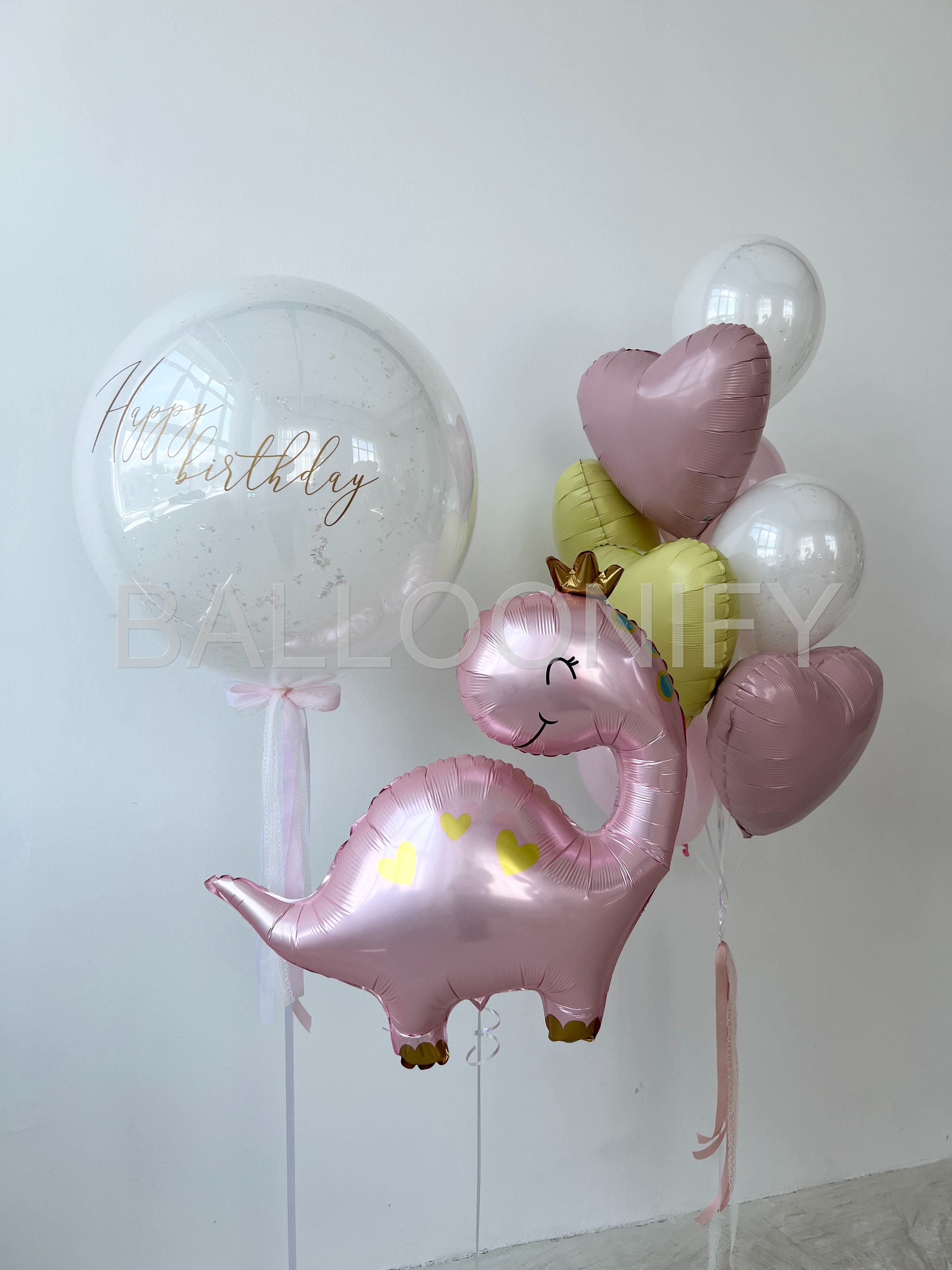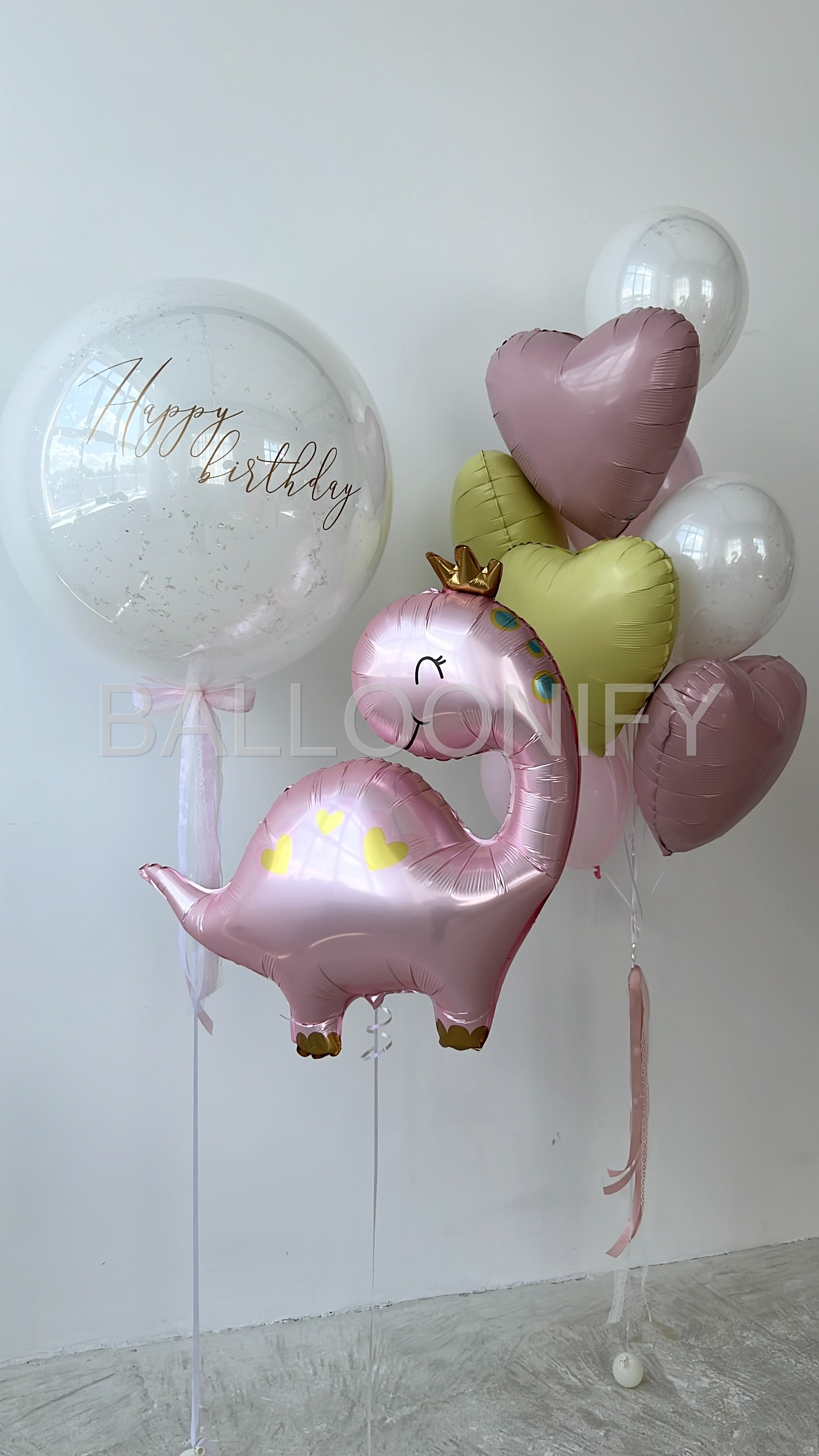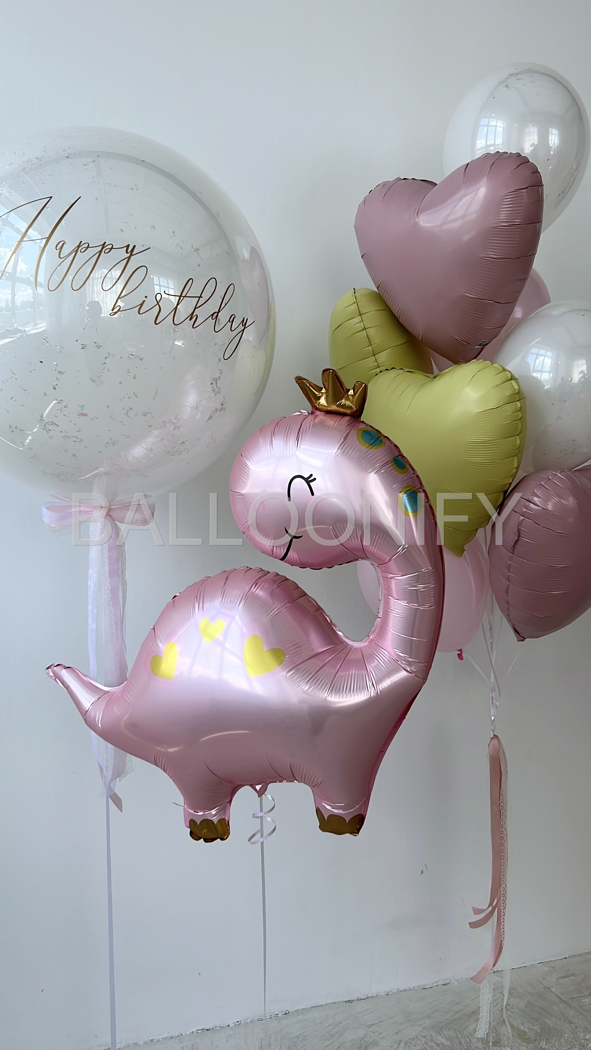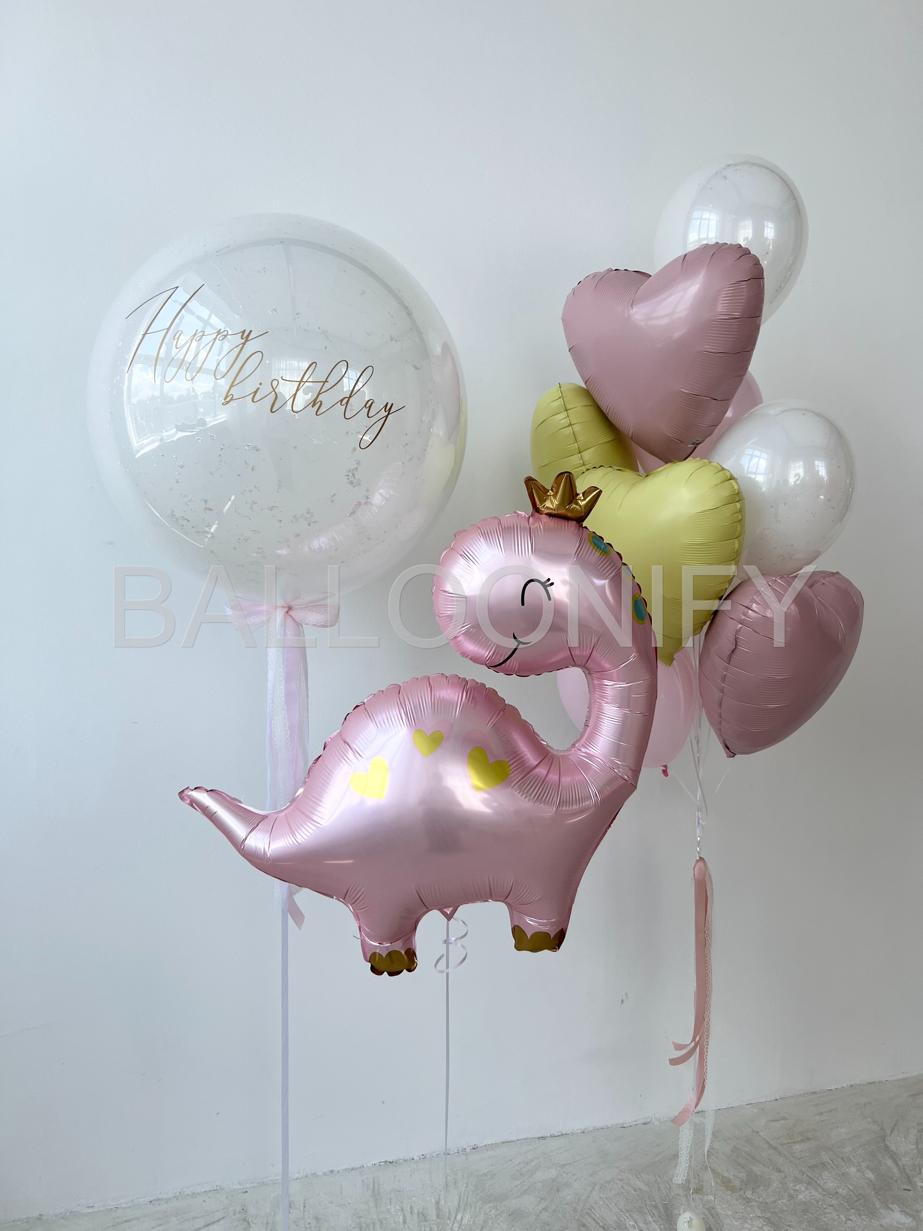 Нежная и весёлая композиция из воздушных шаров для детского праздника: очаровательный розовый динозавр с короной, украшенный жёлтыми сердечками, в окружении пастельных шаров — сердечек, круглых белых и жёлтых шаров. Центральным элементом служит большой стеклянный шар с элегантной золотой надписью «Happy birthday». Милый дизайн и мягкая цветовая гамма создадут волшебную атмосферу и подарят радость маленькой имениннице. 🌟