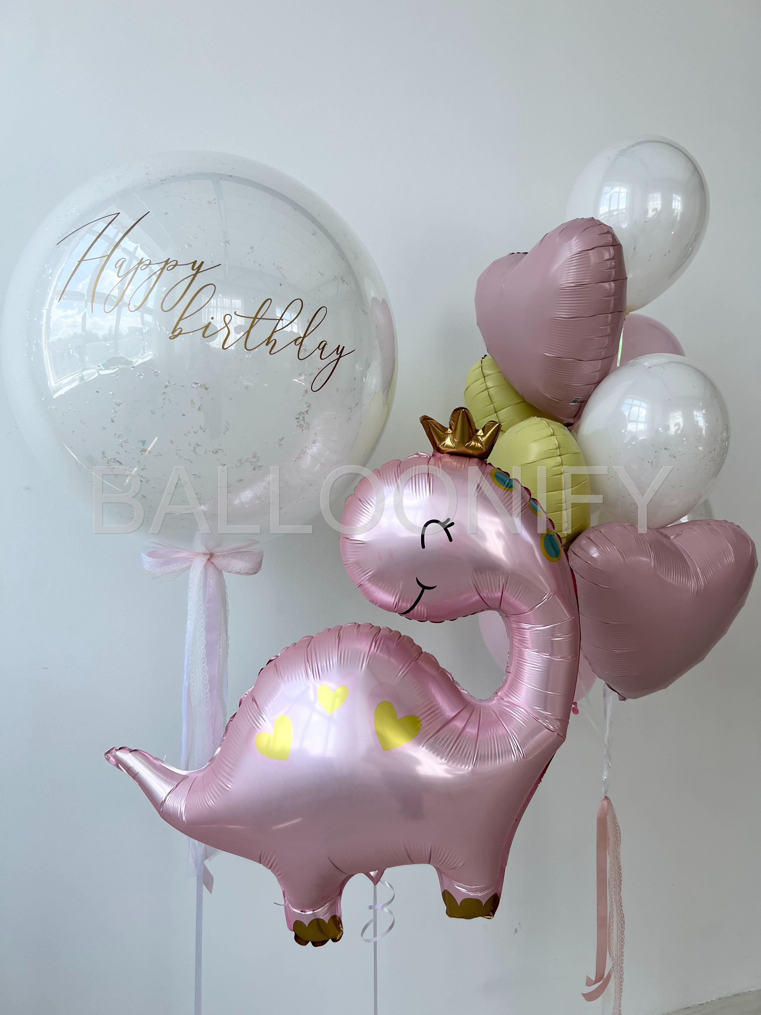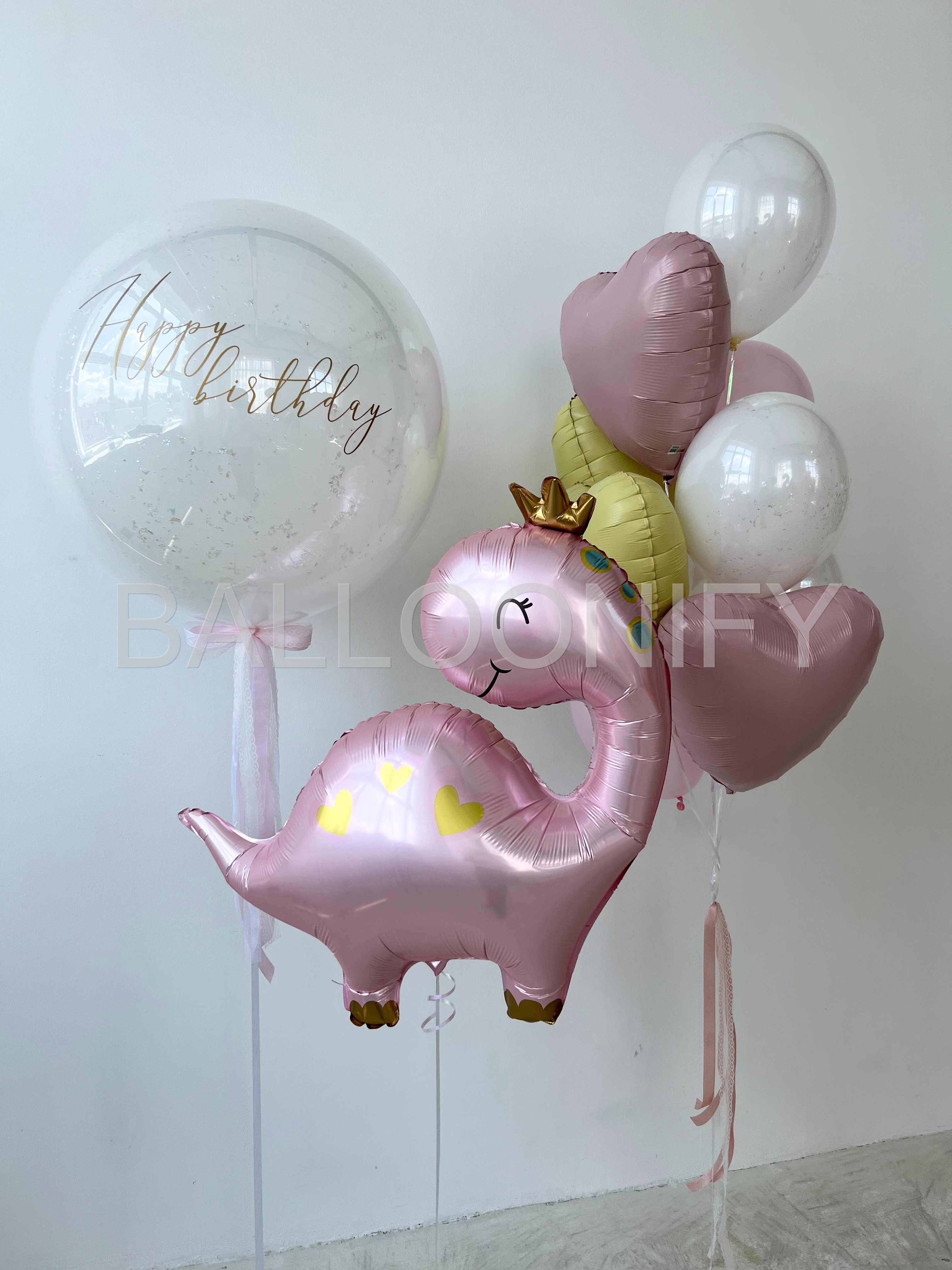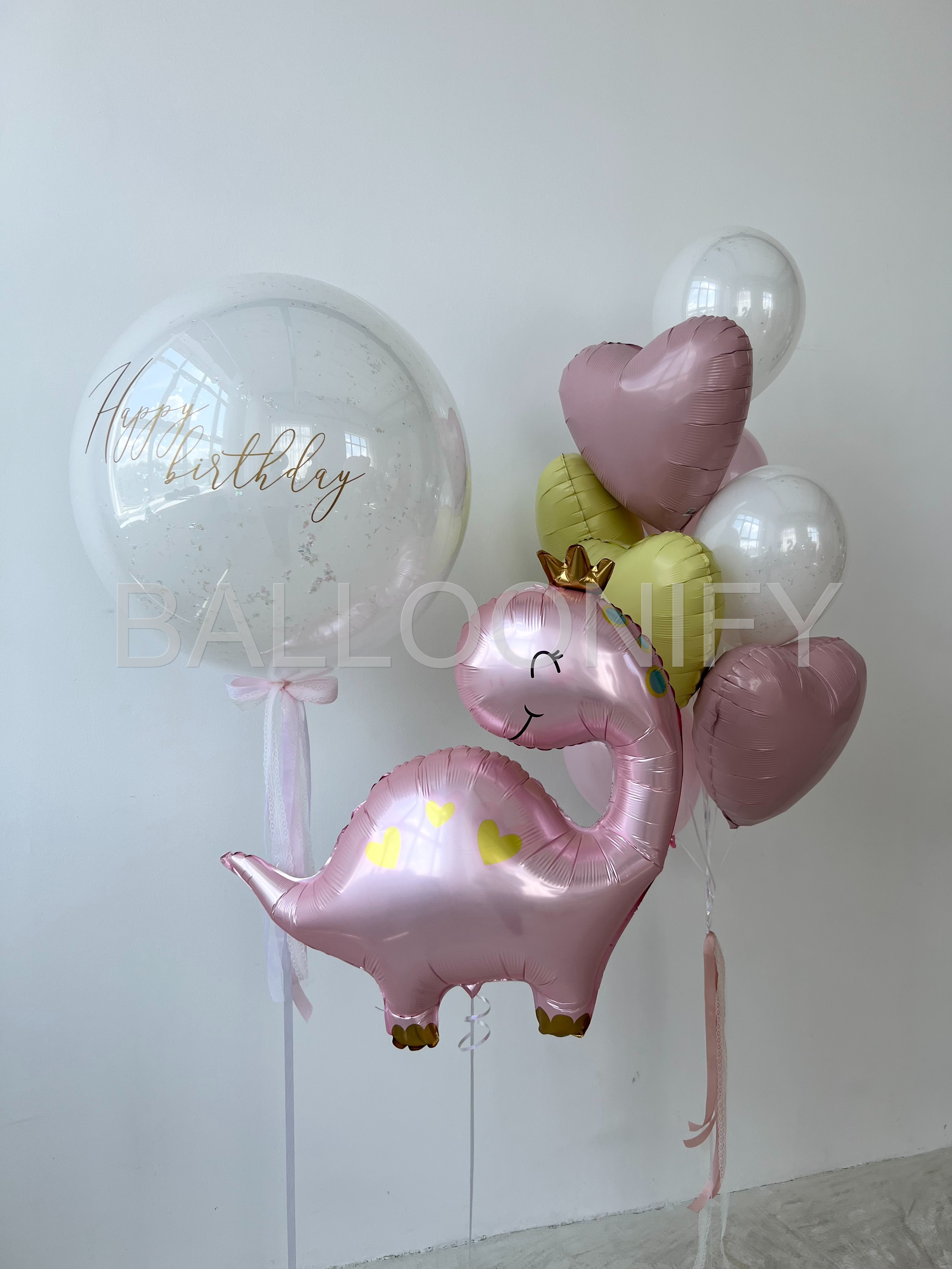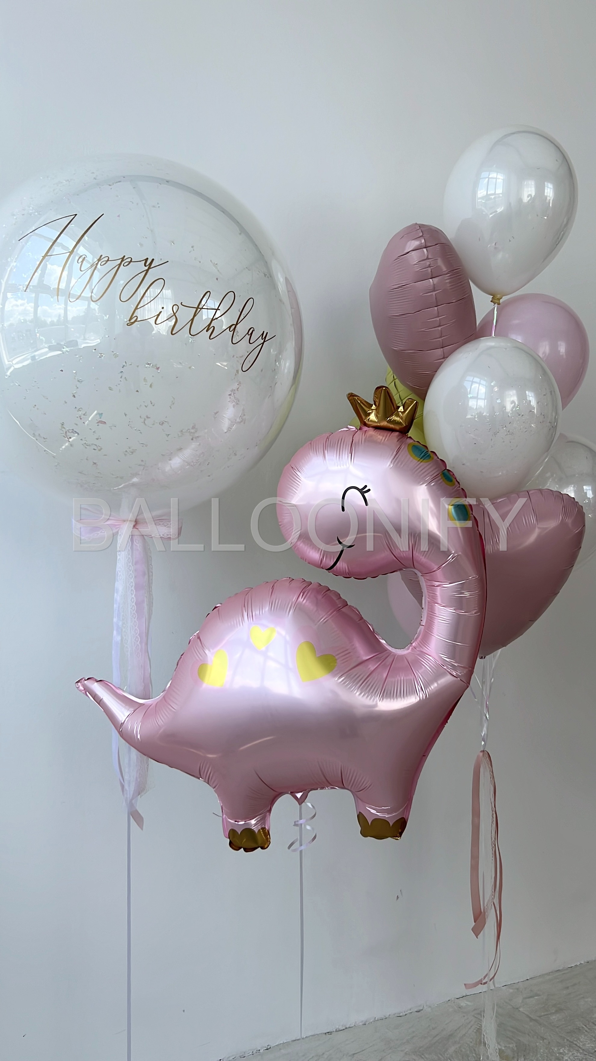 Нежная и весёлая композиция из воздушных шаров для детского праздника: очаровательный розовый динозавр с короной, украшенный жёлтыми сердечками, в окружении пастельных шаров — сердечек, круглых белых и жёлтых шаров. Центральным элементом служит большой стеклянный шар с элегантной золотой надписью «Happy birthday». Милый дизайн и мягкая цветовая гамма создадут волшебную атмосферу и подарят радость маленькой имениннице. 🌟