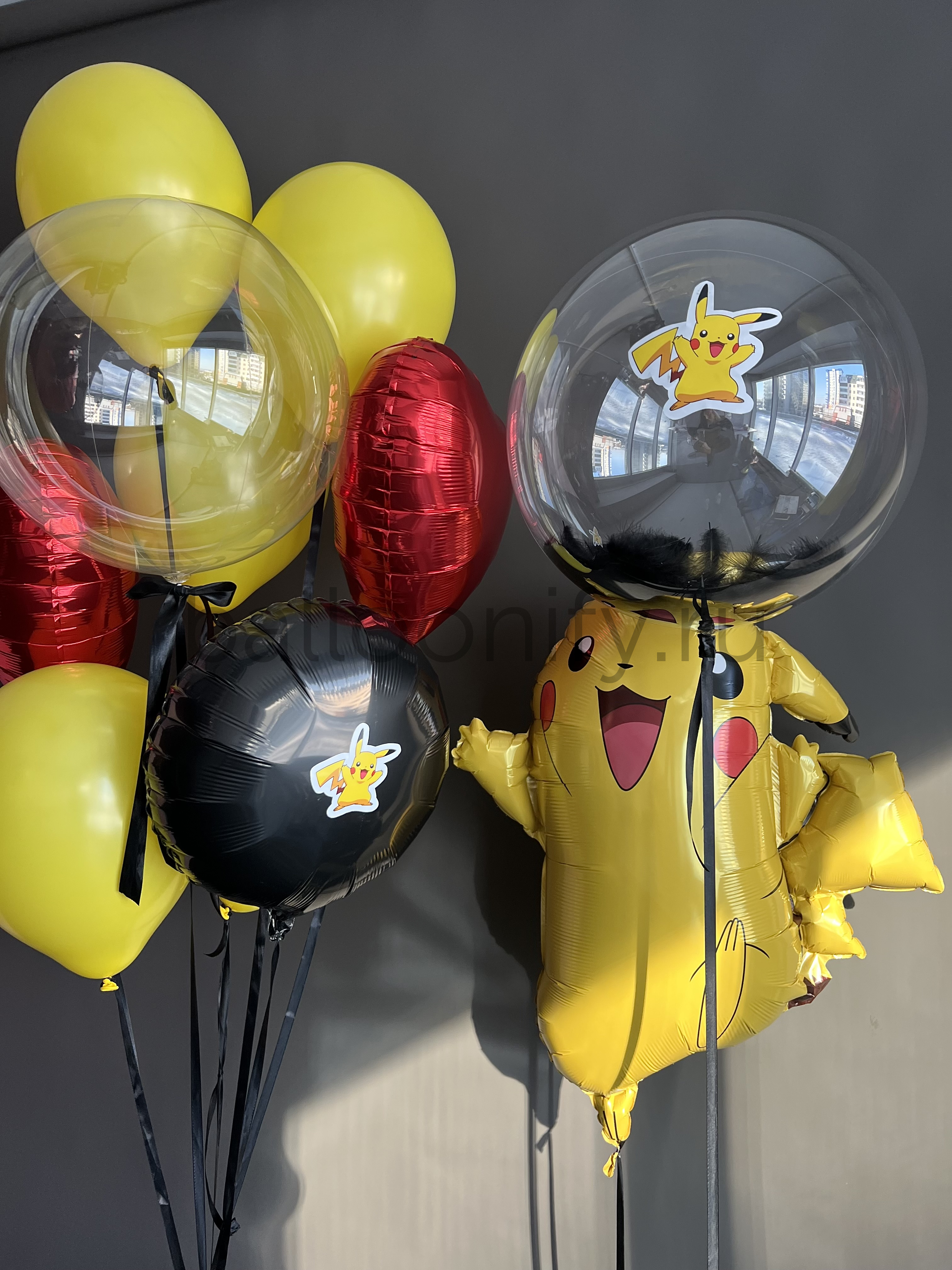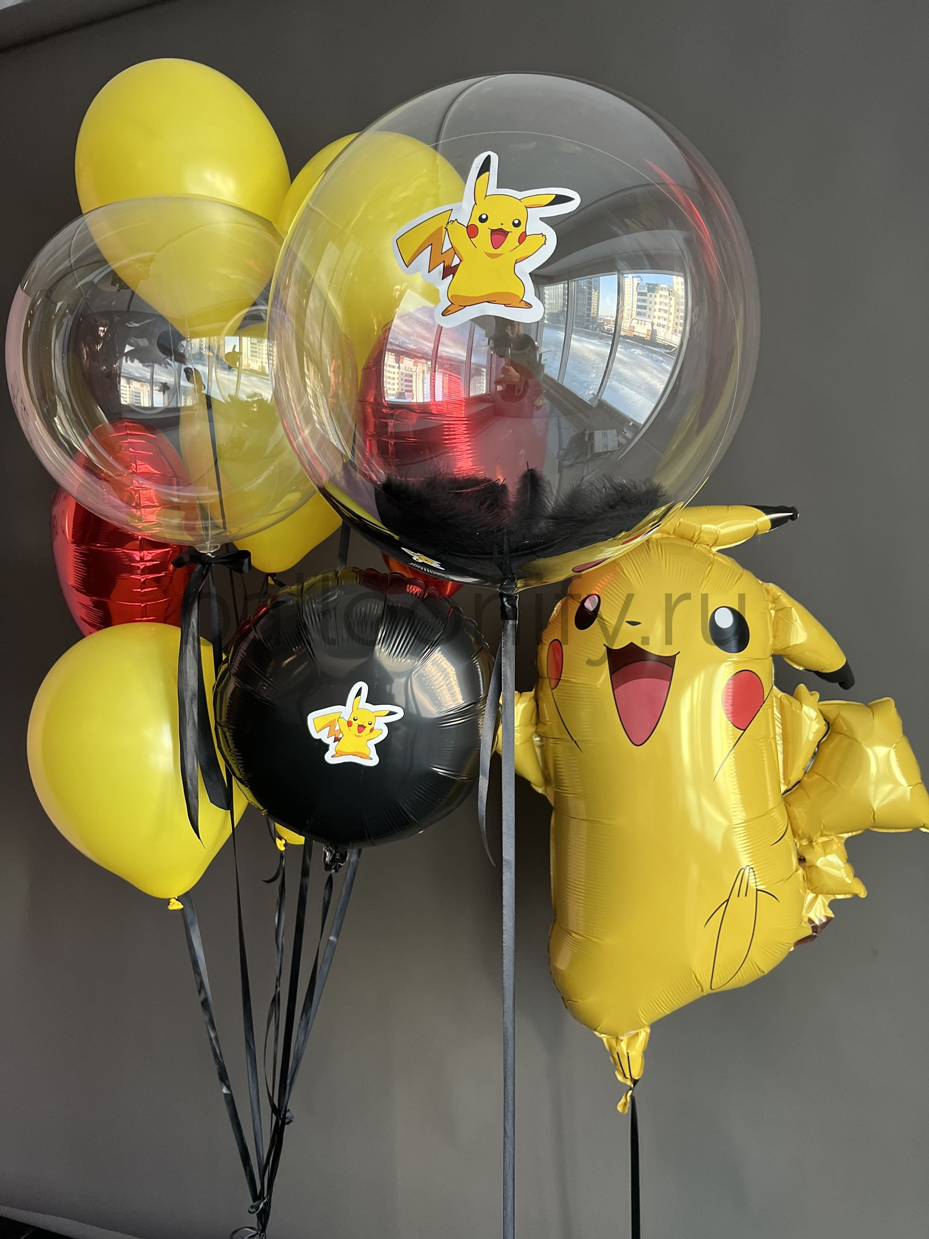 Яркая и весёлая композиция из воздушных шаров в стиле «Покемон»: в центре — большой фольгированный шар в виде улыбающегося Пикачу, который сразу привлекает внимание. Дополняют его прозрачные шары с наклейками Пикачу, красные фольгированные сердца, а также классические жёлтые и чёрные шары. Сочетание насыщенных цветов и любимых персонажей создаёт праздничную атмосферу — идеально для детского дня рождения или тематической вечеринки. 🌟