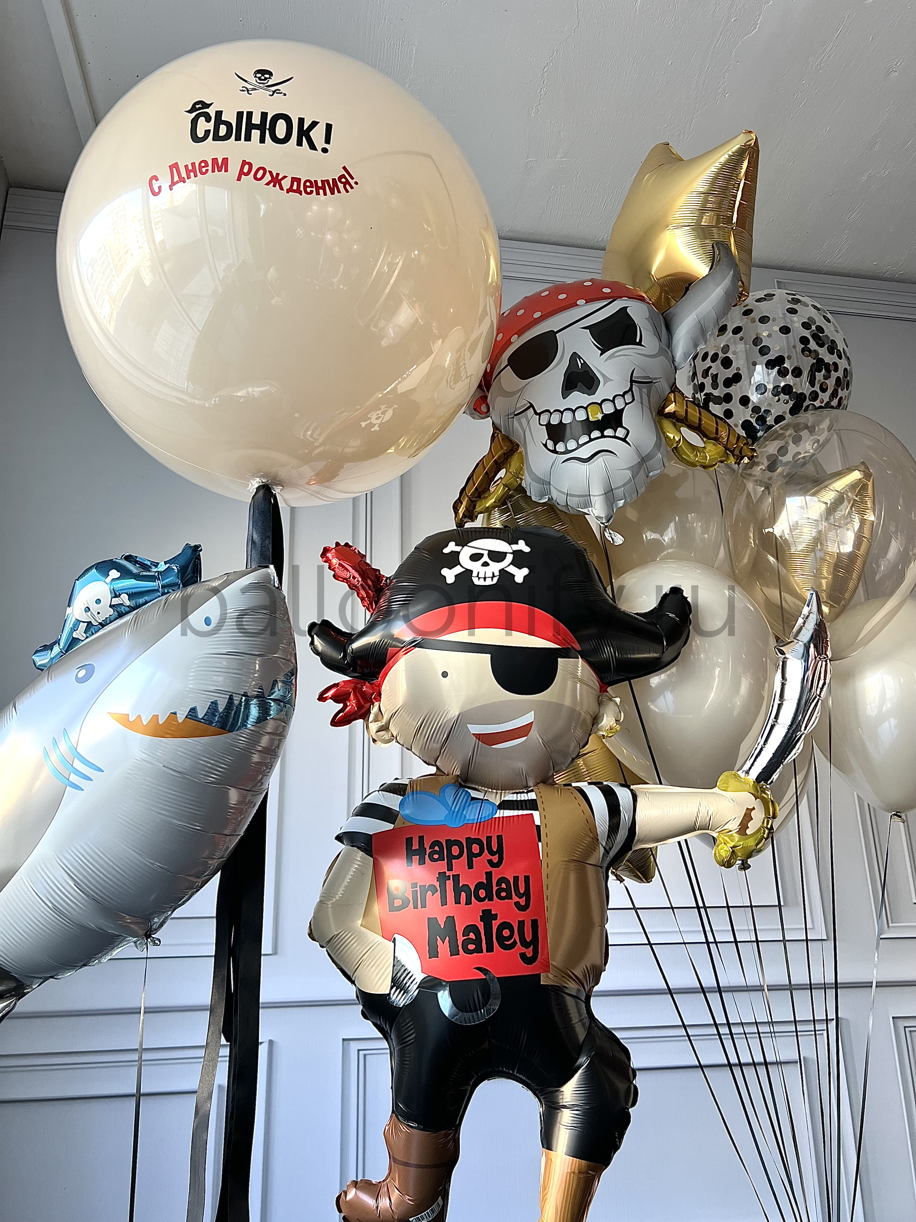 Яркая пиратская композиция из воздушных шаров для дня рождения: в центре — большой фольгированный шар в виде весёлого пирата с саблей и табличкой «Happy Birthday Maley». Дополняют его огромный светлый шар с надписью «Сынок! С Днём рождения!» и символом черепа с костями, фольгированная акула с пиратской шляпой, шар в виде черепа в красной бандане, а также золотые и прозрачные шары. Сочетание насыщенных цветов, тематических фигур и озорных деталей создаёт атмосферу настоящего пиратского приключения — идеально для детского праздника! 🌟